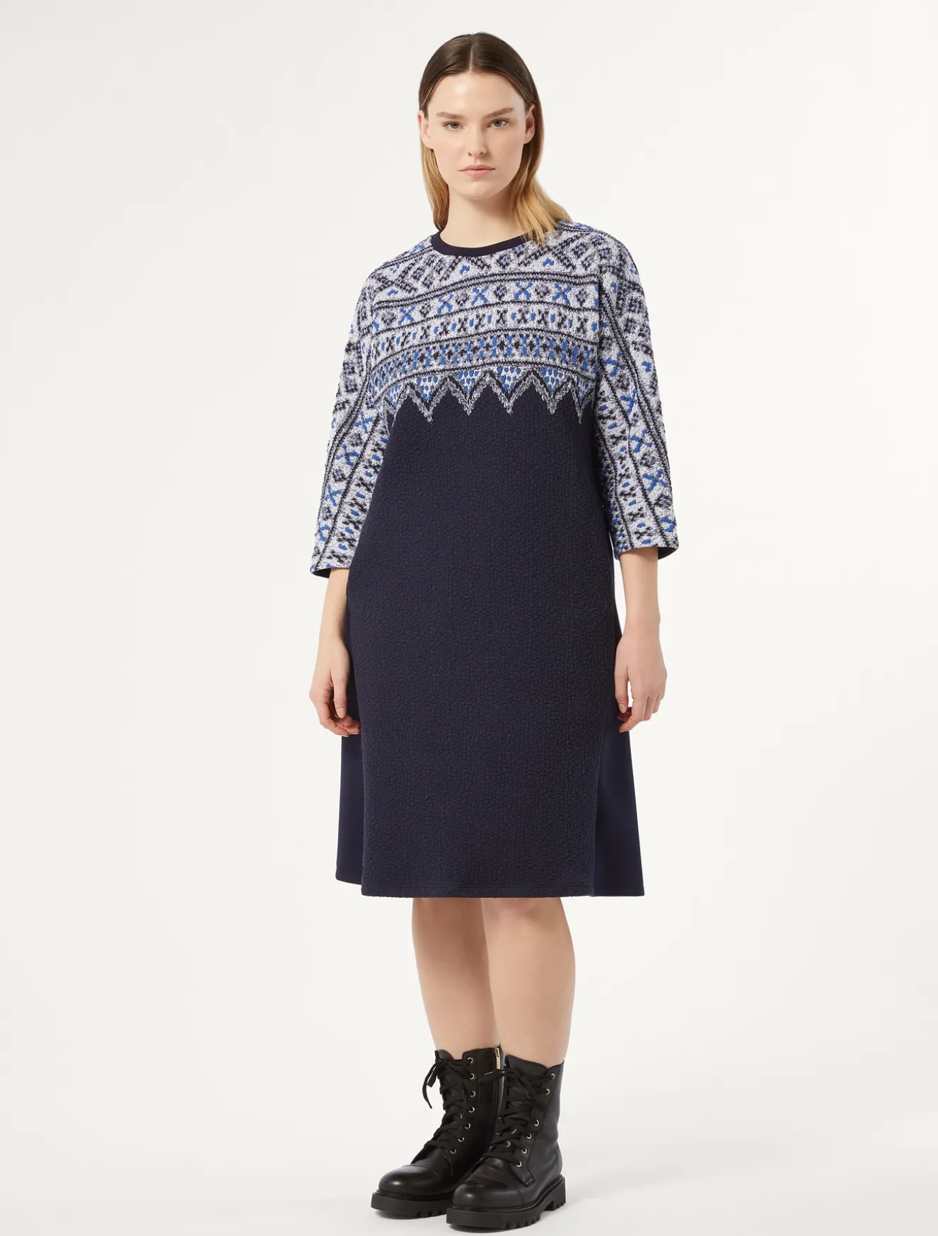 Lavorazione esclusiva per l’abito in jersey scuba di misto viscosa stretch con inserto davanti in jersey matelassé con disegni d’ispirazione nordica piazzati. Perfetto per essere subito pronta.Il capo fa parte della collezione Marina Sport.