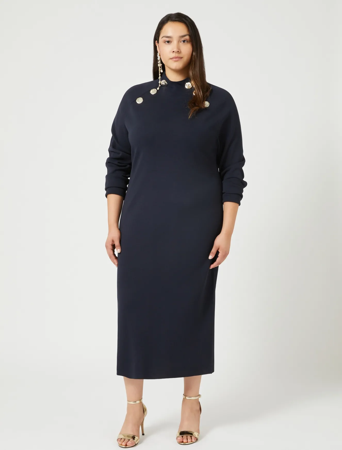 L’abito femminile in maglia è costruito con linea semiaderente e bottoni in metallo color oro. Un modello passe-partout da indossare tutti i giorni e nelle occasioni speciali.Il capo fa parte della main collection Marina Rinaldi.