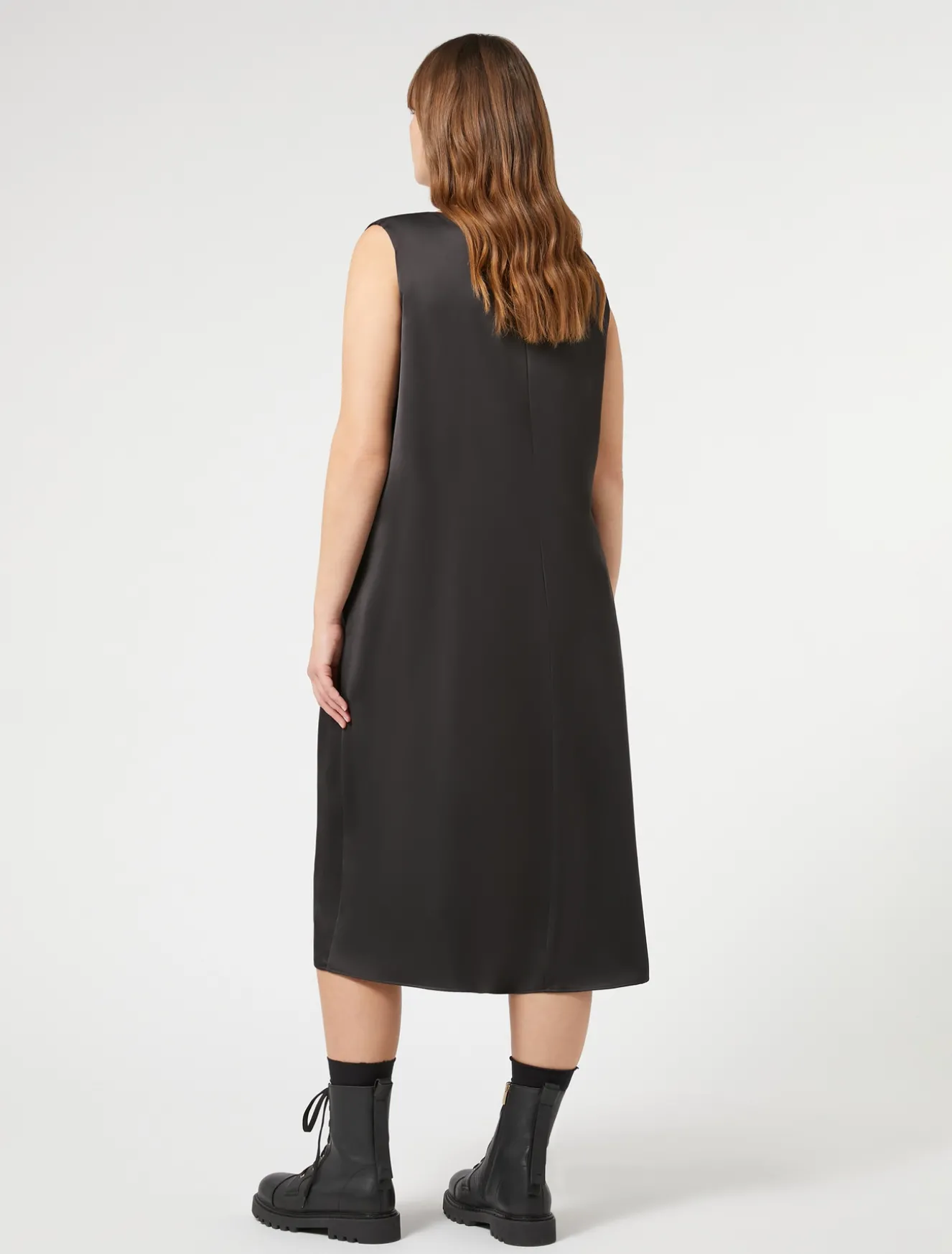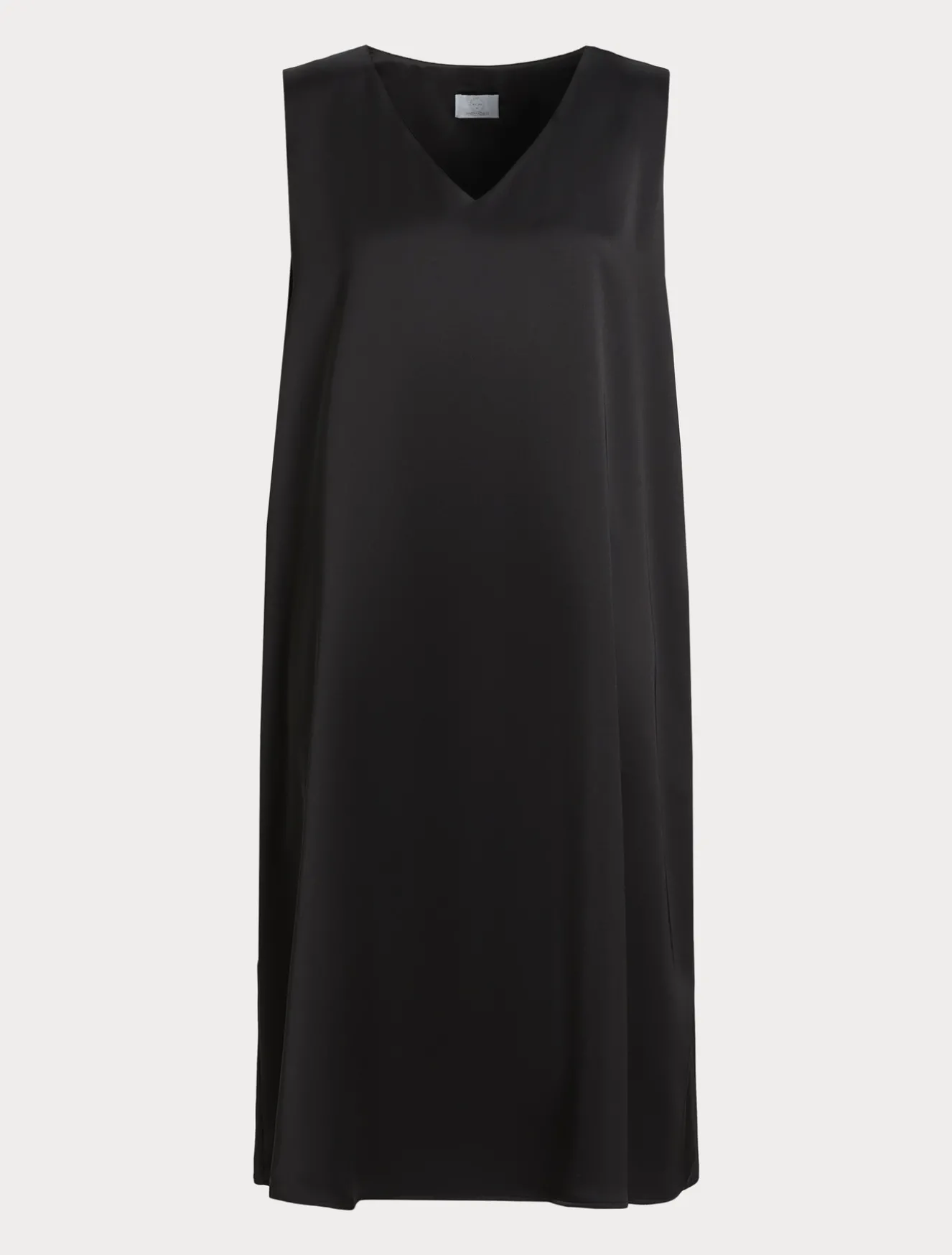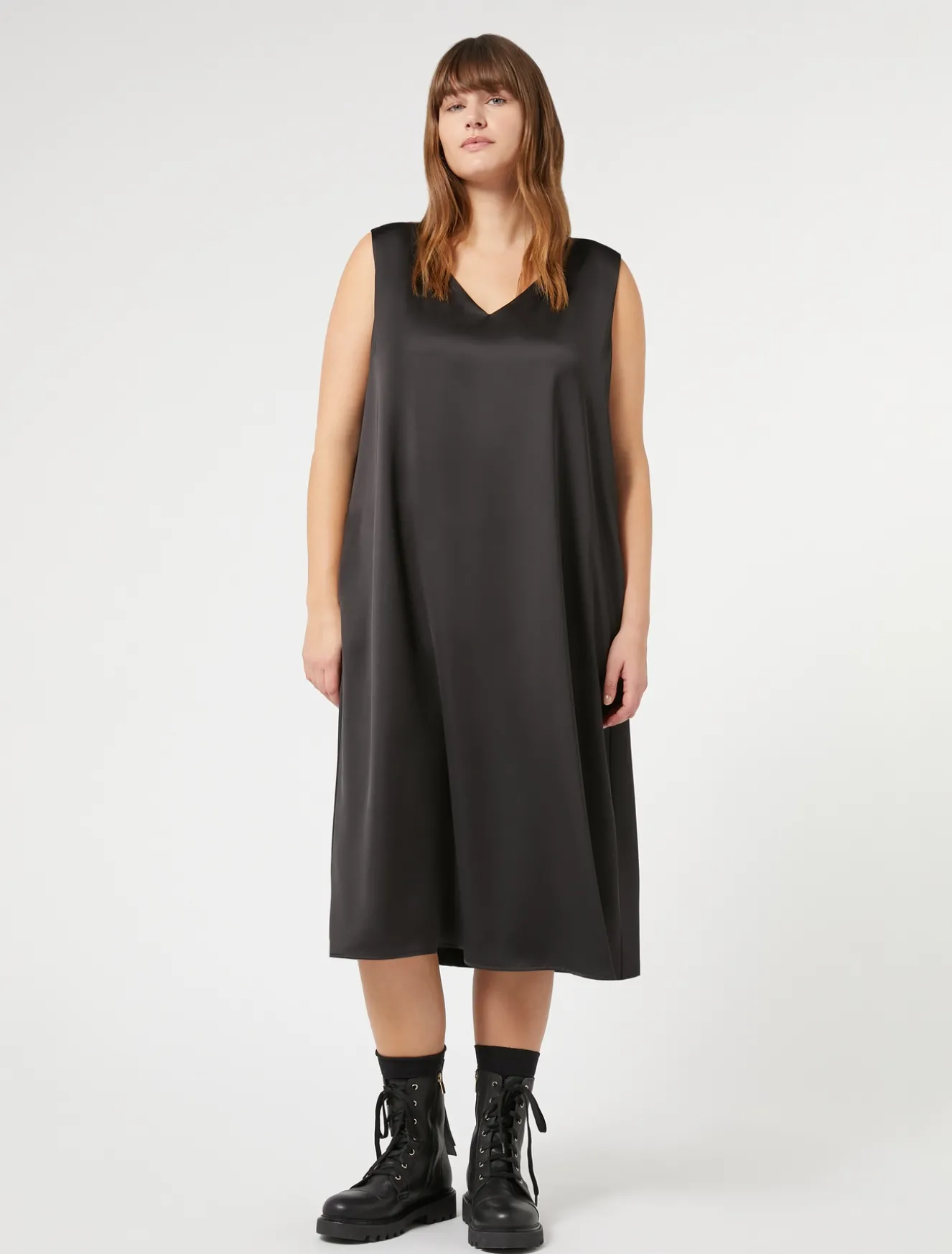 Appeal senza tempo per l’abito in raso fluido, dalla linea svasata. Un modello dall’eleganza rilassata, a cui puoi applicare le maniche con un intervento di sartoria dedicato. Il capo fa parte della main collection Marina Rinaldi.