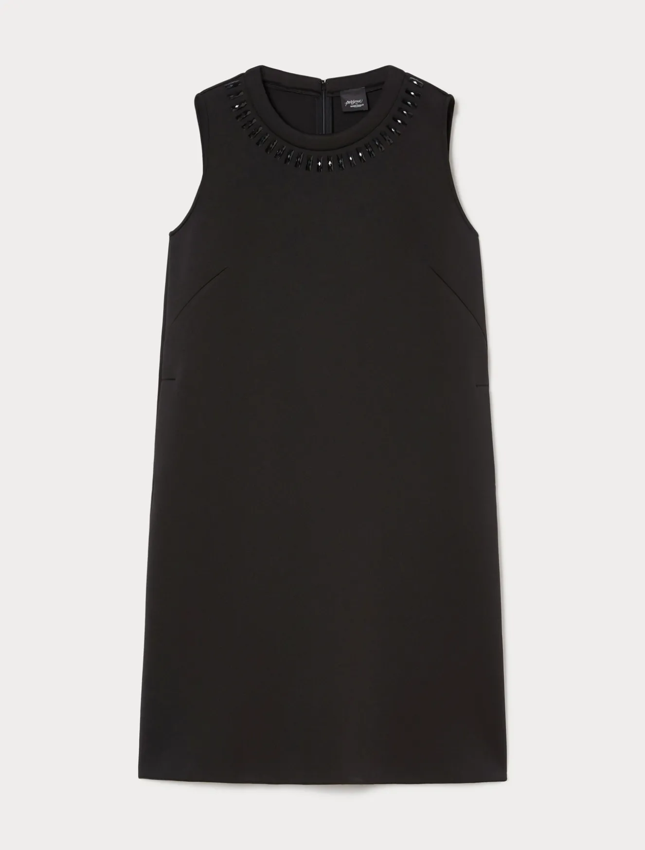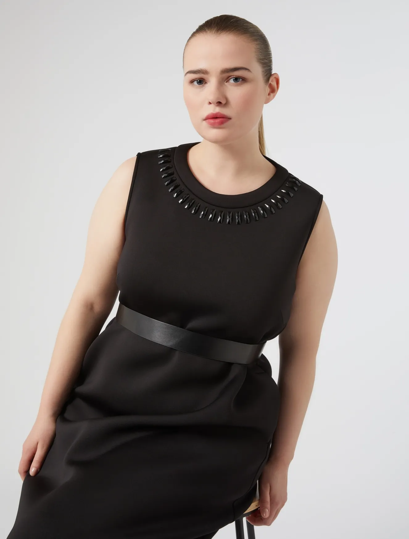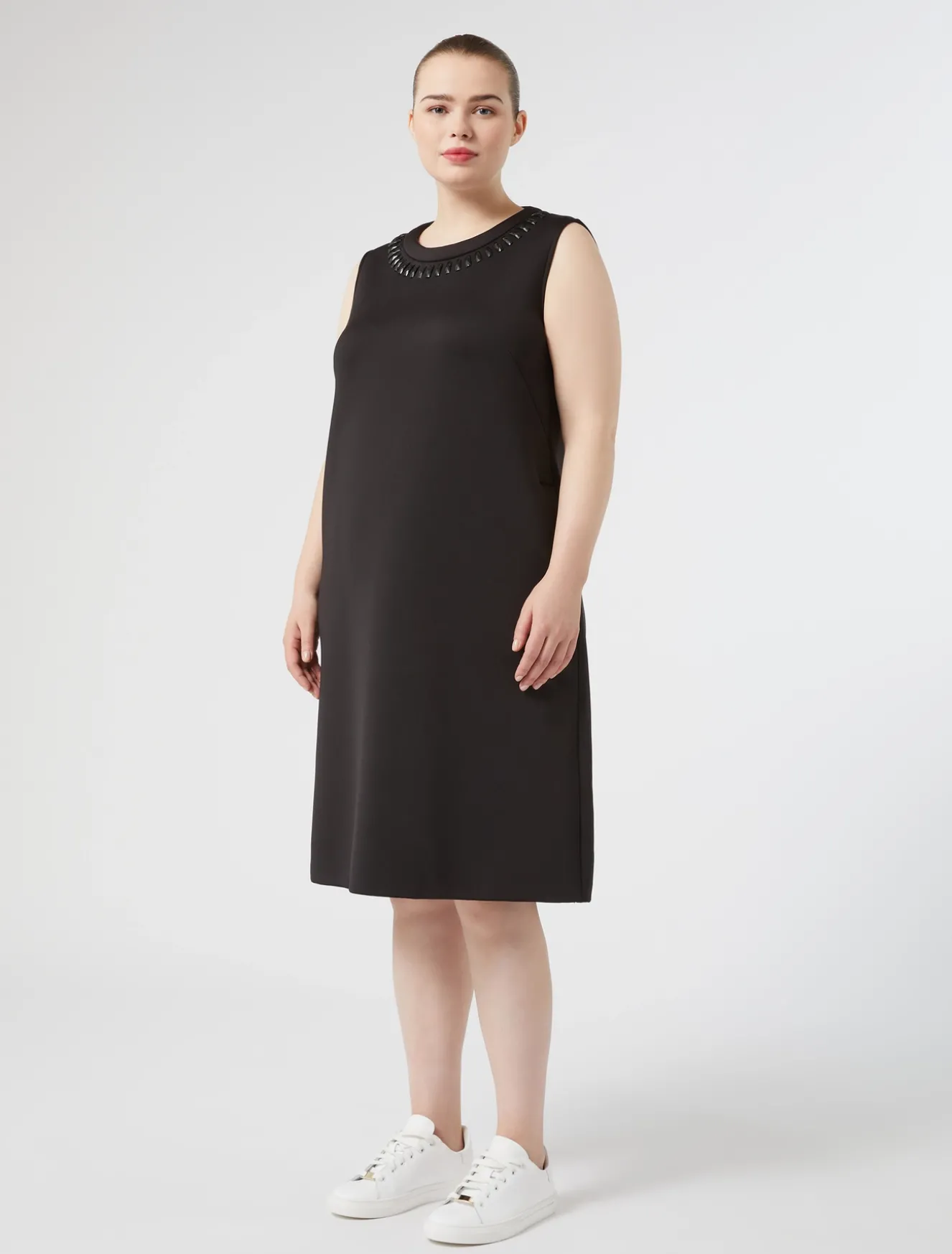 Confortevole e glamour l’abito in scuba leggero con ricami termoadesivi. Puoi applicare al modello le maniche corte con un semplice intervento di sartoria dedicato.