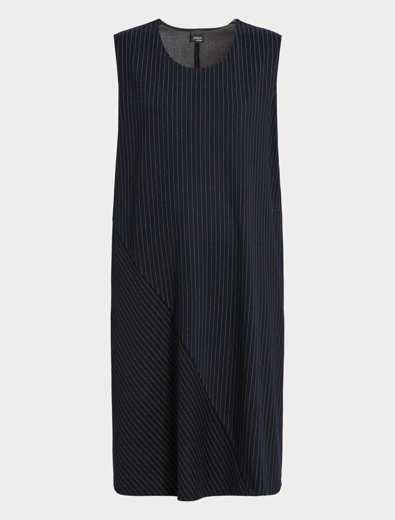Easy da indossare, l’abito in tessuto rifinito a punto Milano ha motivi gessati con applicazione asimmetrica al fondo. Evergreen di stagione in layering con t-shirt e camicie.Il capo fa parte della collezione Persona by Marina Rinaldi.
