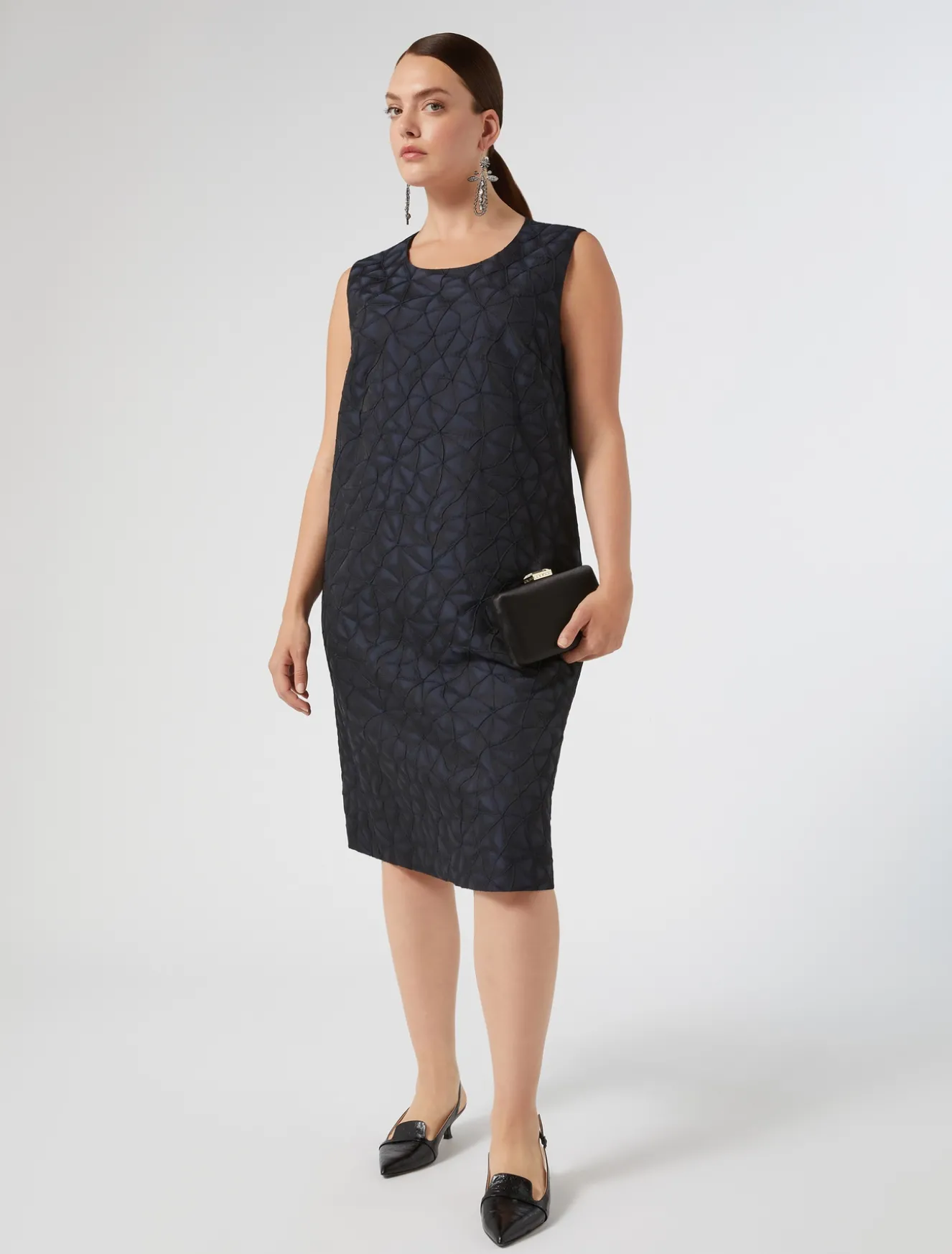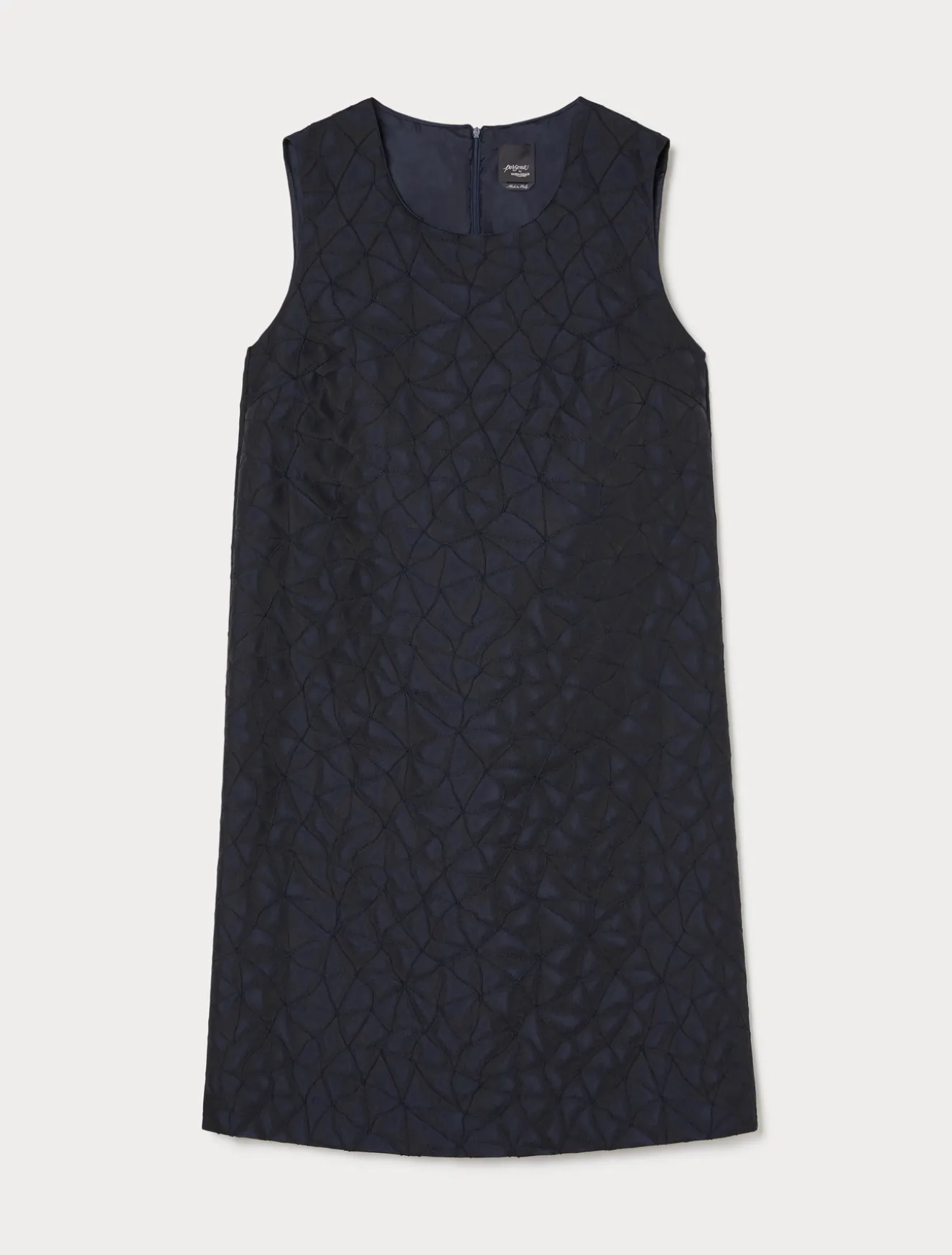 Essenziale e chic l’abito jacquard, dalla linea svasata. Puoi applicare le maniche in dotazione con un semplice intervento di sartoria dedicato.