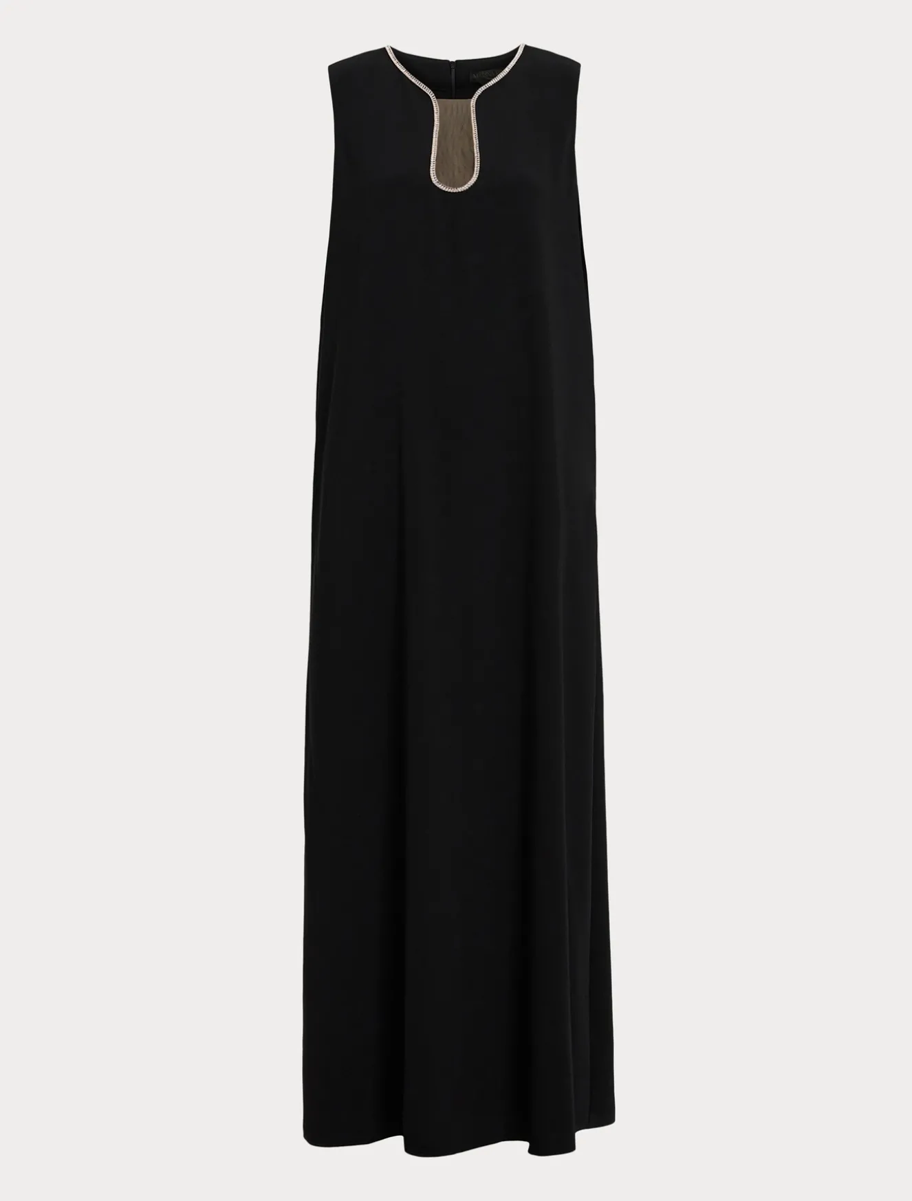 L’abito lungo in cady triacetato comfort esibisce una scollatura rifinita da catena di strass. Il tessuto ha una mano fluida, contemporanea e versatile, di facile manutenzione e che non si stropiccia. L’abito viene consegnato con maniche lunghe che possono essere applicate con un intervento di sartoria dedicato.Il capo fa parte della collezione Elegante.