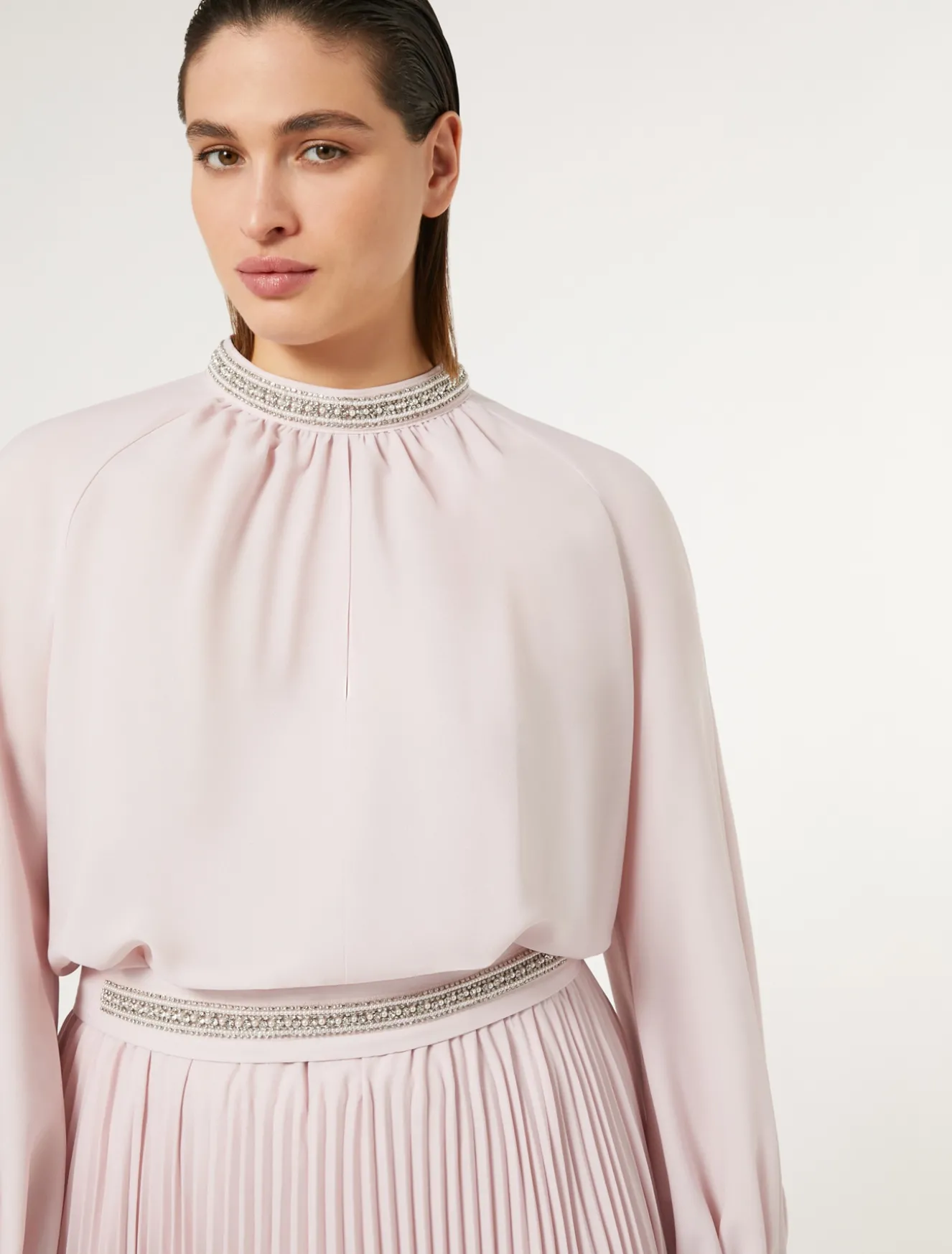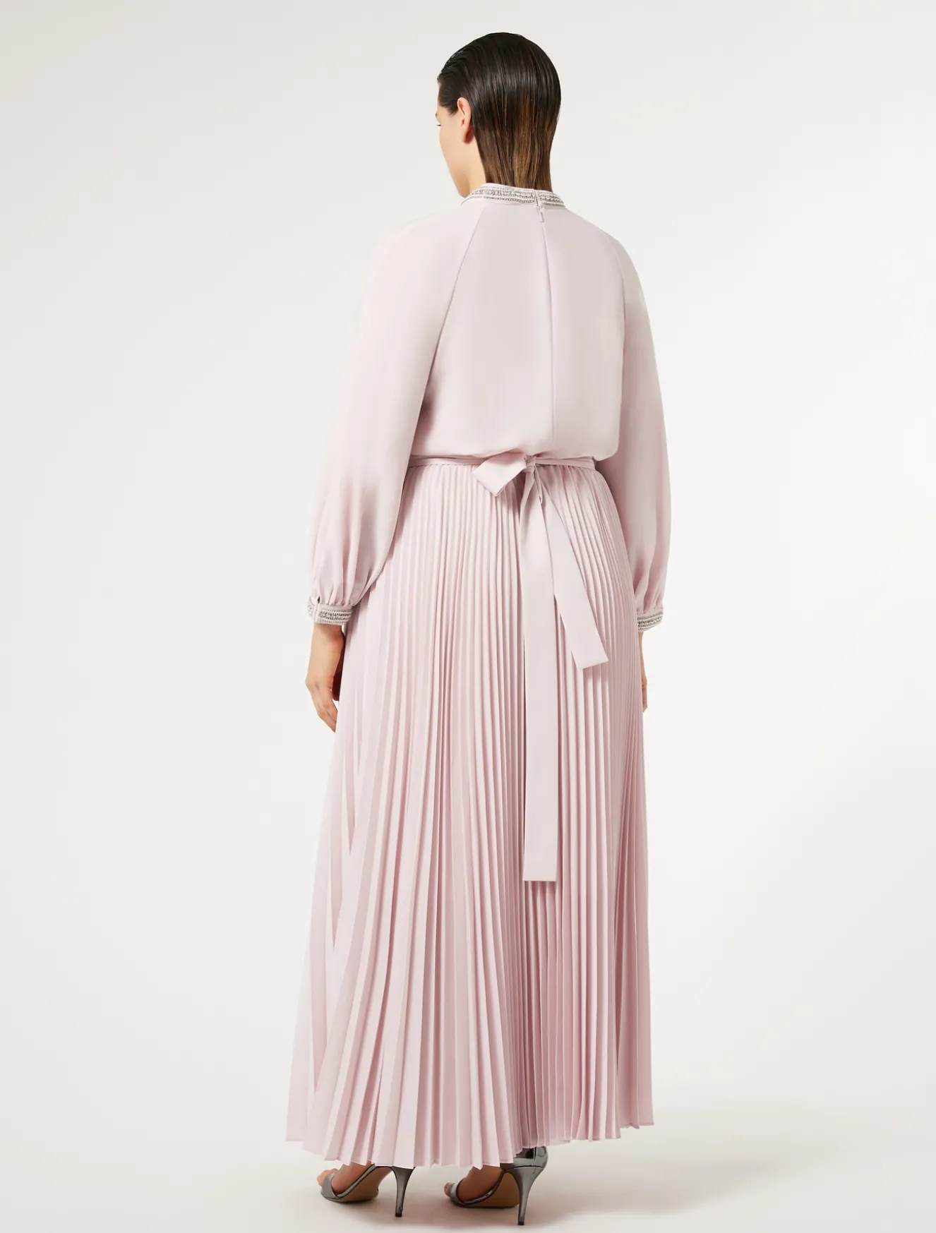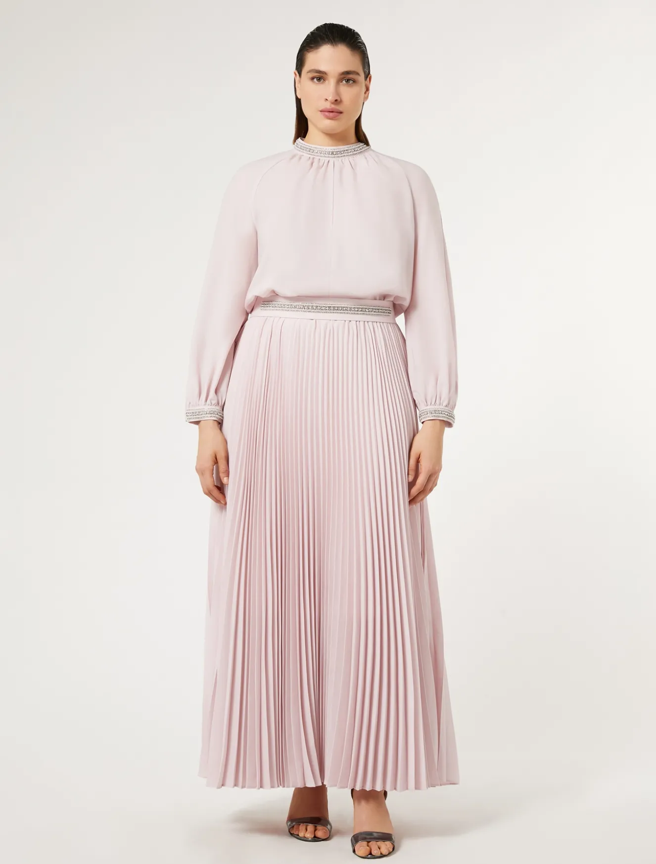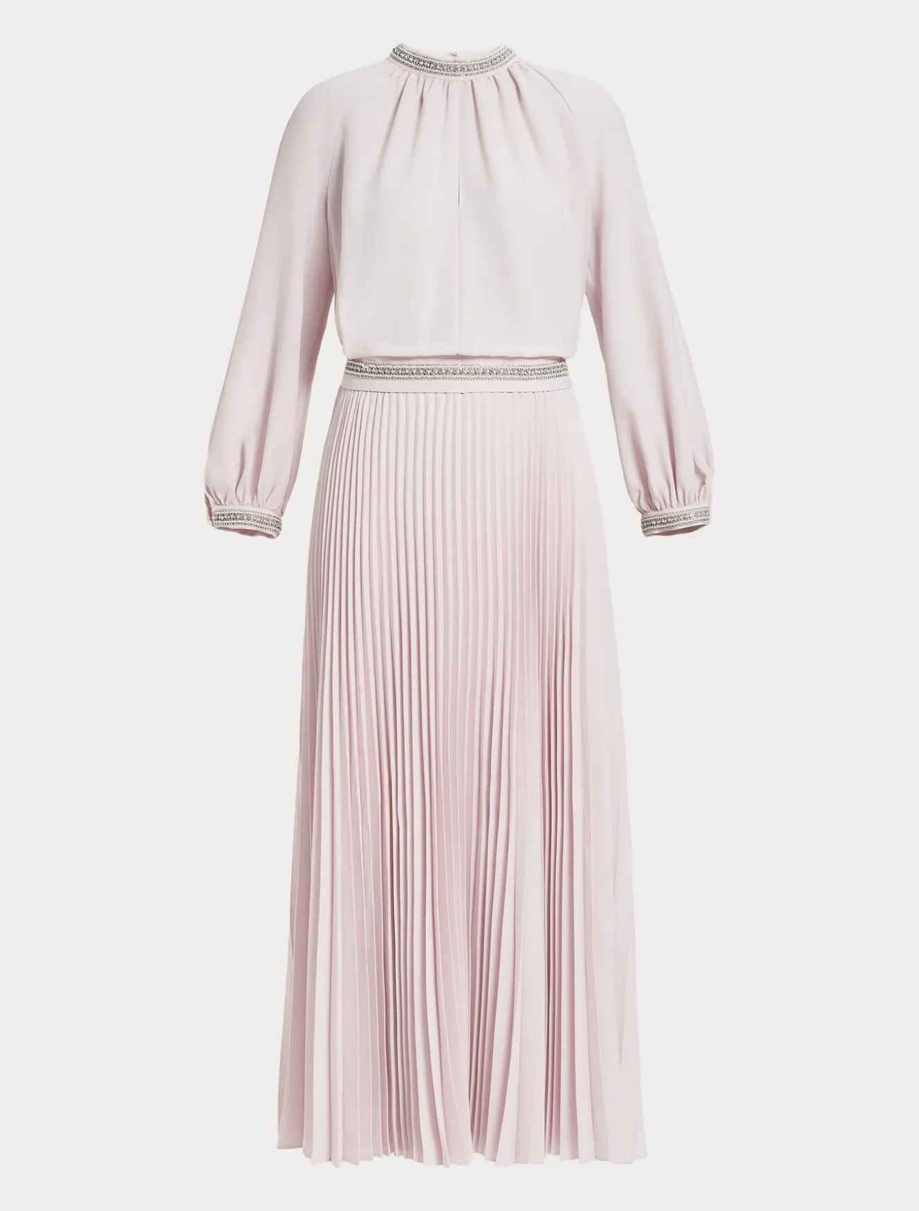 Una passamaneria ricamata a mano di perle e strass al collo e ai polsi rende unico l’abito lungo in crêpe leggero con gonna lavorata a plissé soleil. Linea femminile con taglio in vita ed elastico per un fit perfetto.Il capo fa parte della main collection Marina Rinaldi.