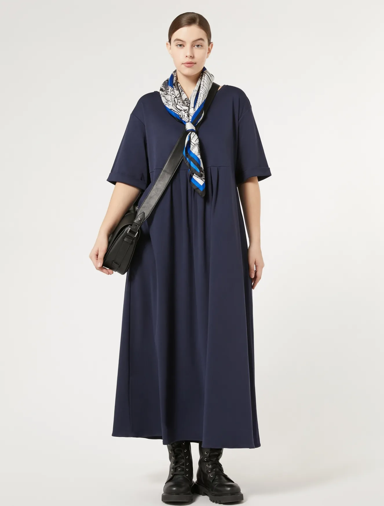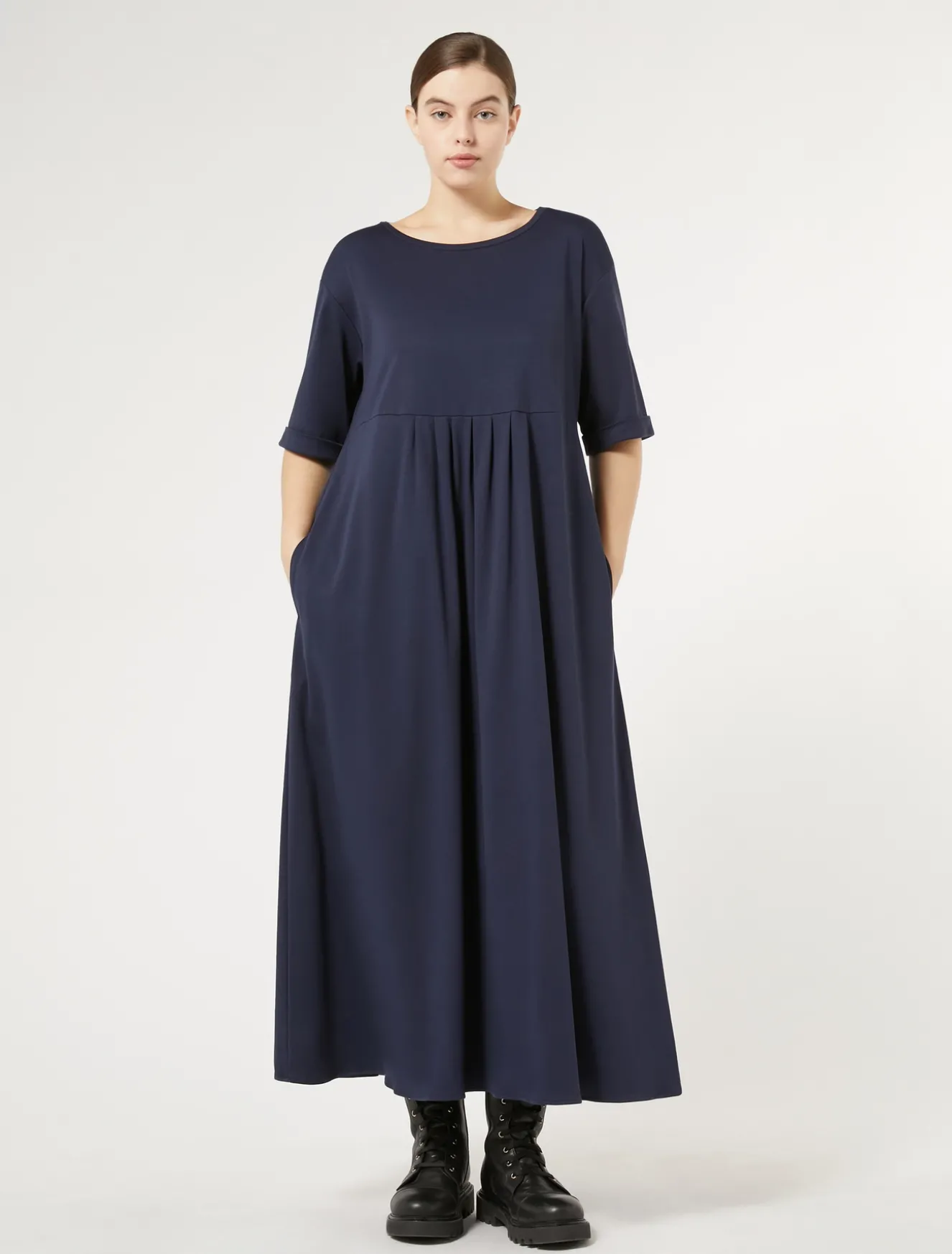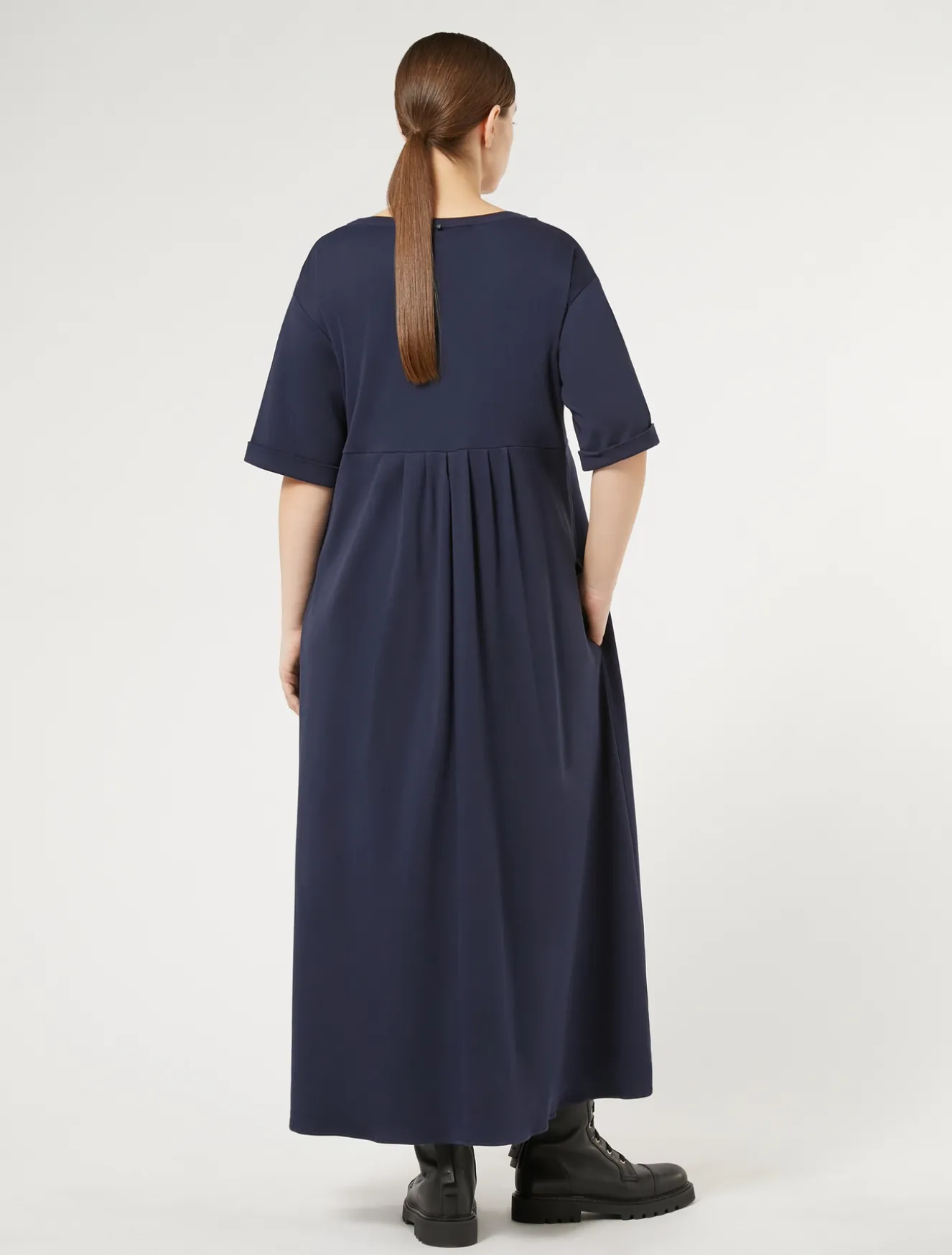 È costruito con taglio a impero, contropieghe e pieghe arricciate l’abito lungo in jersey interlock. Linea femminile da indossare nei momenti casual.Il capo fa parte della collezione Marina Sport.