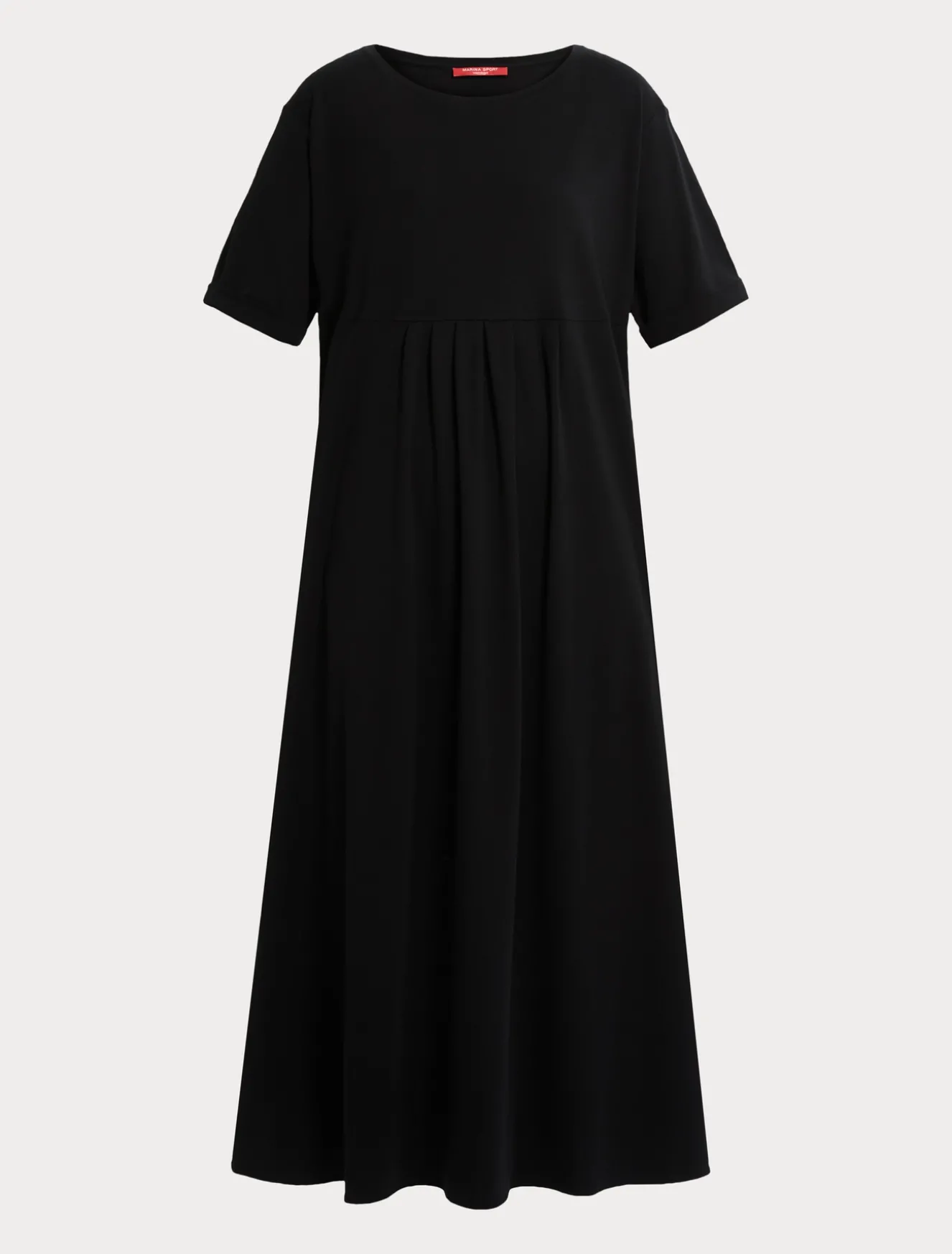 È costruito con taglio a impero, contropieghe e pieghe arricciate l’abito lungo in jersey interlock. Linea femminile da indossare nei momenti casual.Il capo fa parte della collezione Marina Sport.