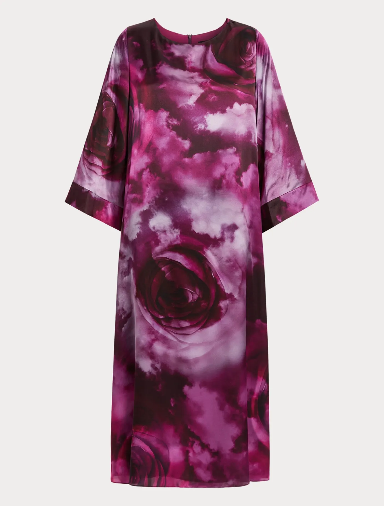 L’abito in raso di seta è definito da una linea over e una stampa esclusive a rose sfumate. Le maniche ampie rifinite da un bordo alto donano un volume scenografico. Il capo fa parte della collezione Elegante.