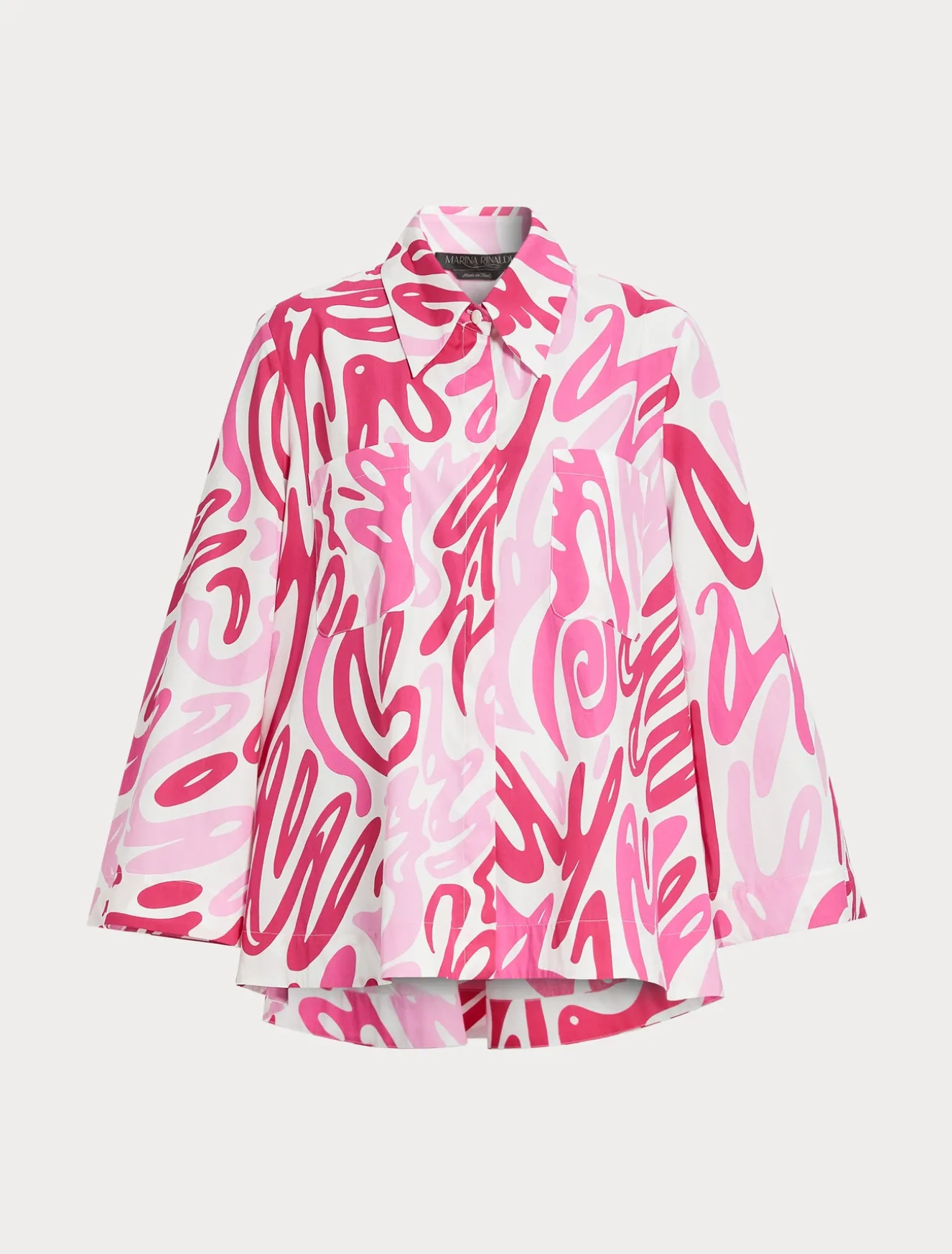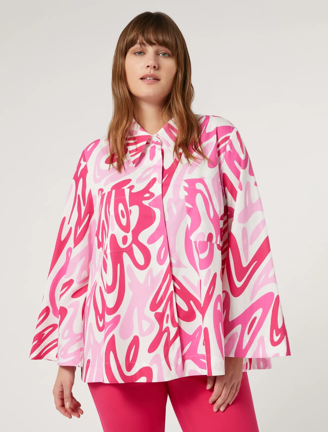 Stampa esclusiva per la blusa in popeline di cotone con fondo asimmetrico. Donerà un tocco grafico alle tue mise.Il capo fa parte della Capsule Sara Battaglia di Marina Rinaldi.
