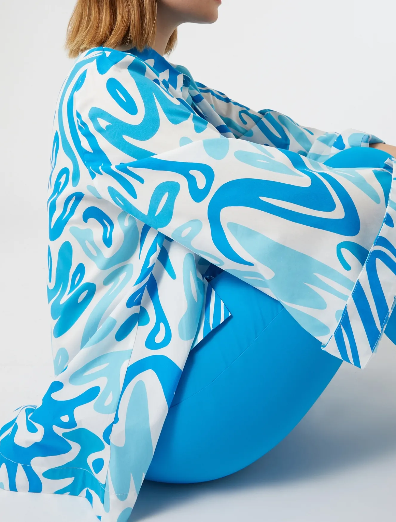 Stampa esclusiva per la blusa in popeline di cotone con fondo asimmetrico. Donerà un tocco grafico alle tue mise.Il capo fa parte della Capsule Sara Battaglia di Marina Rinaldi.