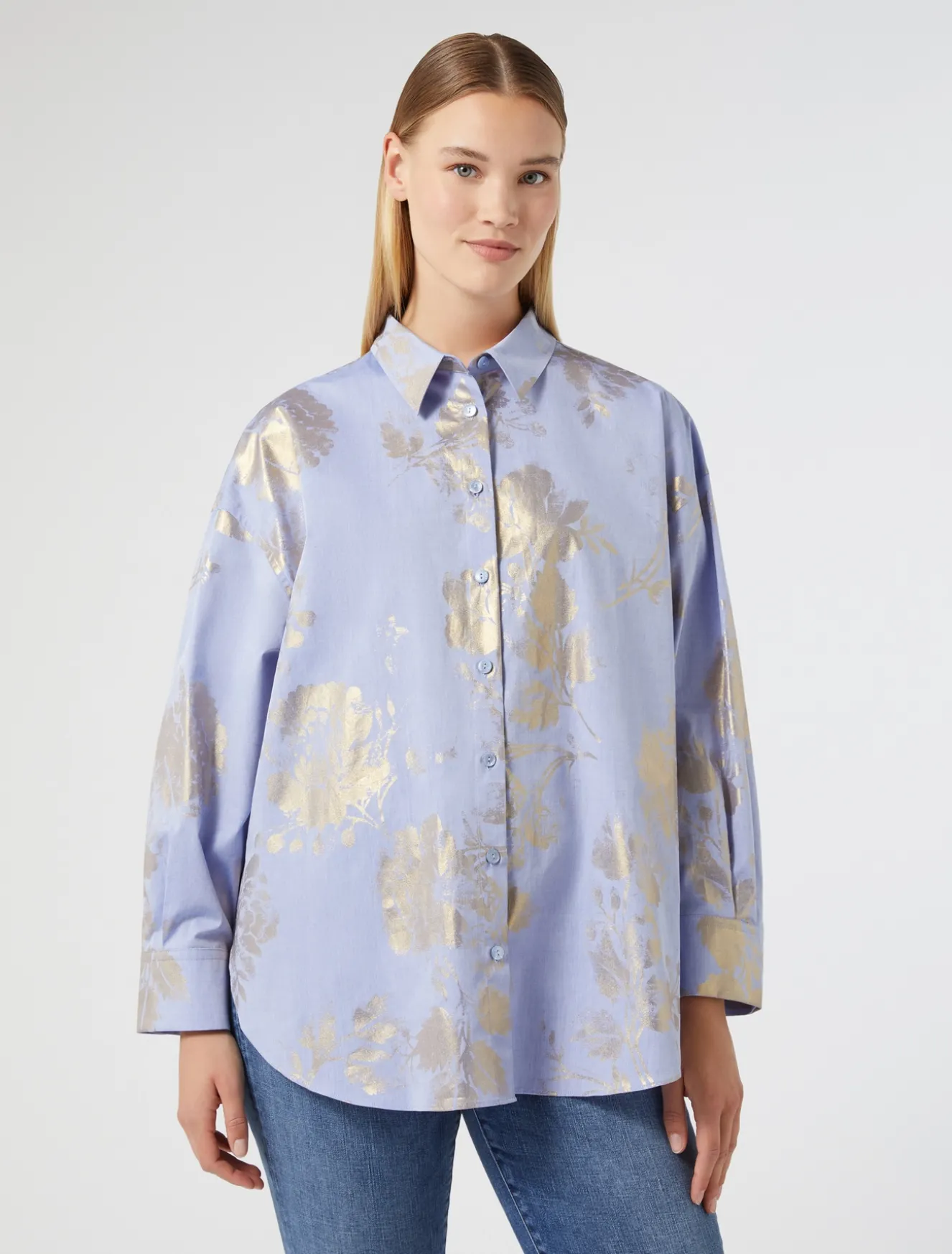 Design speciale per la camicia in chambray di cotone con stampa lamina. La puoi indossare aprendo la scollatura con colletto e bottoni sul retro.