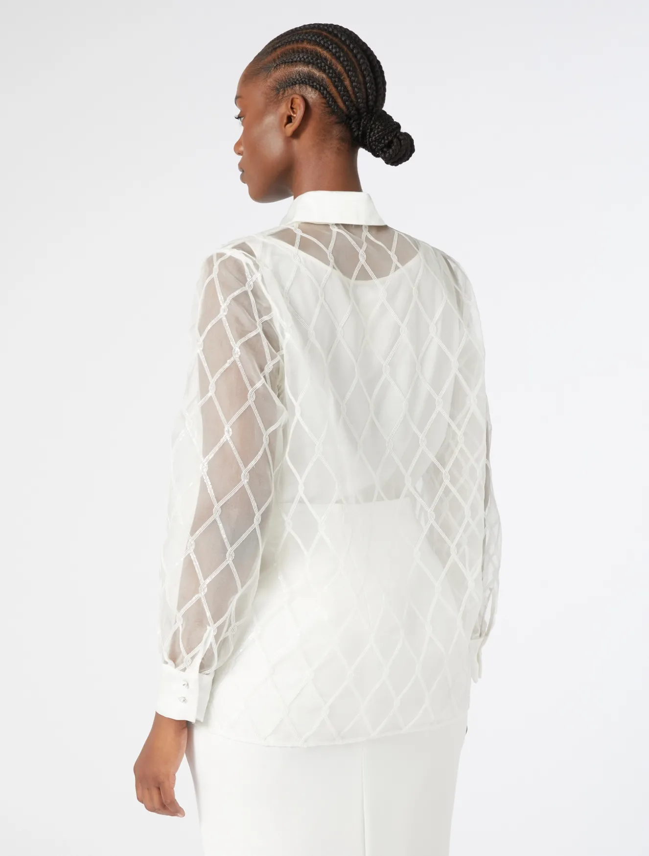 Un intreccio di paillettes con inserti in raso rende unica la camicia in organza di pura seta ricamata. La scelta perfetta per completare i tuoi look da cerimonia.