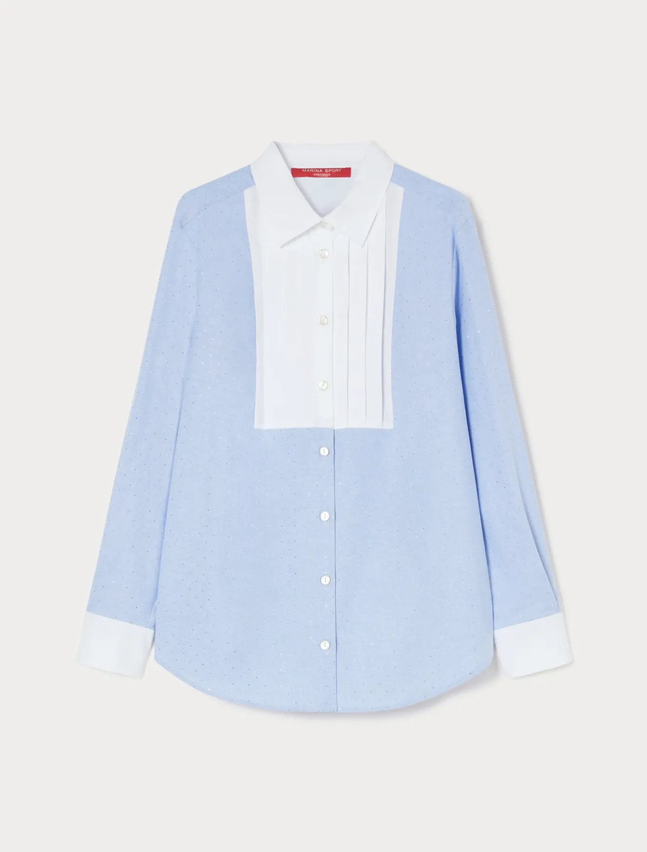 È costruita con dettagli in popeline la camicia in Oxford di cotone con microtermoadesivi sfacettati in metallo, dalla linea dritta. Perfetta per completare i look casual con un tocco ricercato.