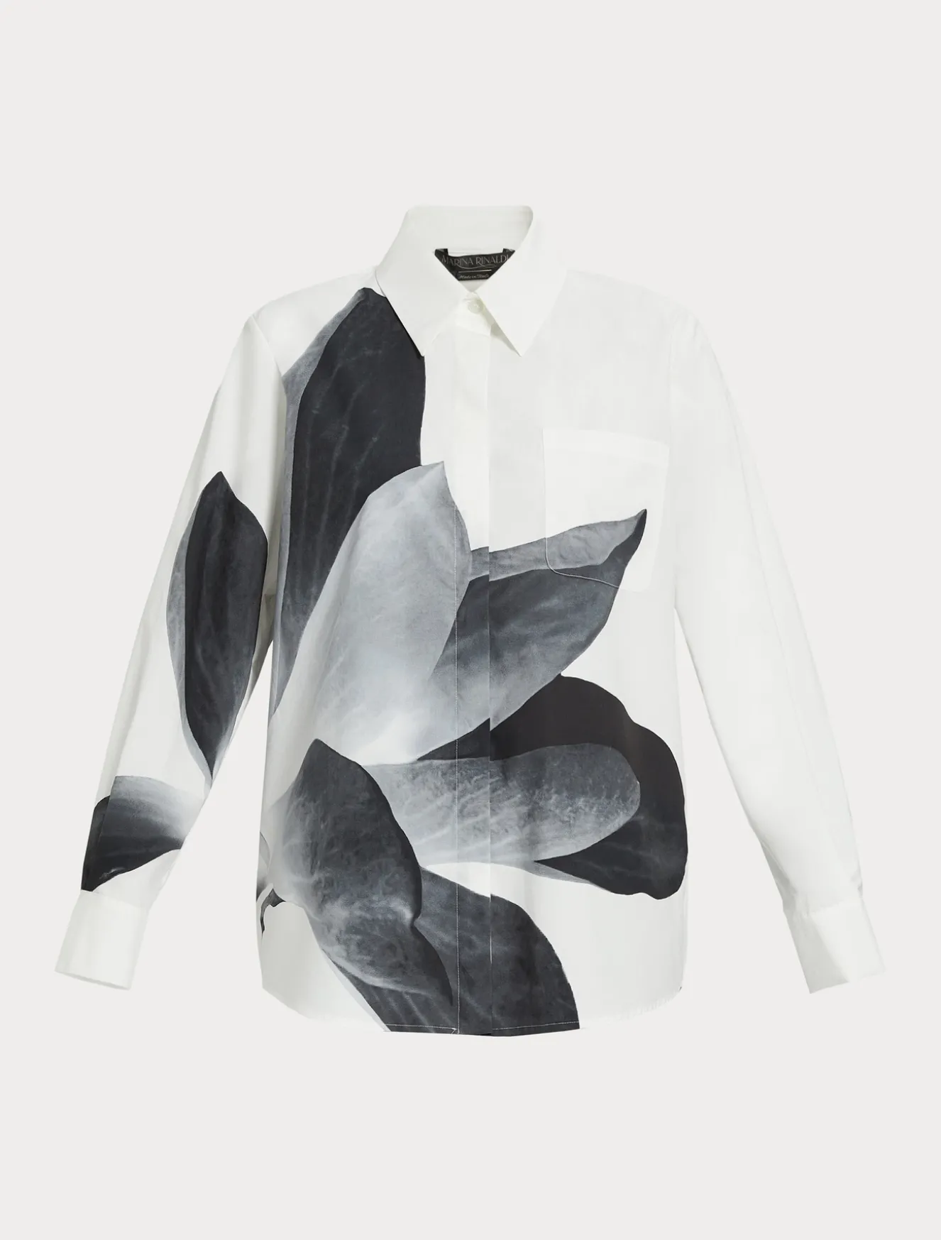Stampa piazzata asimmetrica a fiore fotografico per la camicia in popeline di puro cotone con taschino applicato riportato. Un modello scenografico per dare un’allure inedita allo stile. Il capo fa parte della main collection Marina Rinaldi.