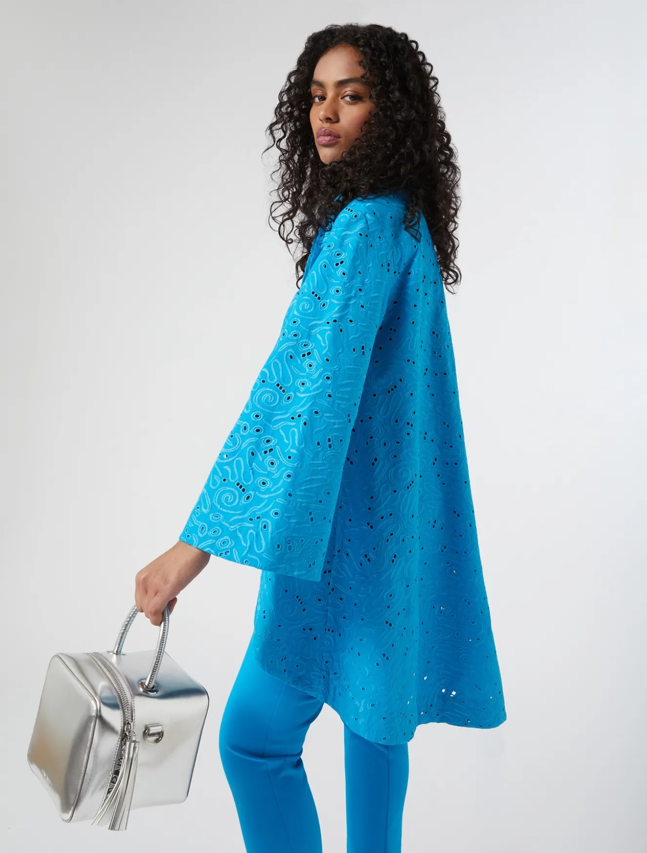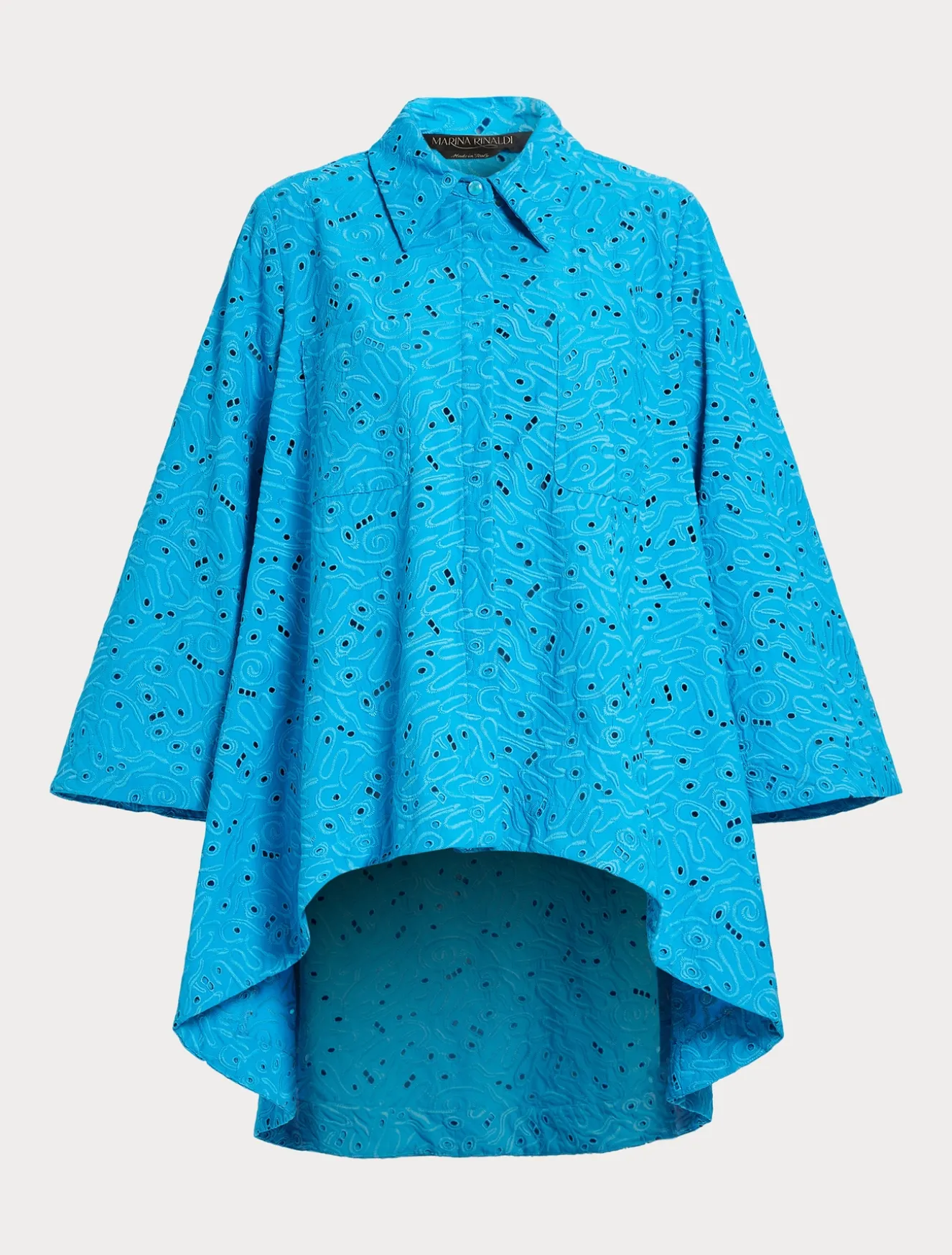 Ricamo effetto sangallo esclusivo per la camicia a tunica in popeline di cotone con fondo asimmetrico. Allure ricercata per elevare qualsiasi look.Il capo fa parte della Capsule Sara Battaglia di Marina Rinaldi.