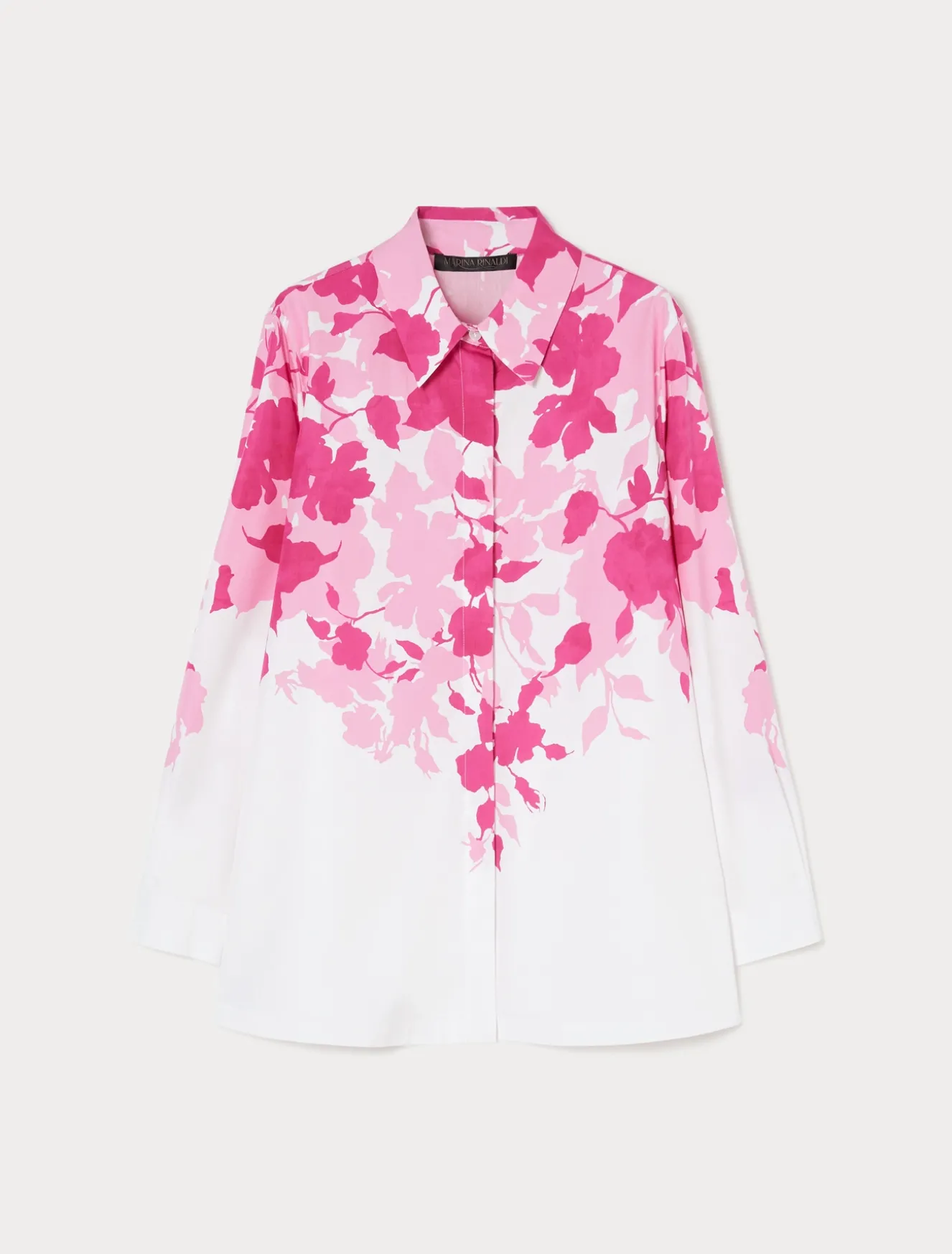 Stampa floreale piazzata per la camicia in popeline di puro cotone. Romantica e ricercata, da abbinare alla gonna in coordinato.
