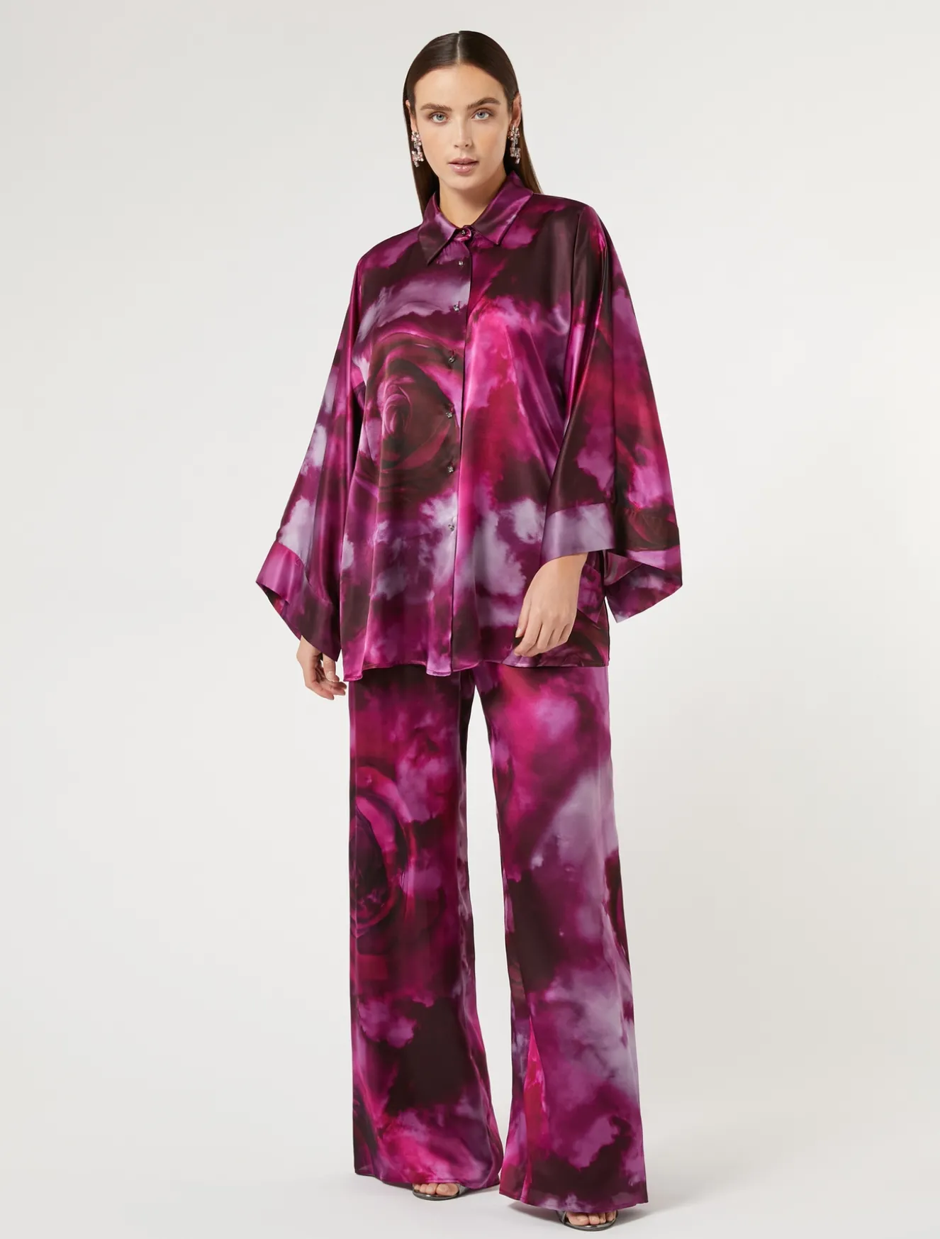 Un’esclusiva stampa a rose sfumate per la camicia in raso di pura seta, dalla linea over. Perfetta per un’occasione importante, la puoi abbinare ai pantaloni in coordinato.Il capo fa parte della collezione Elegante.