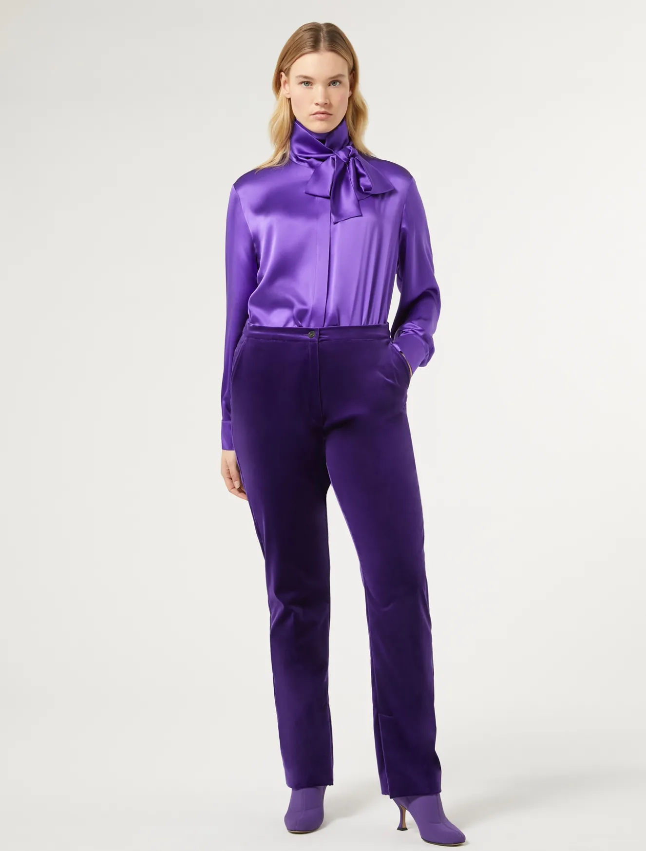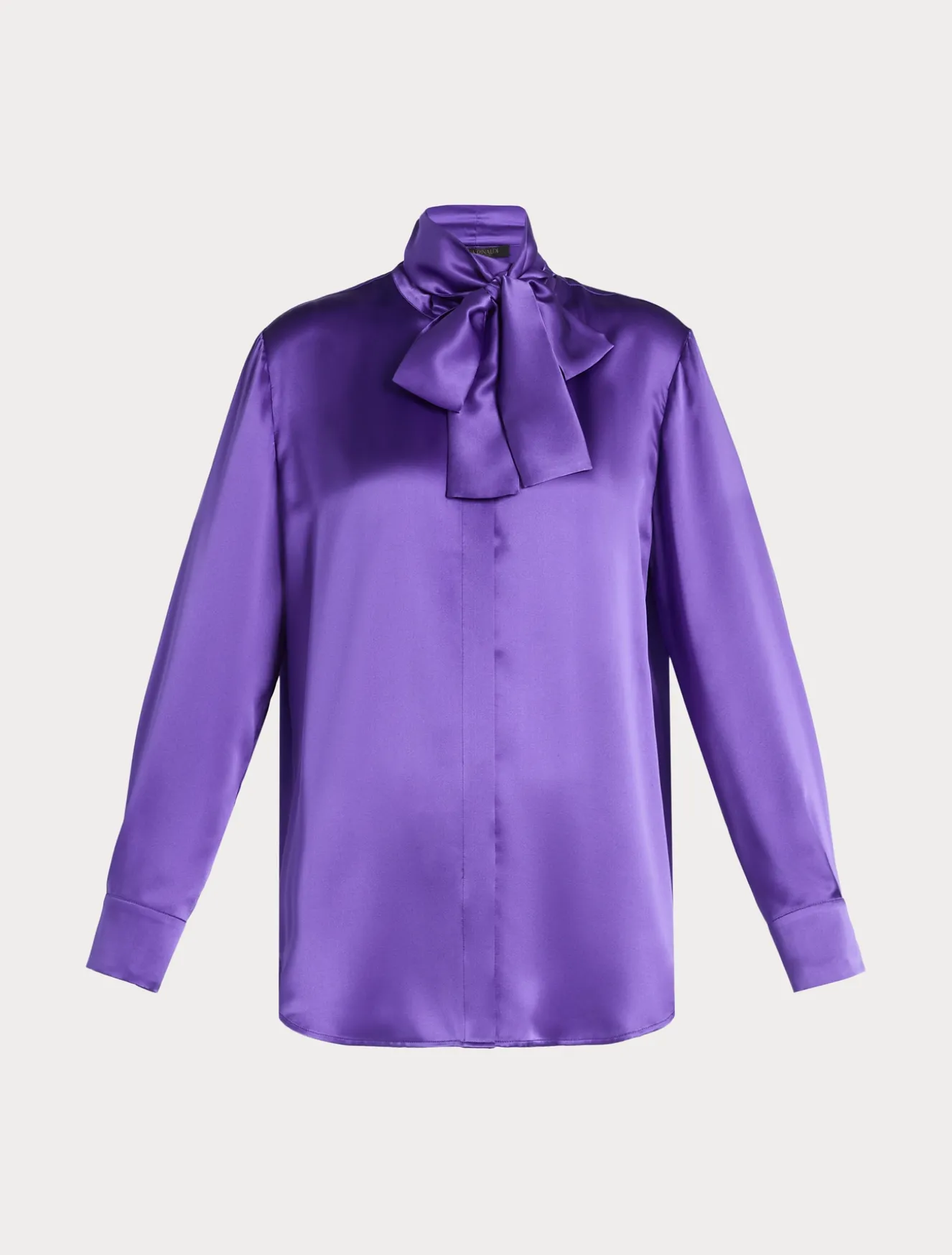 Nel guardaroba non può mancare questa camicia in raso di pura seta con collo a fusciacca da annodare a fiocco. Perfetta da interpretare in una miriade di stili.Il capo fa parte della main collection Marina Rinaldi.