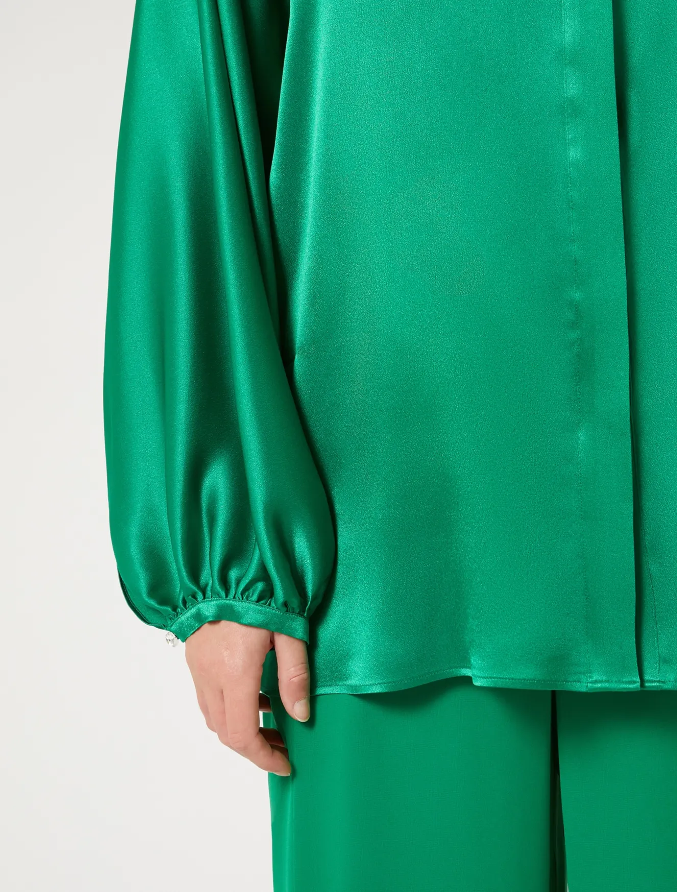 Linea ampia e femminile per la camicia in satin con bottoni gioiello. Ideale per completare le tue mise speciali.Il capo fa parte della collezione Elegante.