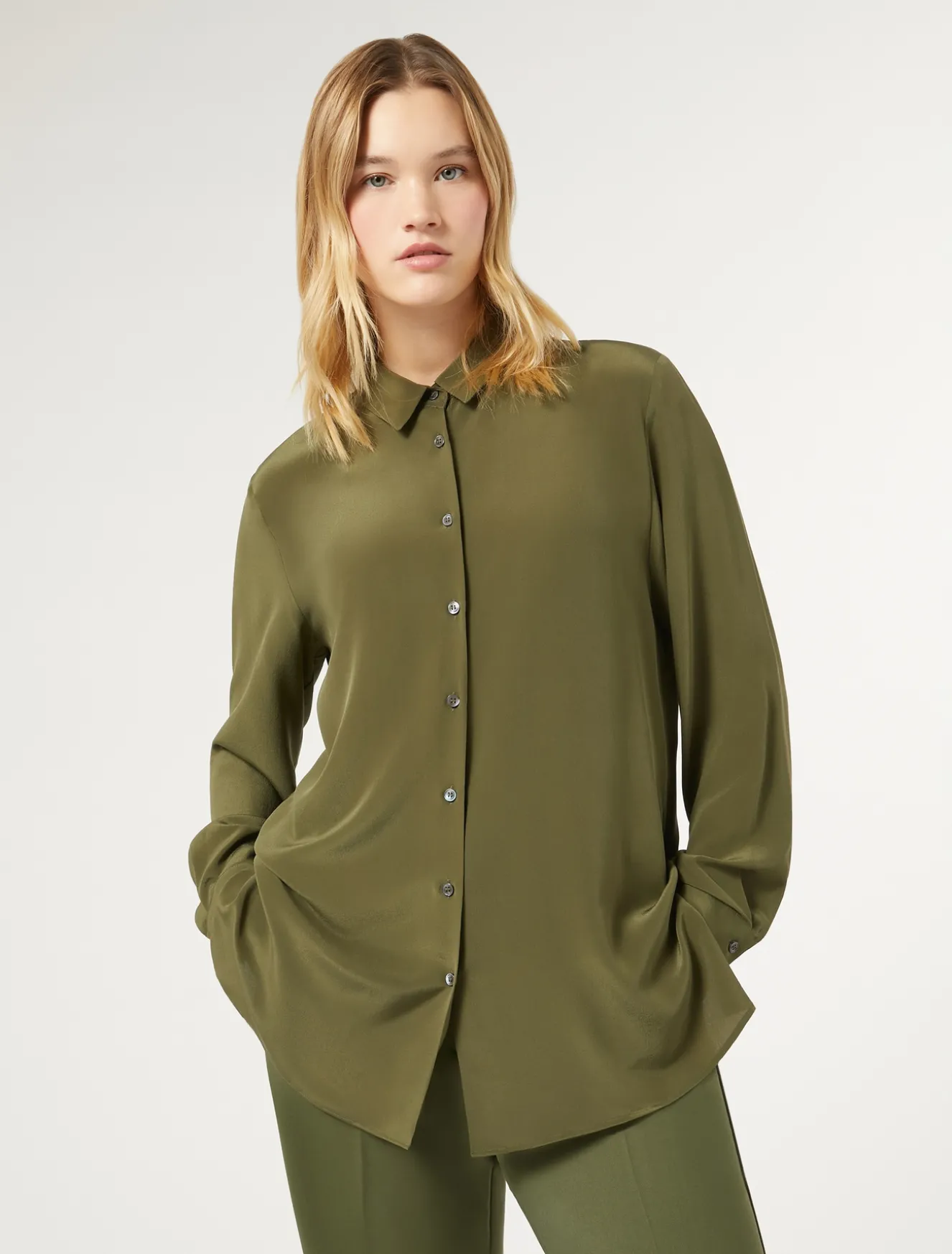 Raffinato crêpe de Chine di seta per la camicia, dalla linea dritta. Il tessuto è di facile manutenzione, si può lavare in acqua. Un jolly del guardaroba dall’eleganza essenziale.Il capo fa parte della collezione Voyage.