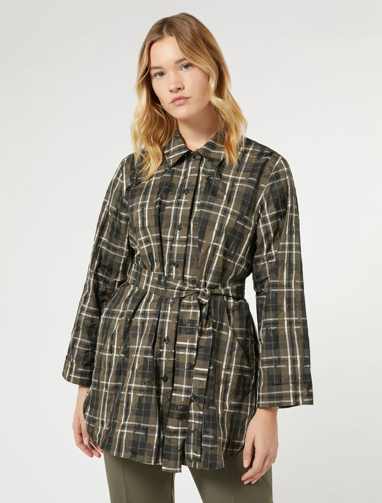 Texture sofisticate per la camicia in taffettà jacquard con colletto, maniche lunghe e chiusura con bottoni. L’orlo stondato sul davanti dona un carattere contemporaneo.Il capo fa parte della collezione Persona by Marina Rinaldi.