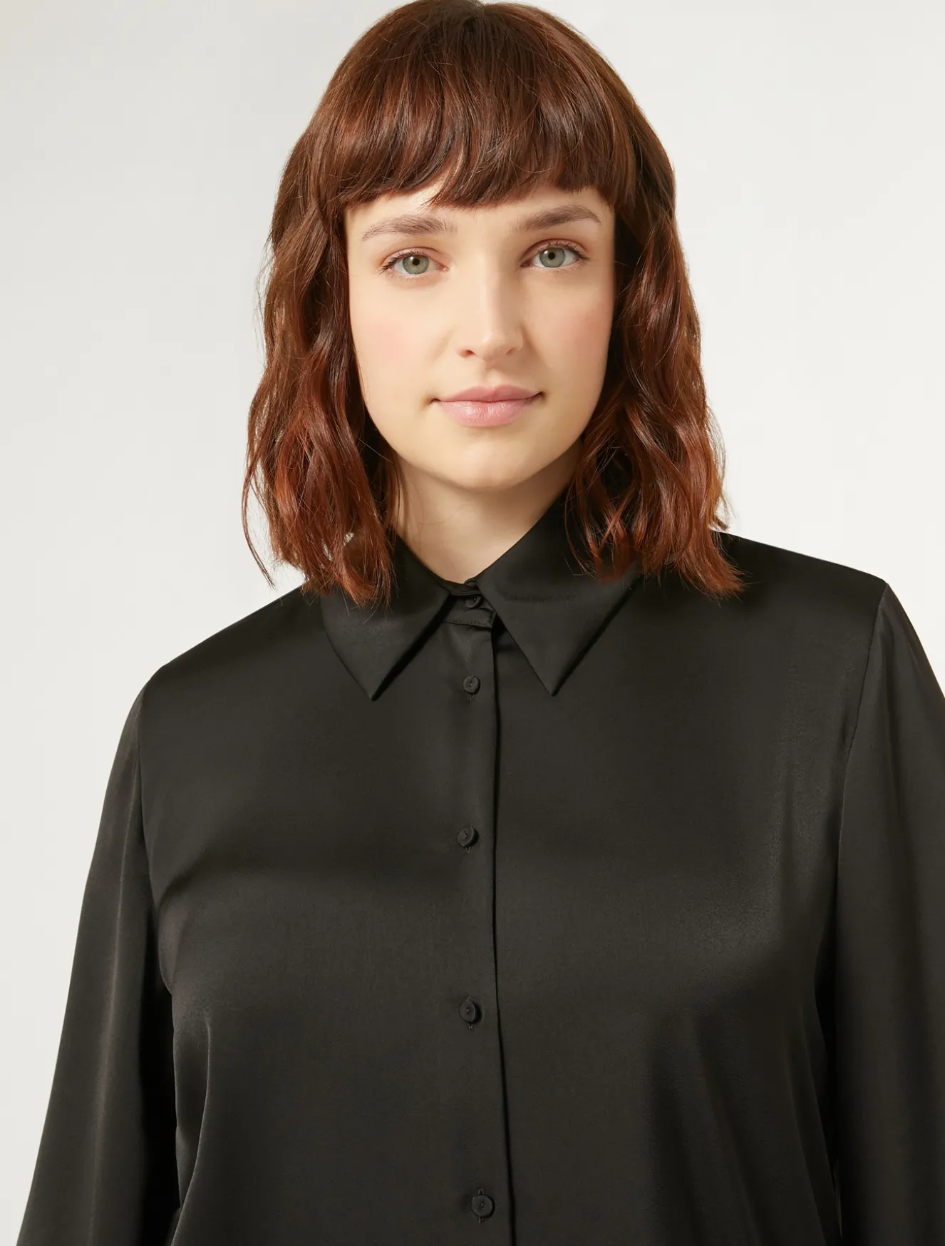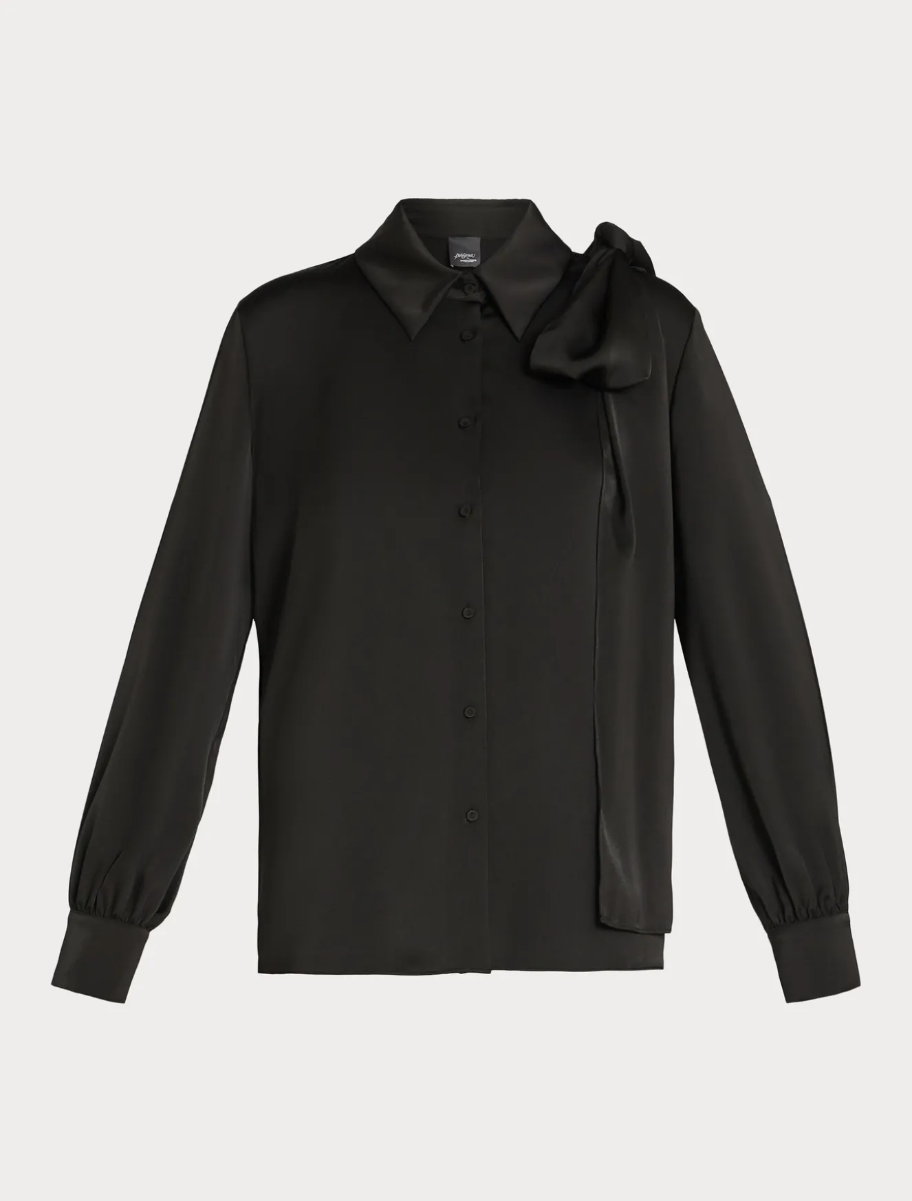 Dettagli bon ton per la camicia in raso con colletto, maniche corte e fusciacca da allacciare su una spalla.Il capo fa parte della collezione Persona by Marina Rinaldi.