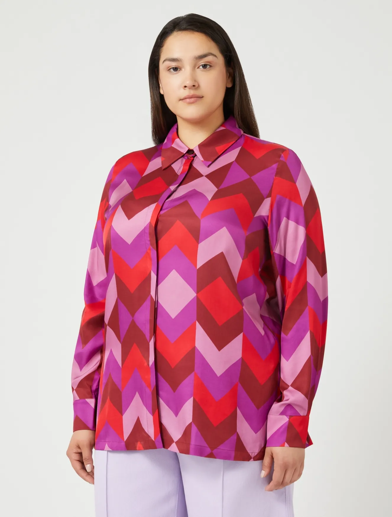 Tessuto fluido e fantasia geometrica per questa camicia in twill di viscosa, dalla linea dritta. Perfetta per aggiungere carattere a tutte le tue mise.Il capo fa parte della main collection Marina Rinaldi.