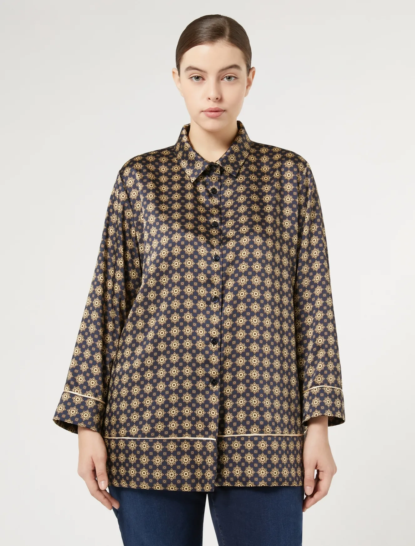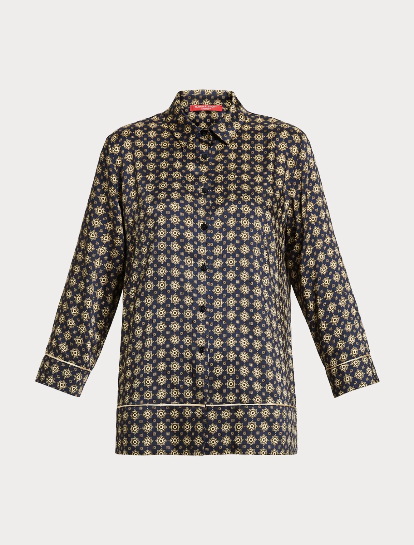 È rifinita da piping a contrasto la camicia in twill con stampa esclusiva. Per dare una nota grafica allo stile, la puoi indossare sia come camicia che come casacca aperta in look layering.Il capo fa parte della collezione Marina Sport.