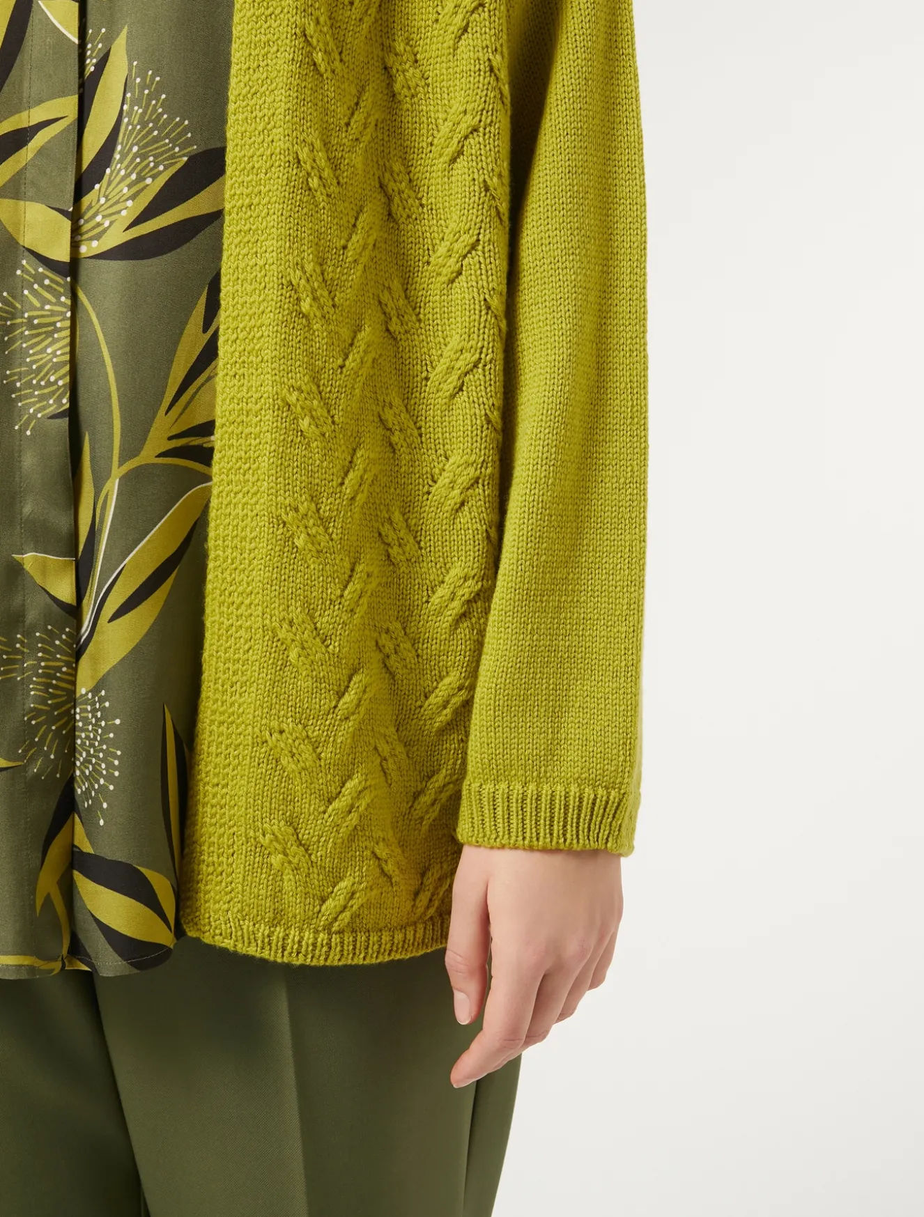 Lavorazione a trecce per il cardigan seamless in catenella di lana. Un modello perfetto anche per completare un look elegante.Il capo fa parte della collezione Voyage.