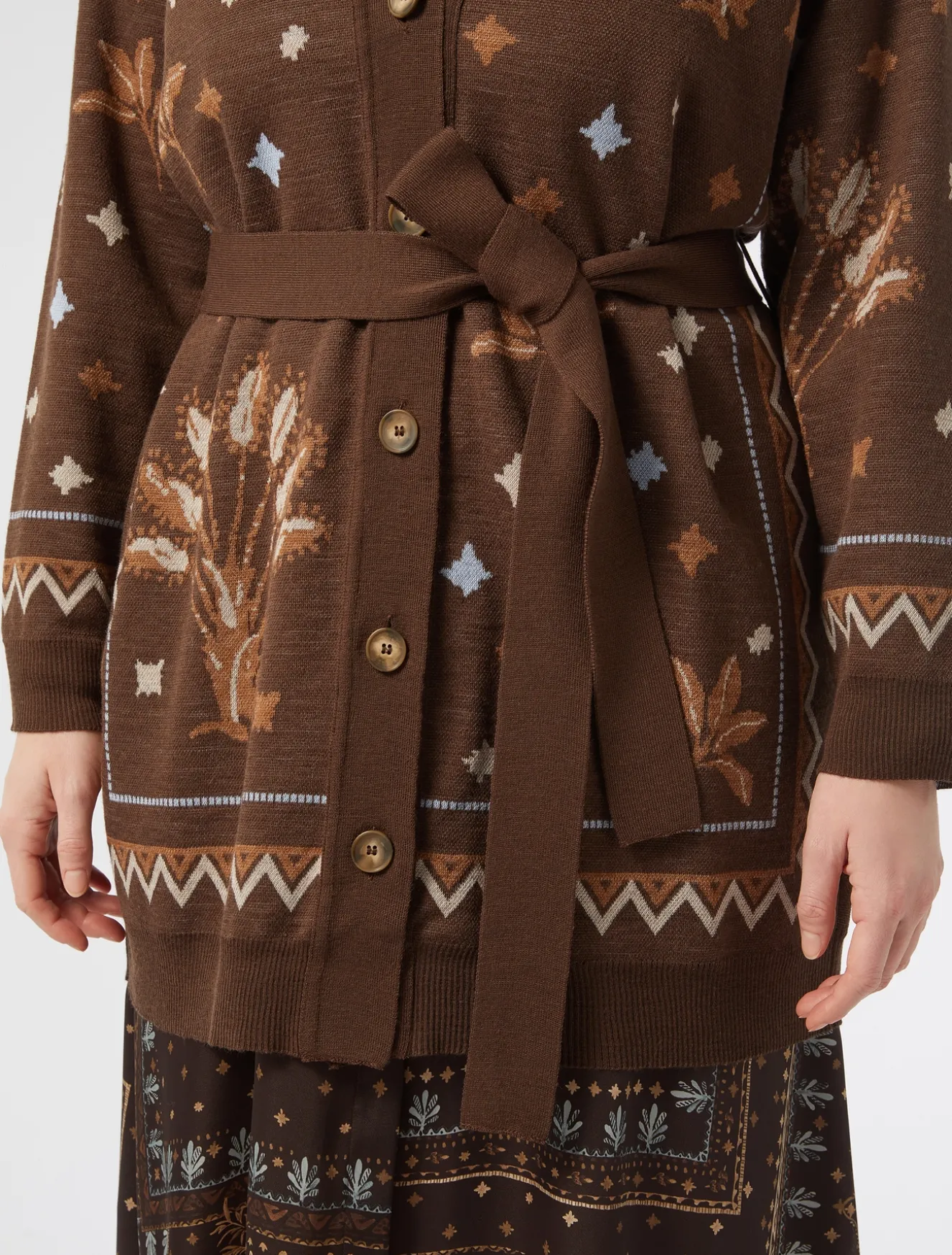 Il cardigan in filato di misto lana esibisce una ricercata lavorazione jacquard multicolor. Lo puoi regolare in vita con la cintura in coordinato.Il capo fa parte della collezione Marina Sport.