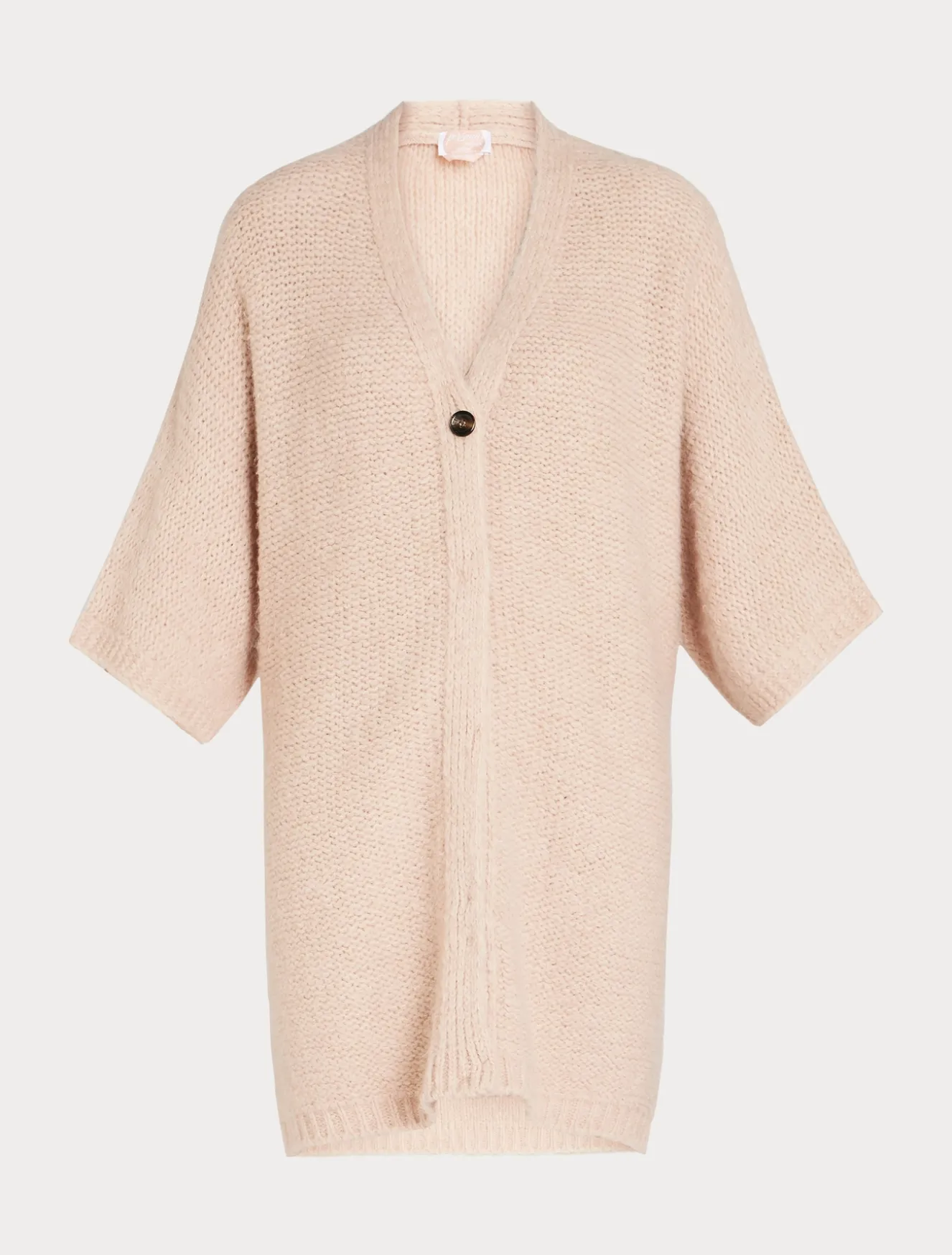 Volumi inediti per il cardigan in misto lana con scollo a V e maniche kimono. La linea over avvolge con stile. Il capo fa parte della collezione NOW by Marina Rinaldi.
