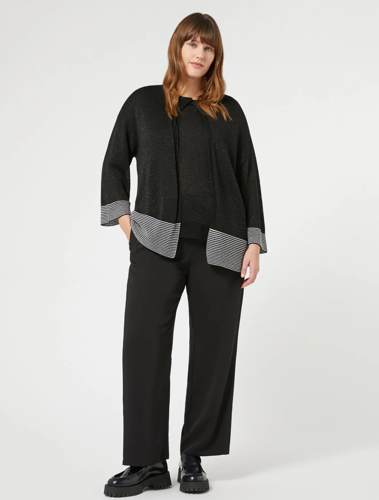 È realizzato in filato di viscosa lurex con lavorazione a righe ai fondi, il cardigan dalla linea dritta. Un modello perfetto anche per completare un look elegante.Il capo fa parte della collezione Voyage.
