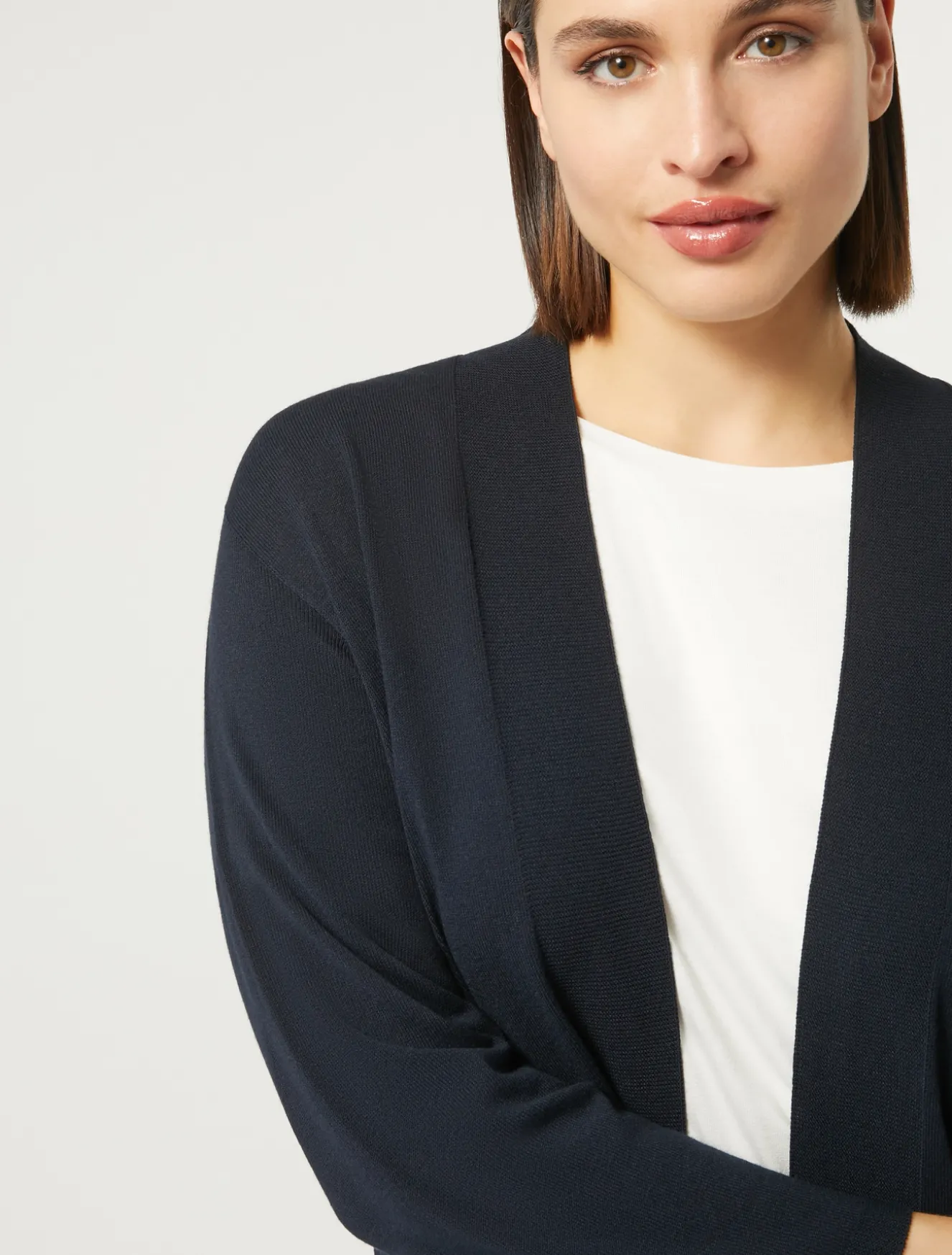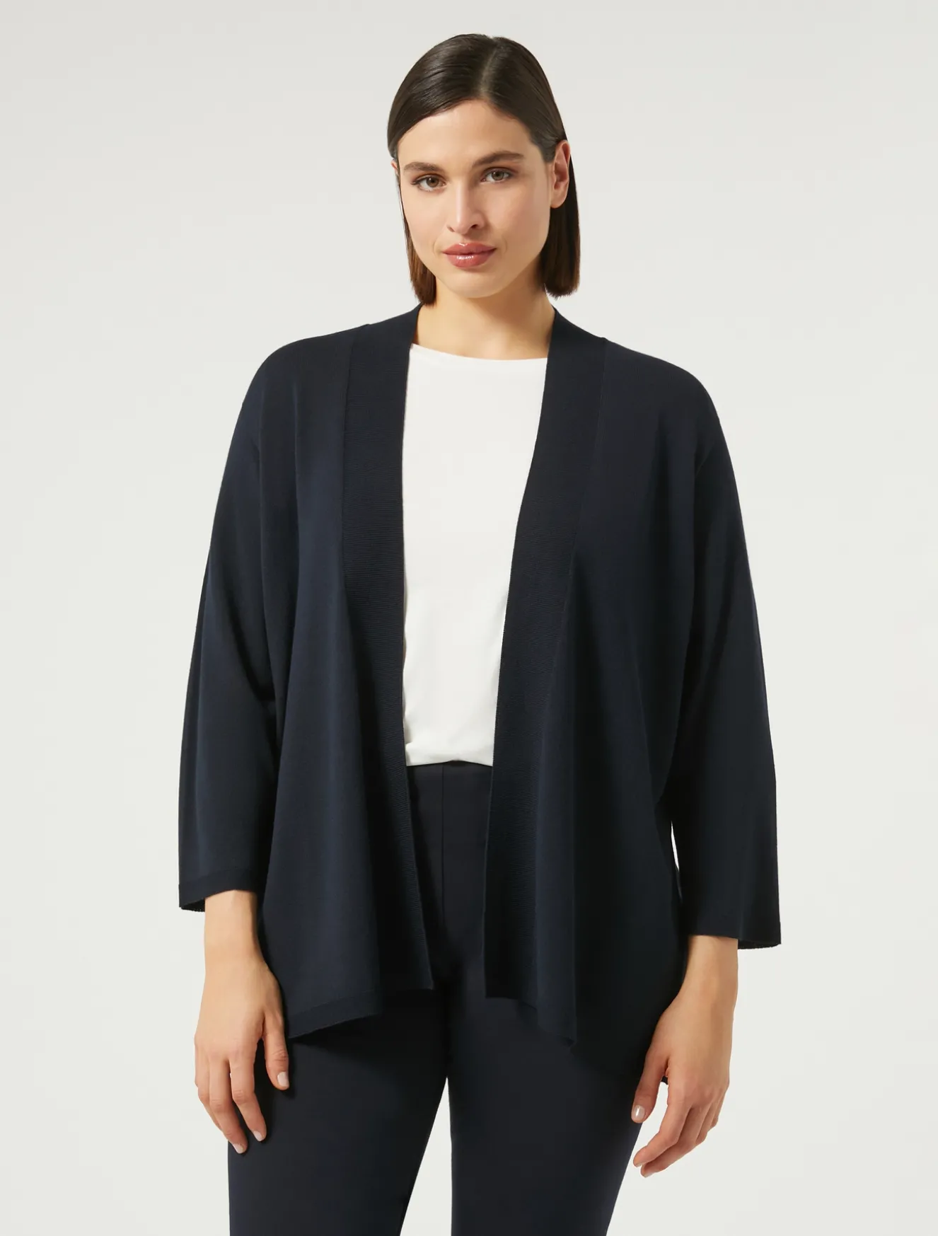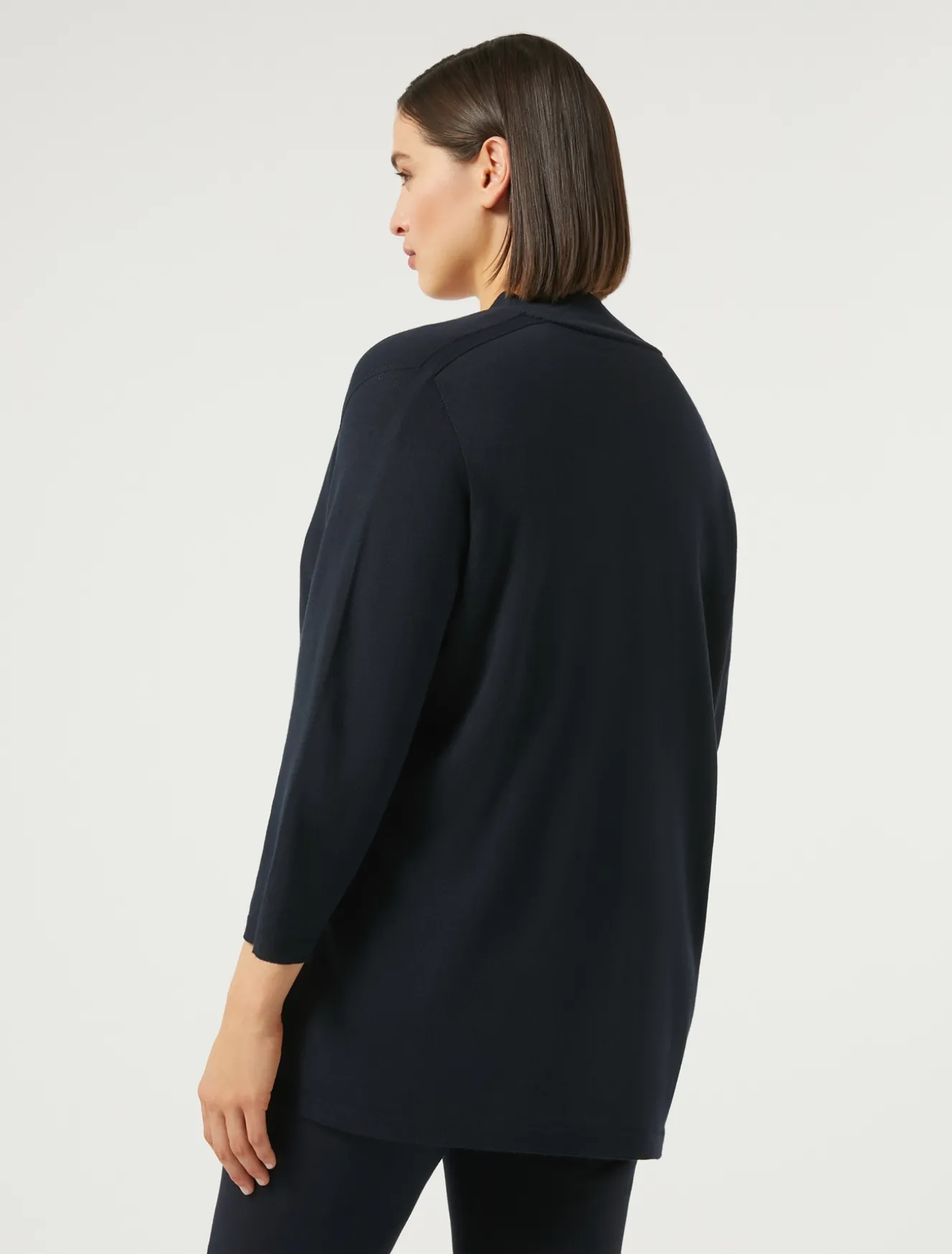Indispensabile per il guardaroba di stagione, il cardigan in viscosa stretch crêpe ha collo montante e maniche lunghe con linea dritta, per un fit avvolgente sulla silhouette.Il capo fa parte della collezione Persona by Marina Rinaldi.