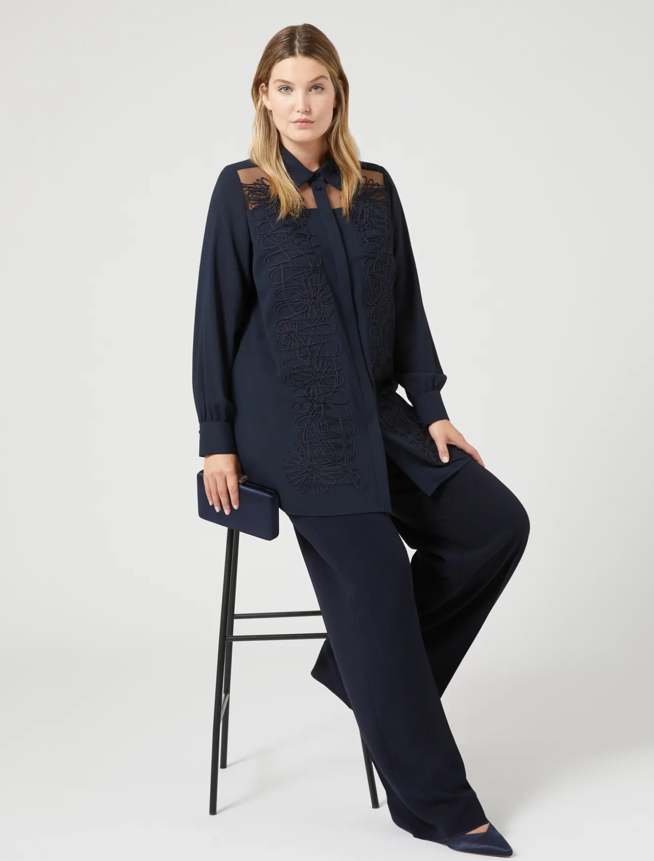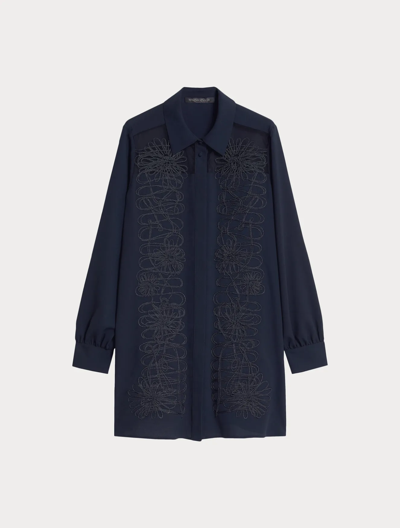 Prezioso ricamo in fettuccia cornely per la camicia lunga in crêpe leggero con carré davanti in tulle see-through. Lavorazione preziosa e speciale che eleverà lo stile in un attimo.Il capo fa parte della collezione Elegante.