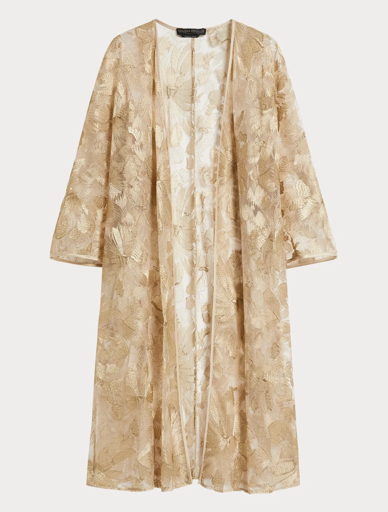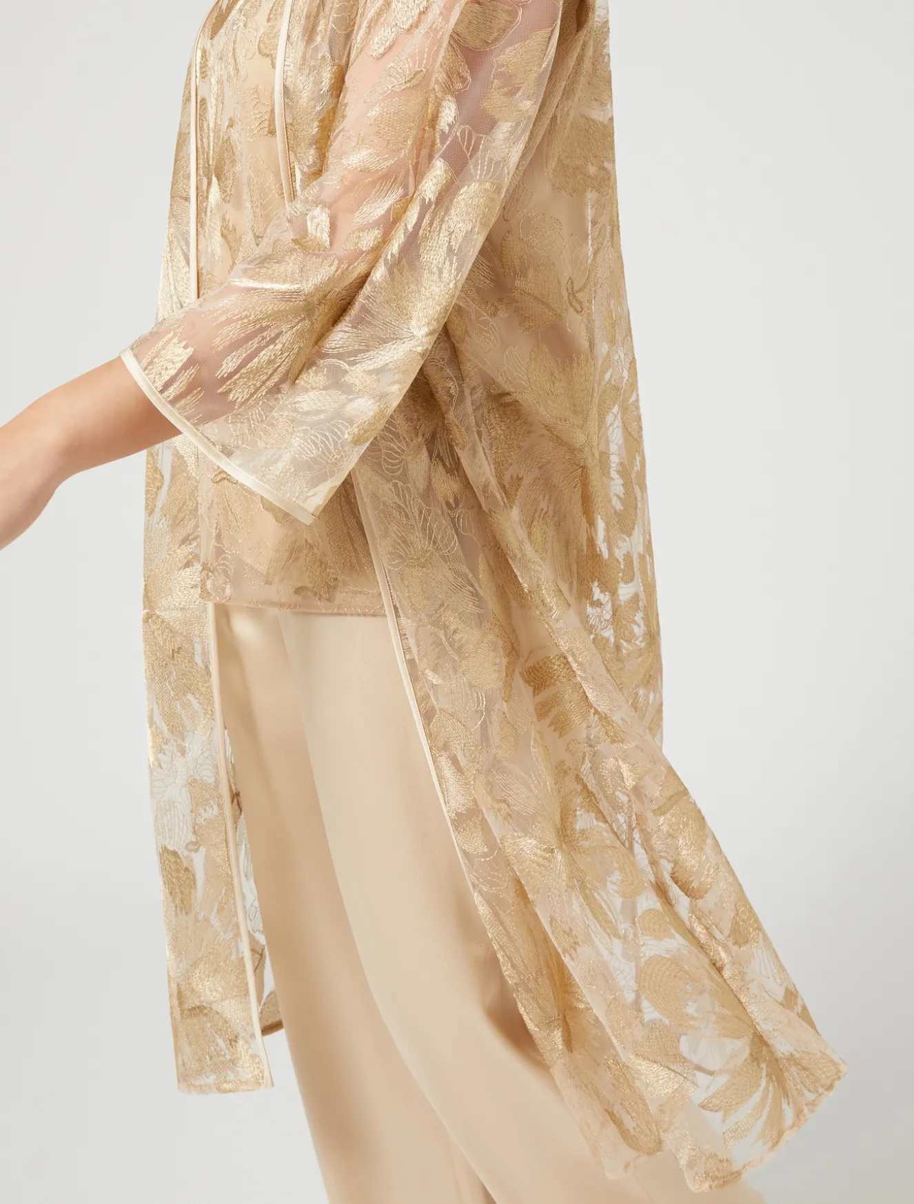 Disegno floreale esclusivo per il ricamo della casacca in tulle con maniche a kimono e profili rifiniti da bordi in gros-grain in tinta. Un modello prezioso e attuale che eleverà ogni mise delle occasioni. Il capo fa parte della collezione Elegante.