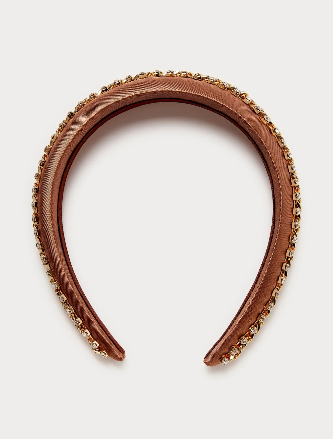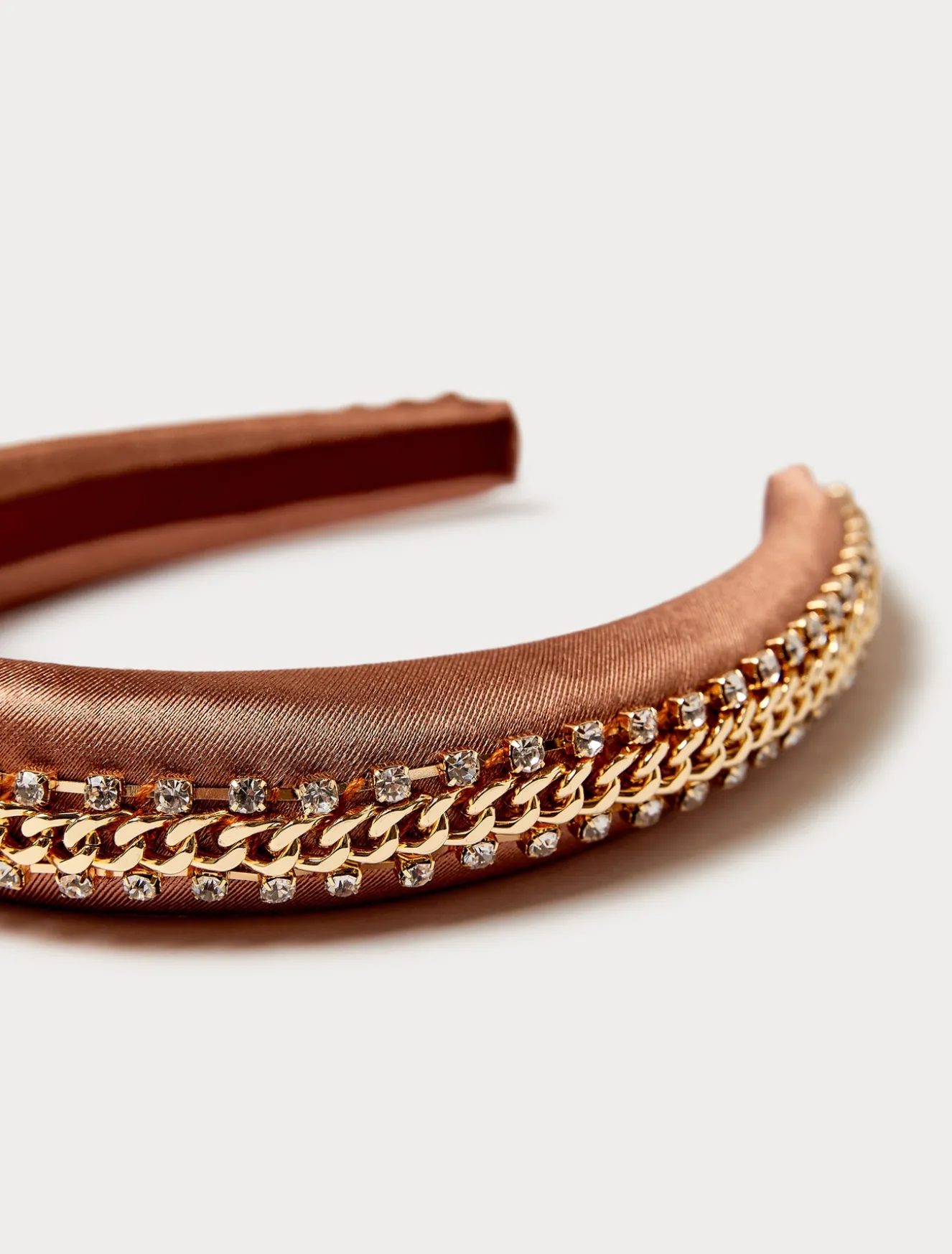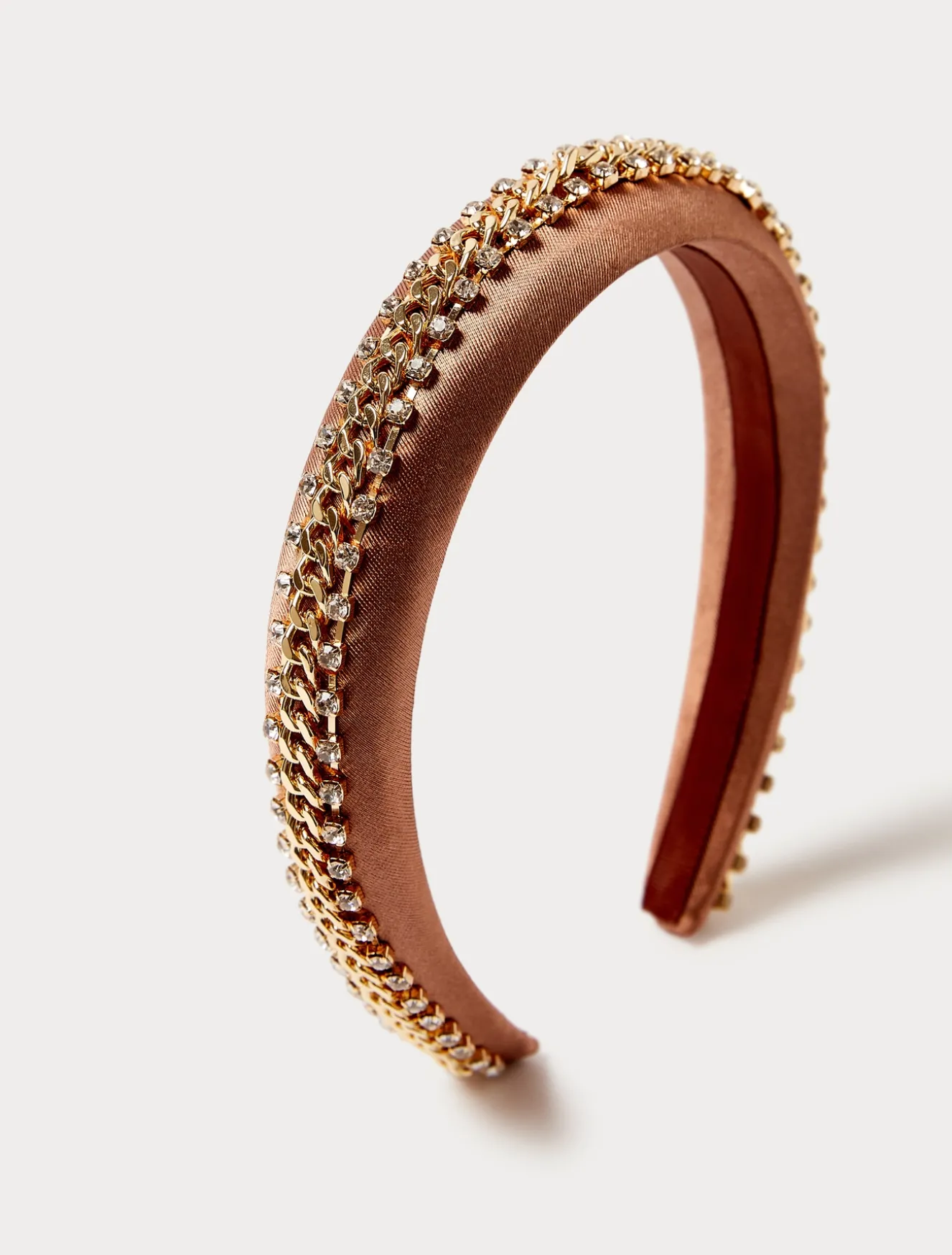 È impreziosito da una catena in metallo e strass all over il cerchietto per capelli in raso imbottito. Per rifinire lo stile delle occasioni speciali.