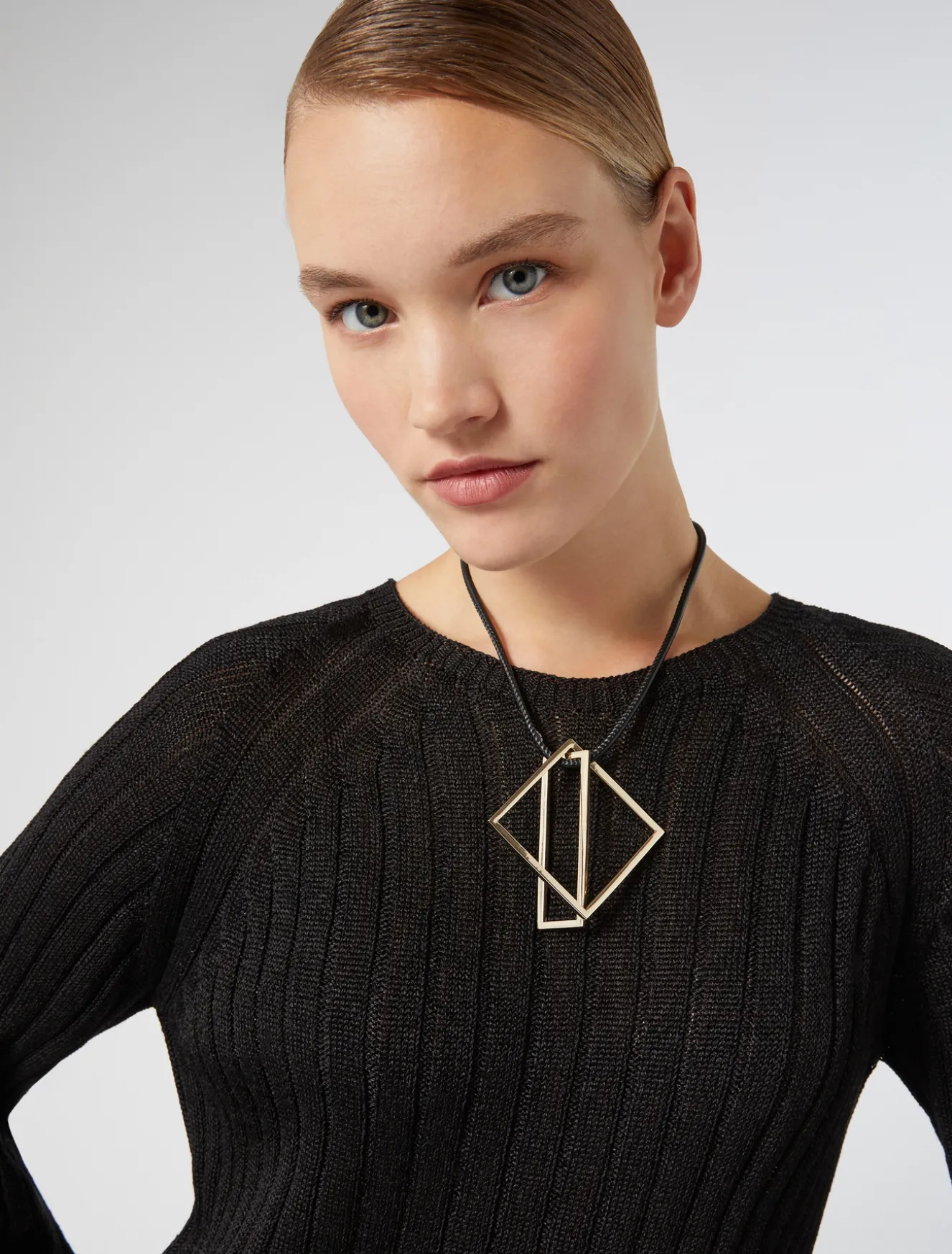 Puoi regolare come vuoi la collana lunga realizzata in corda effetto tessuto spalmato con ciondoli geometrici. Da regalare e regalarsi.