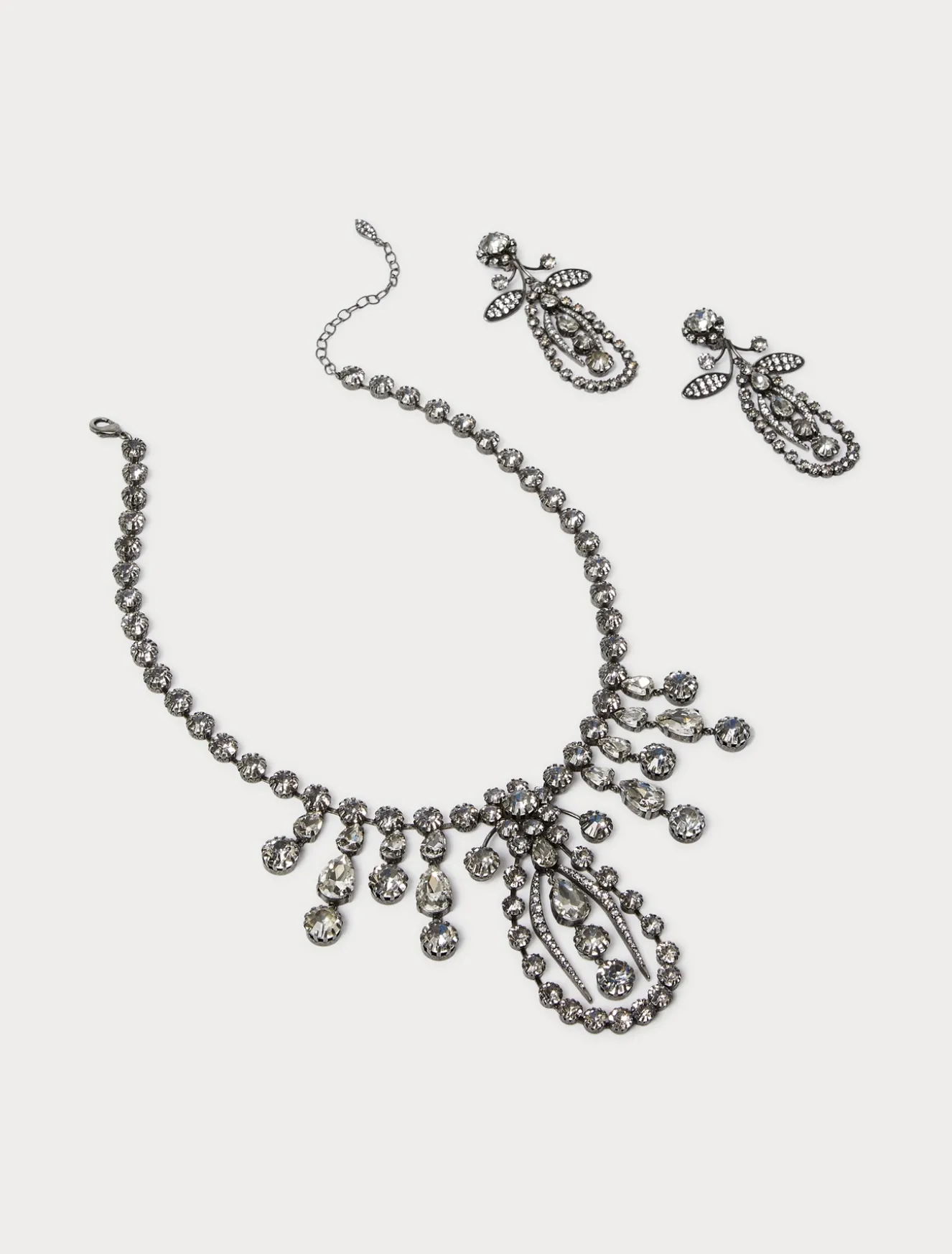 Ispirazione vintage per la parure in strass composta da collana e orecchini chandelier. Illuminano in un attimo lo stile.