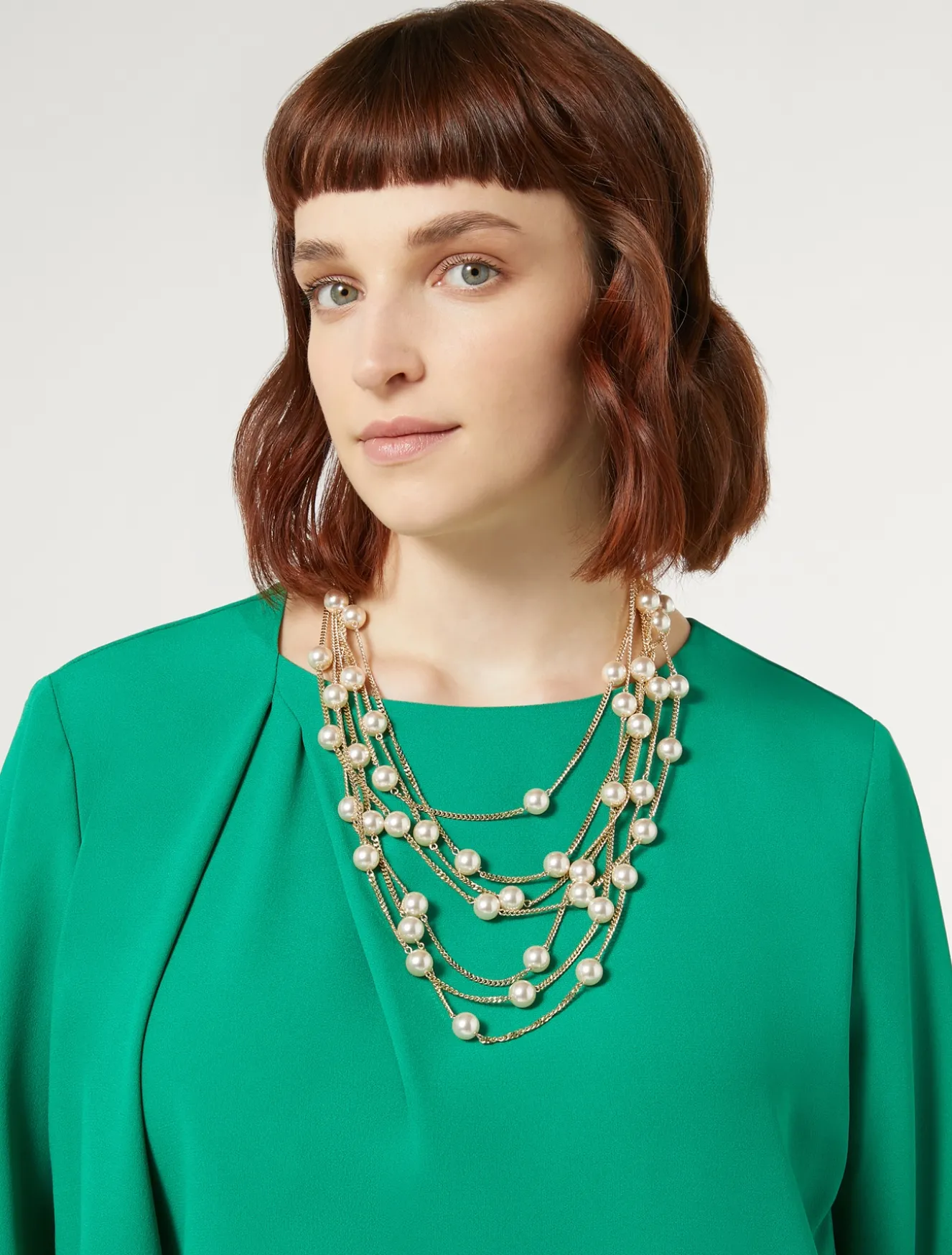 È composta da catene e perle la collana multifilo. Un accessorio scenografico che completa lo stile con una nota glamour.Il capo fa parte della collezione Elegante.