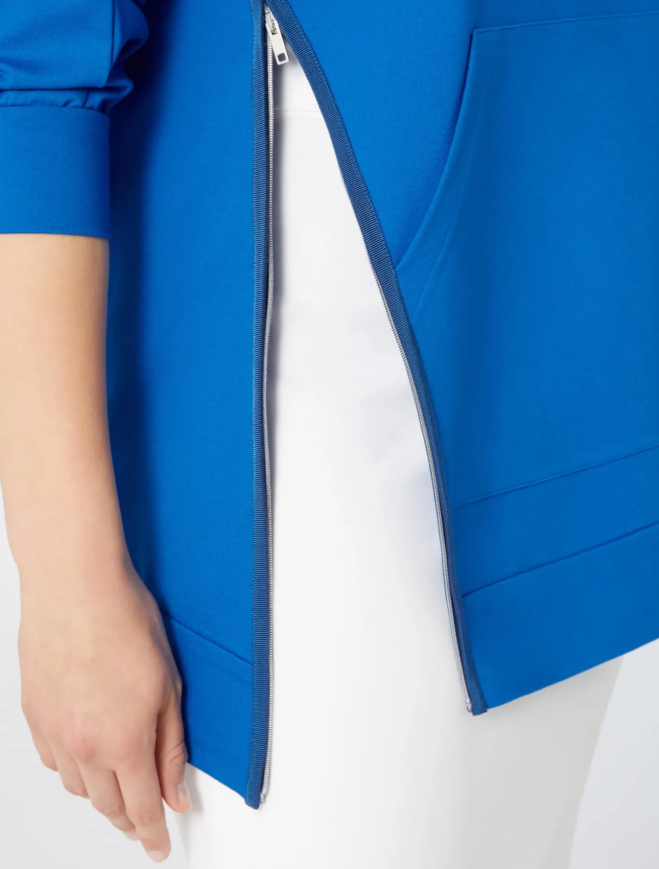 Completa il tuo stile del tempo libero con la felpa in jersey punto stoffa, dalla linea dritta. È rifinita da apertura con zip metallizzata e dettaglio di nastro in gros-grain.