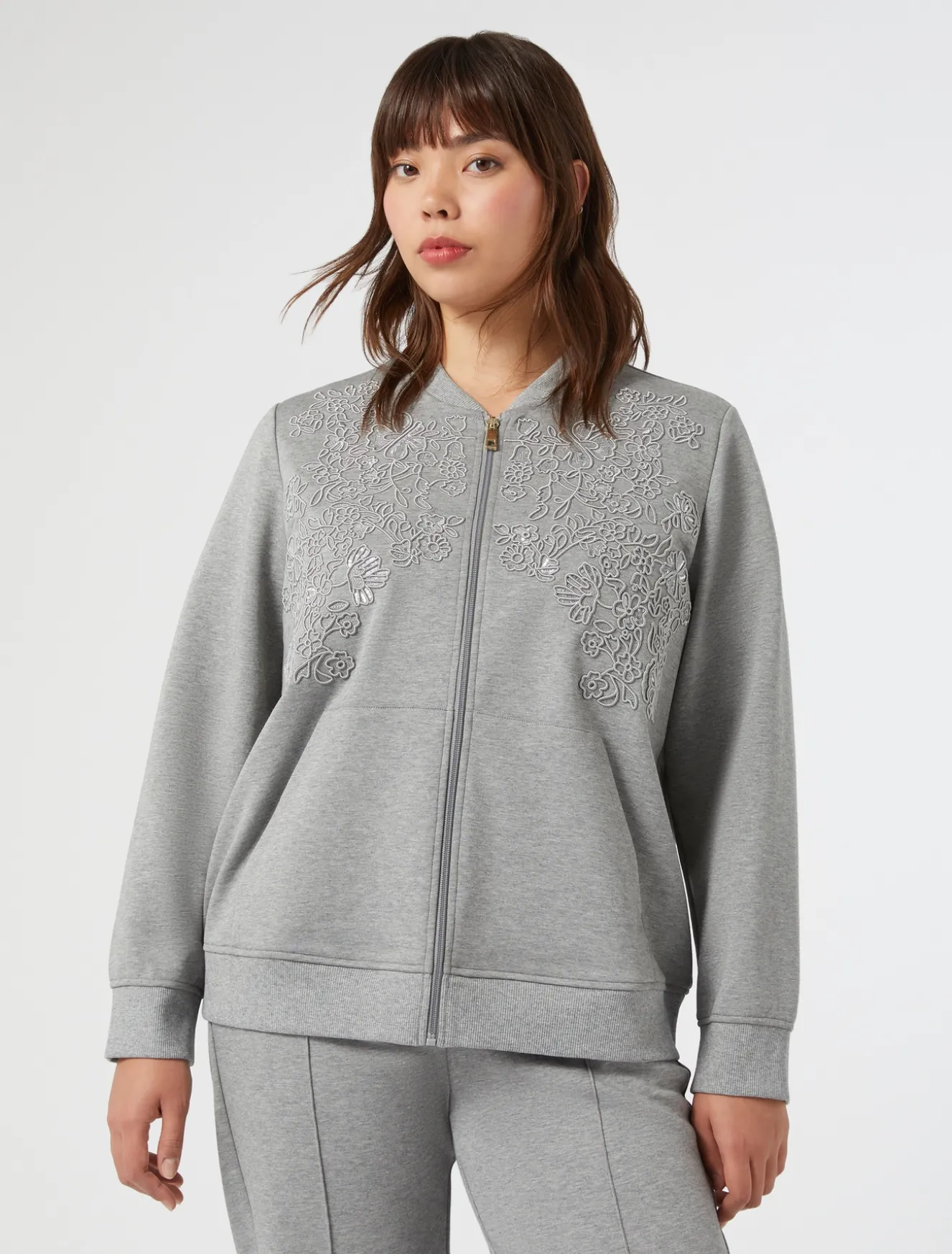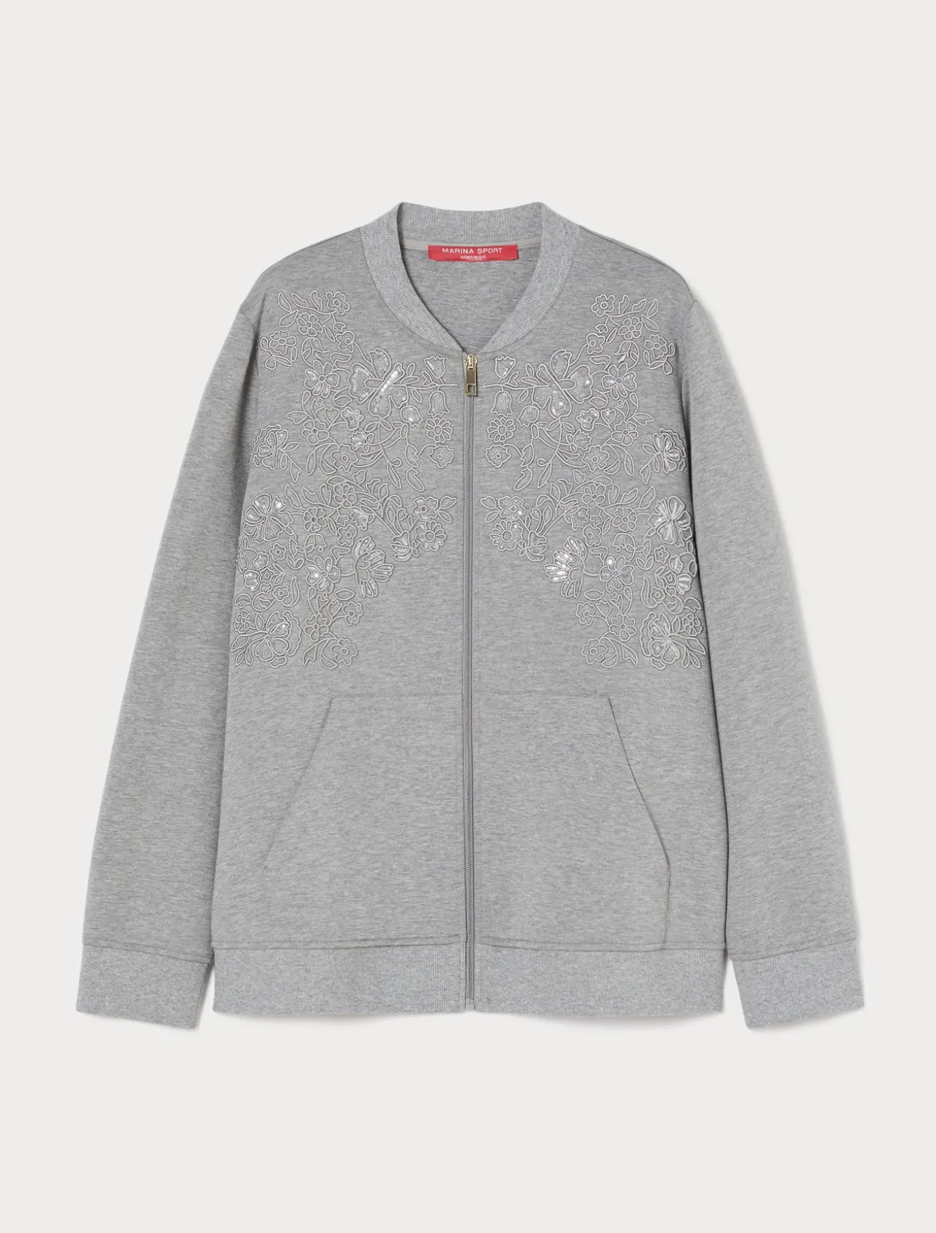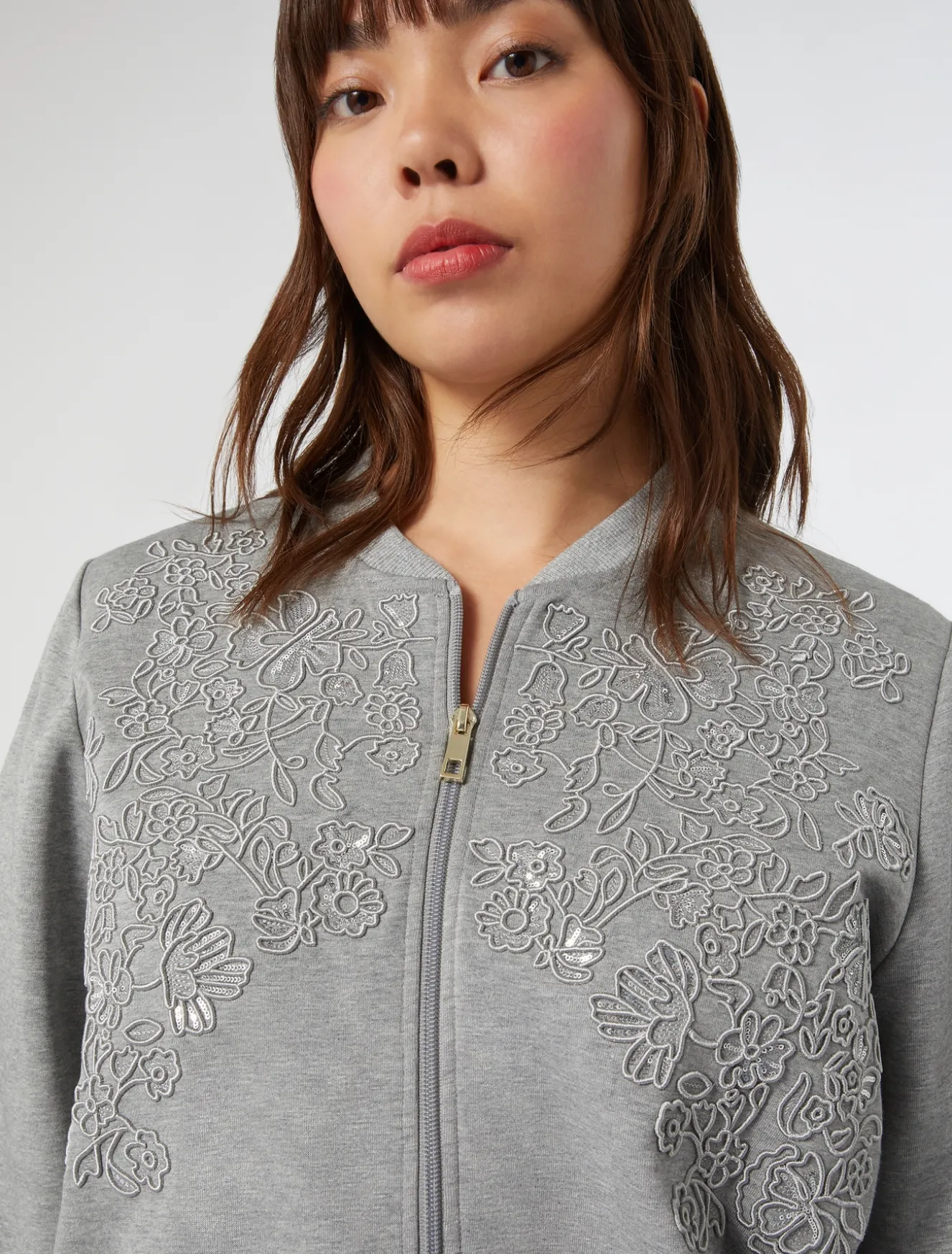 Ricamo in filo e paillettes per la felpa in jersey doppio di cotone, dalla linea a bomber. Perfetta per elevare i tuoi look del tempo libero, anche in abbinamento ai pantaloni in coordinato.