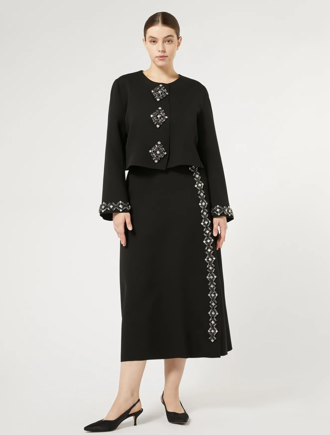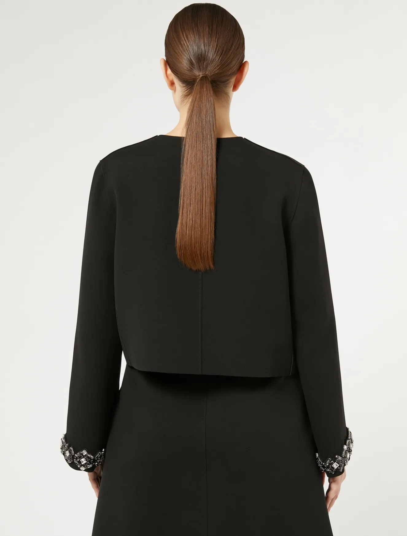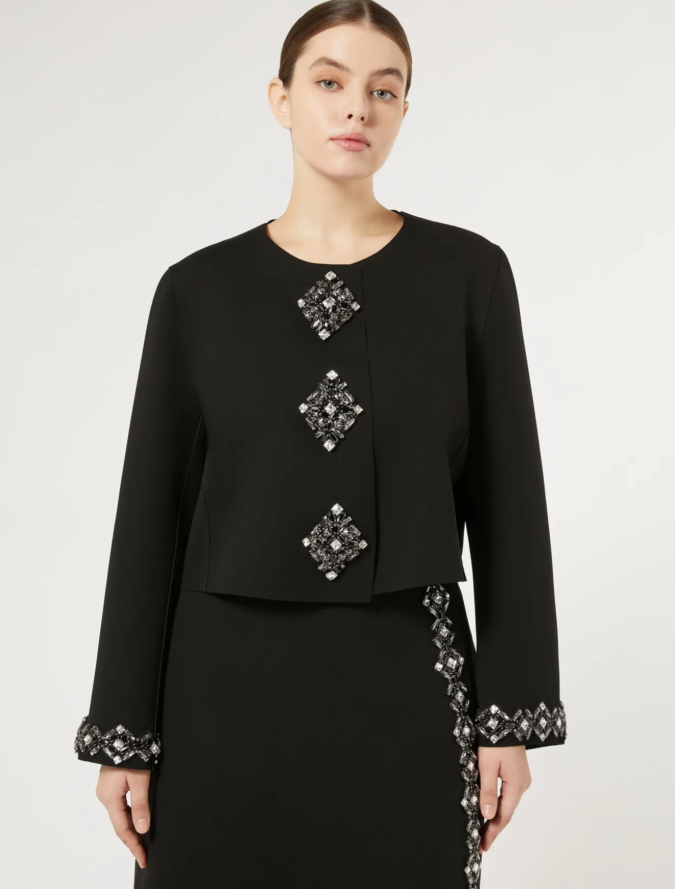 Fascino ricercato per la giacca in cady accoppiato finito al laser arricchita da applicazioni strass effetto bottone ricamate a mano e passamanerie in coordinato a fondo manica. La puoi abbinare alla gonna in coordinato.Il capo fa parte della collezione Elegante.