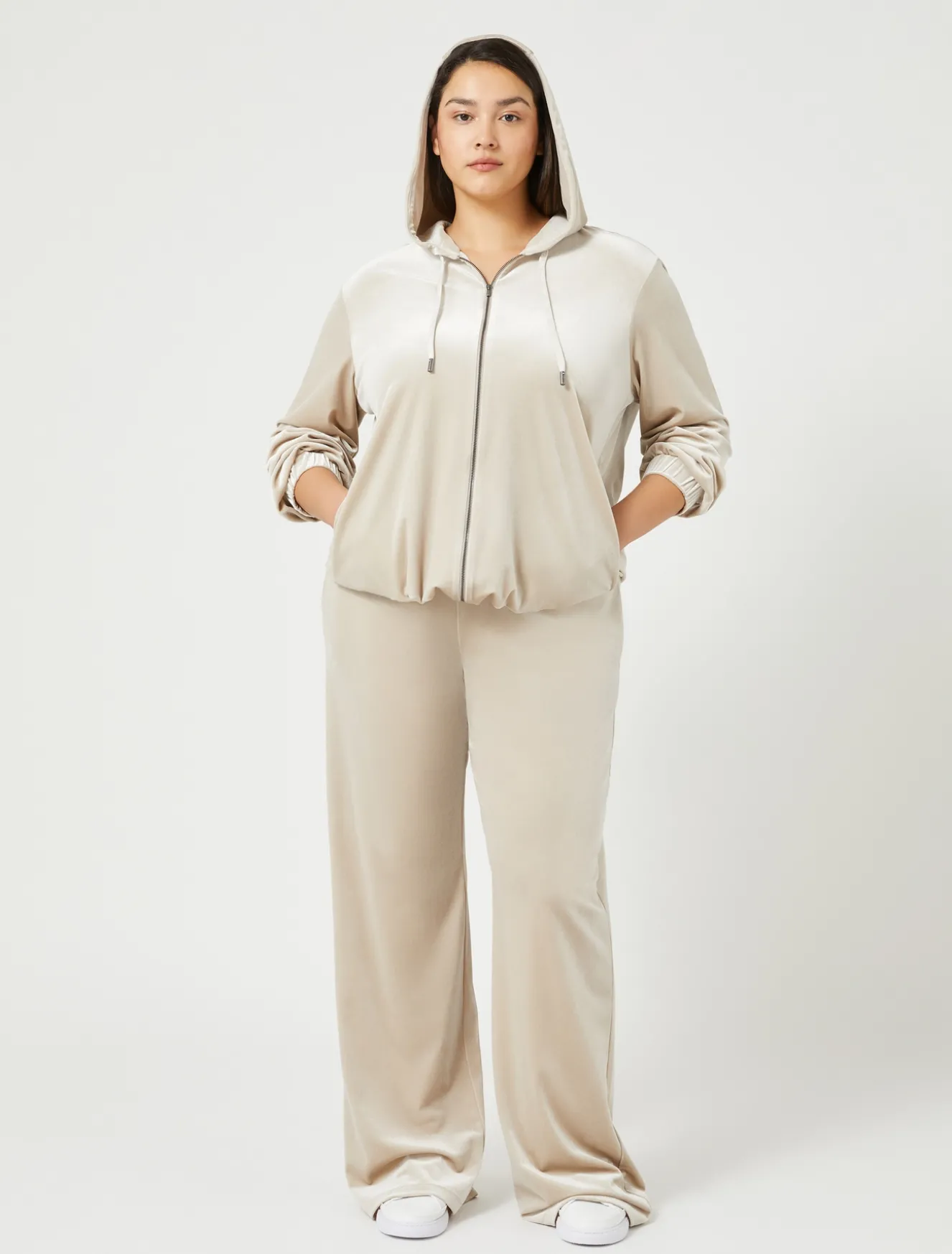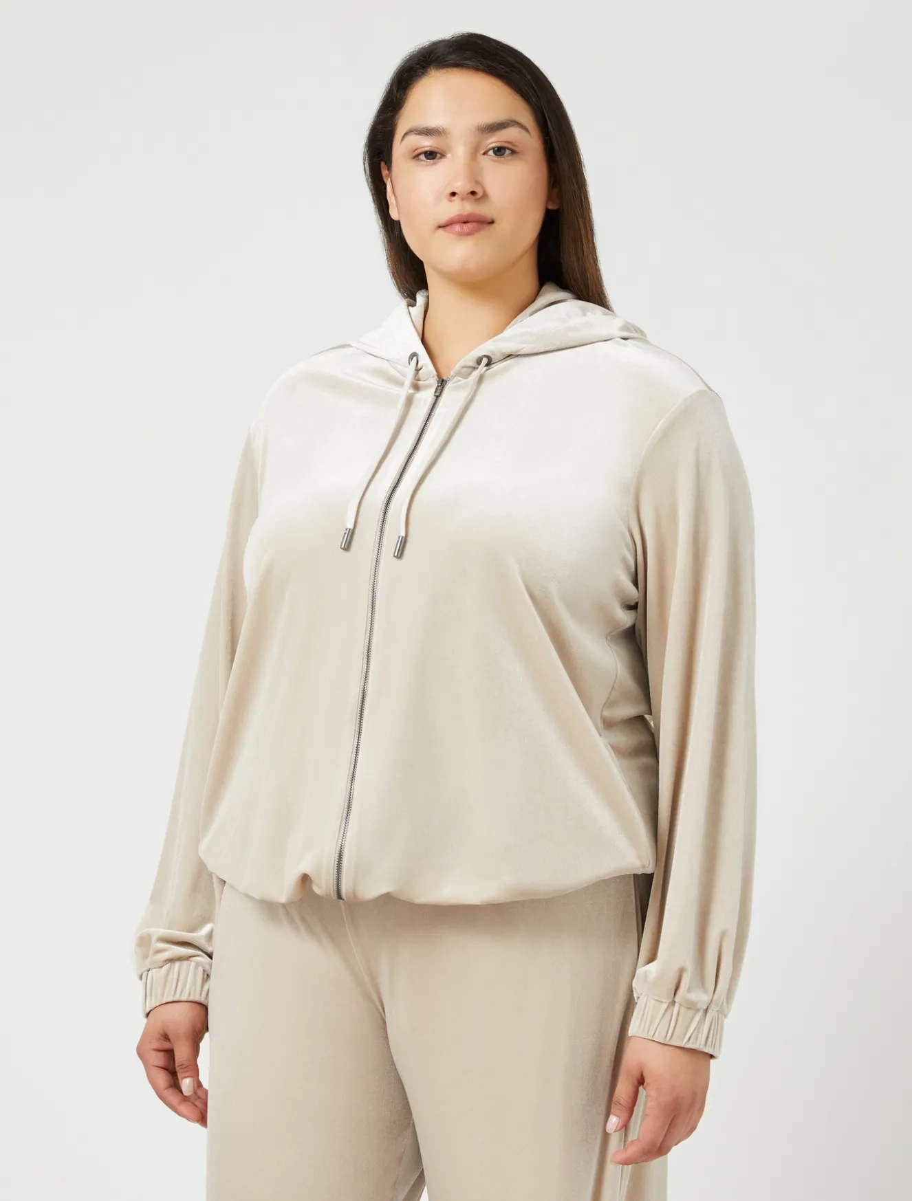 Super confortevole la giacca in ciniglia stretch di ispirazione jogging con cappuccio avvolgente e coulisse, maniche lunghe con elastico ai polsi, chiusura con zip.Il capo fa parte della collezione Persona by Marina Rinaldi.