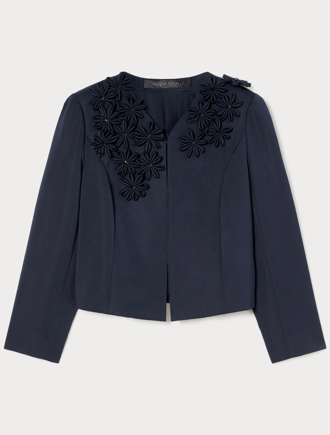 È impreziosita da applicazioni a mano di fiori in tessuto e jais al carré la giacca in duchesse, dalla linea semiaderente. Ricercata e ideale per le occasioni speciali.