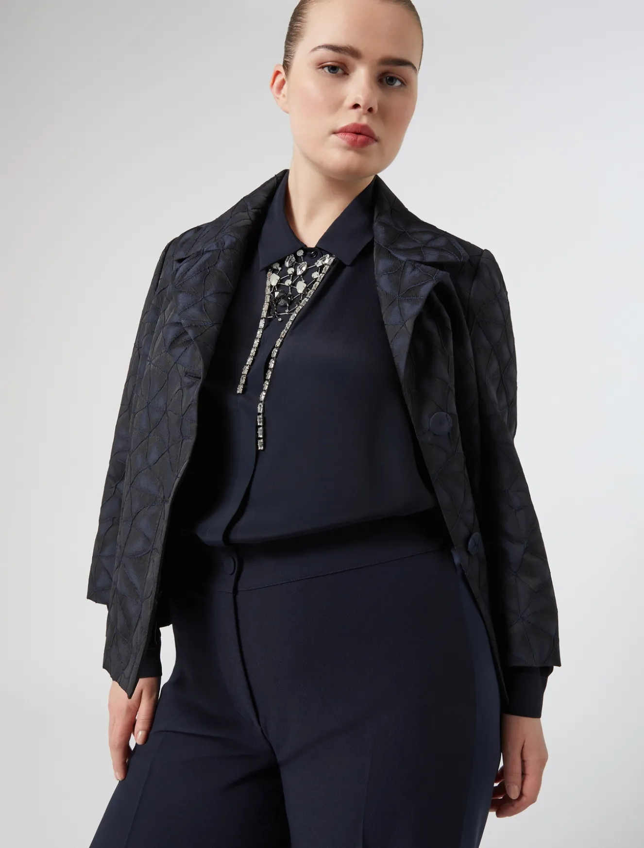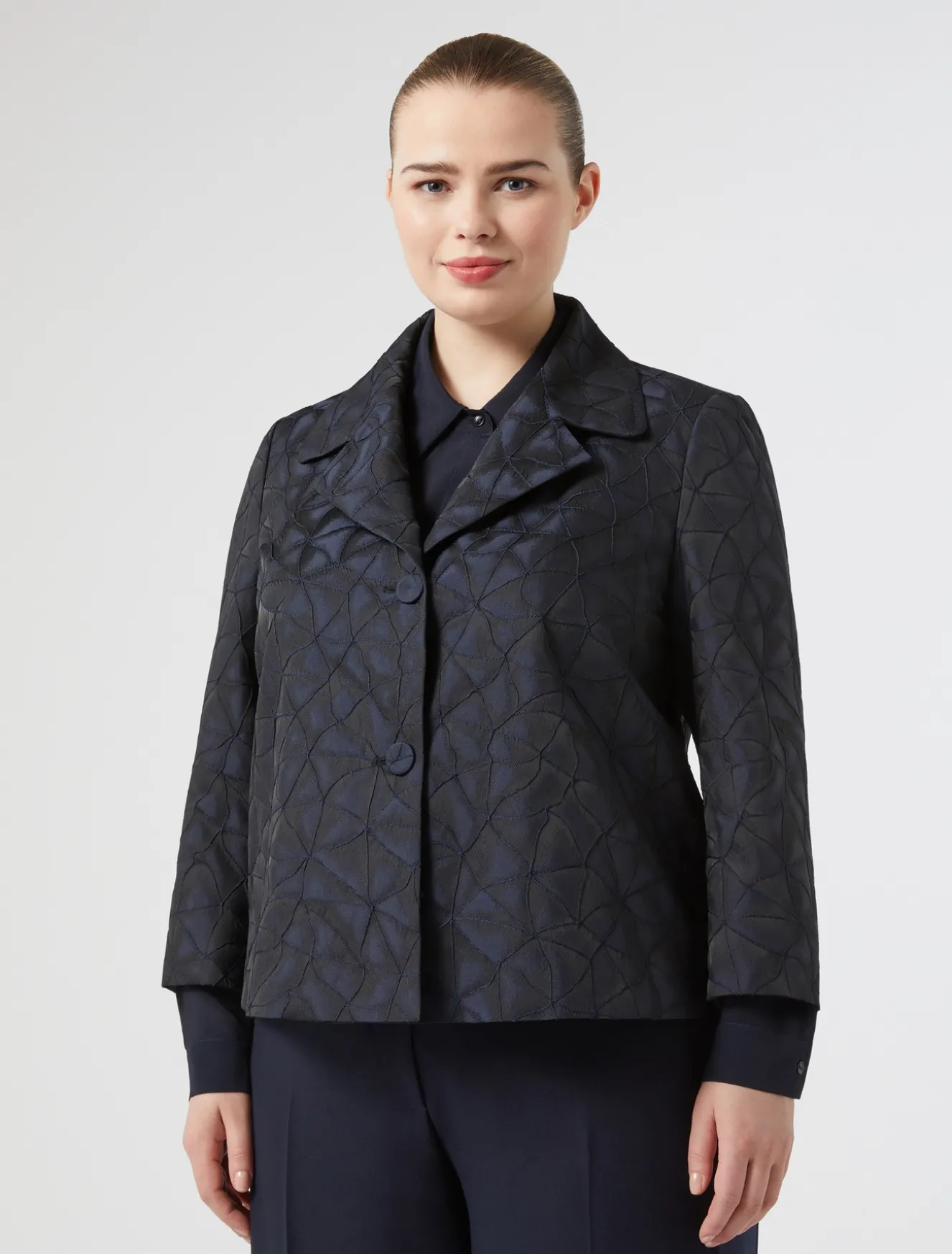 Dona un tocco grafico al tuo stile con la giacca in tessuto jacquard, dalla linea dritta. Ideale in look formali e daily.