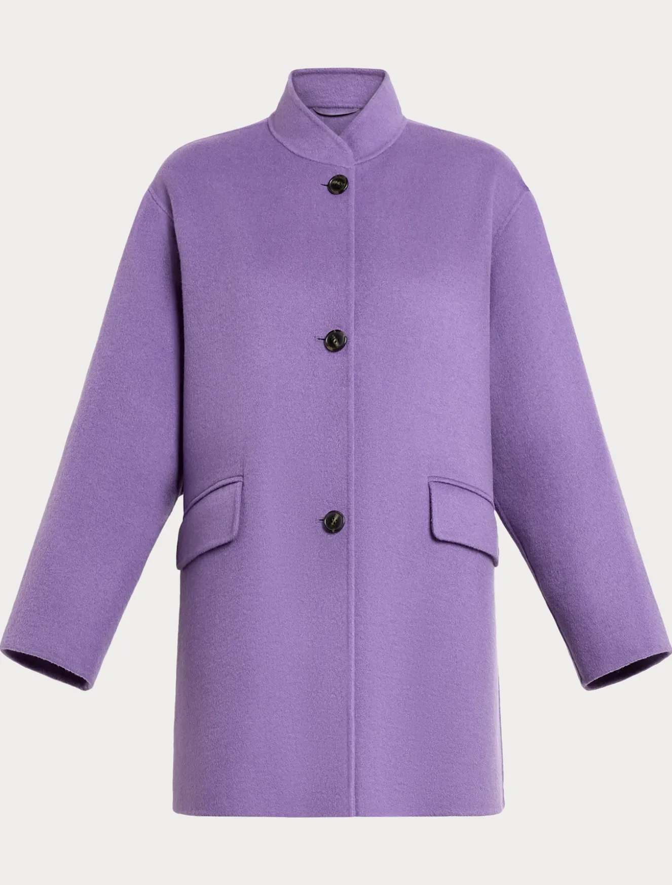 In città o in viaggio, sarà indispensabile il giaccone in double di lana cucito a mano con collo ad anello e maniche lunghe. Le tasche con patta regalano un tocco extra di comfort.Il capo fa parte della collezione Persona by Marina Rinaldi.