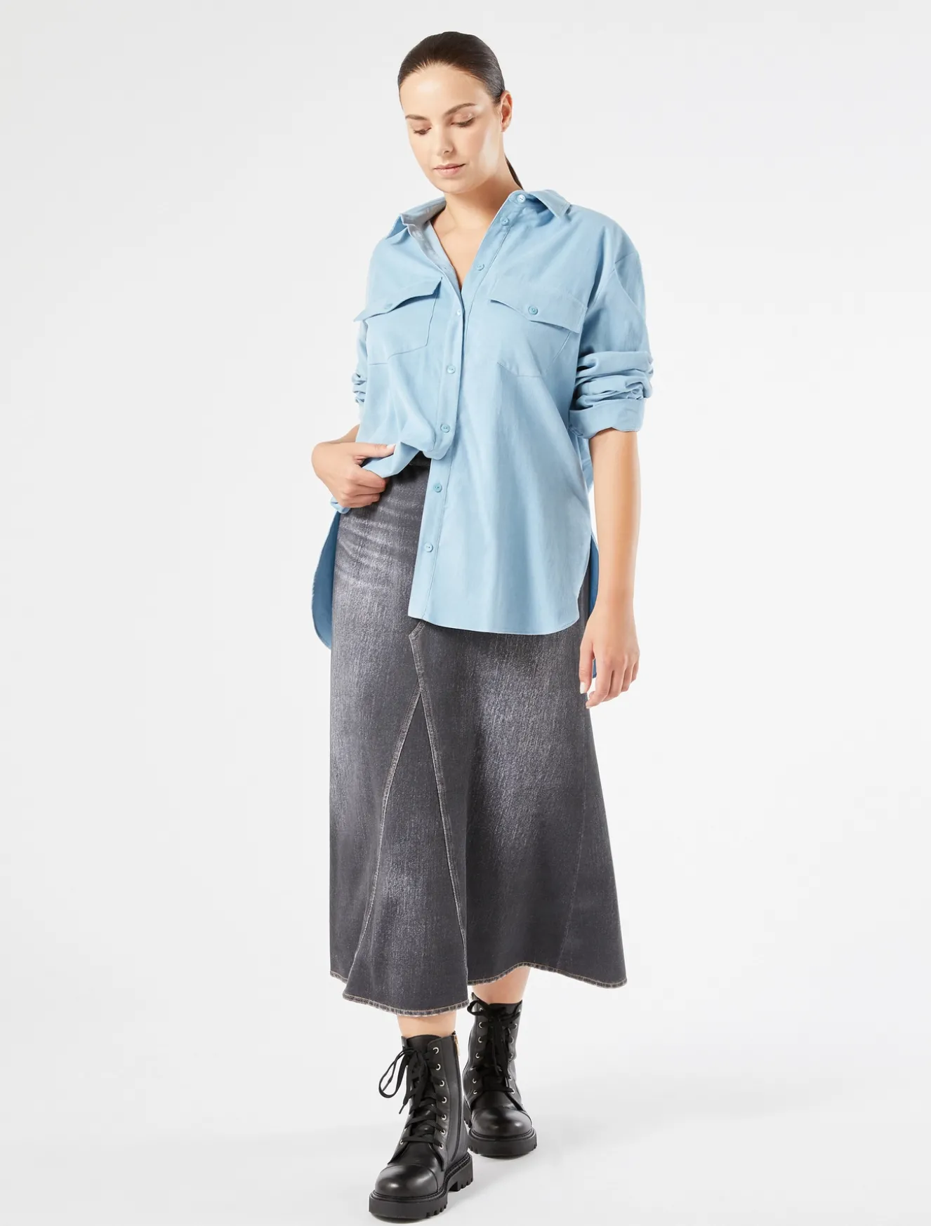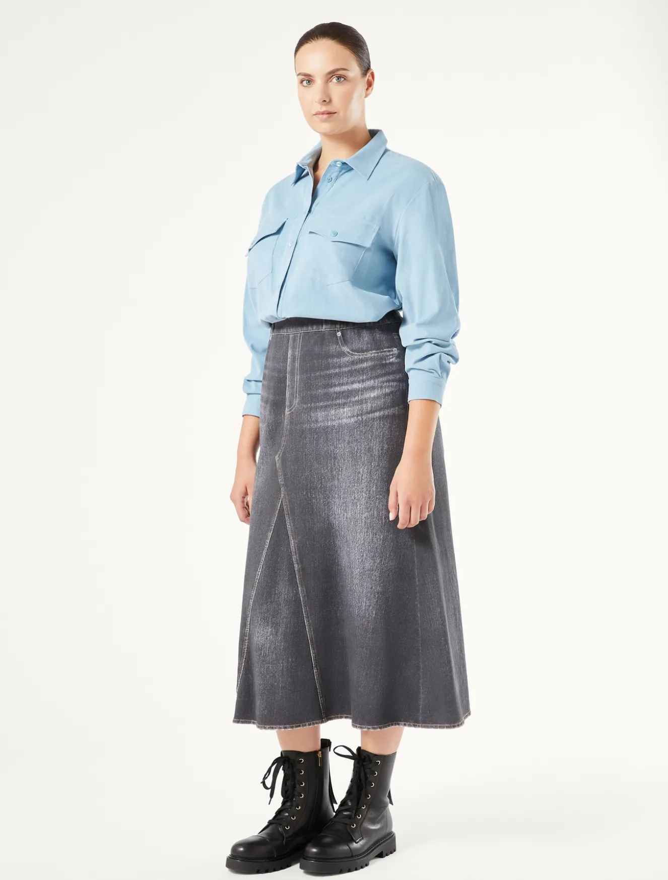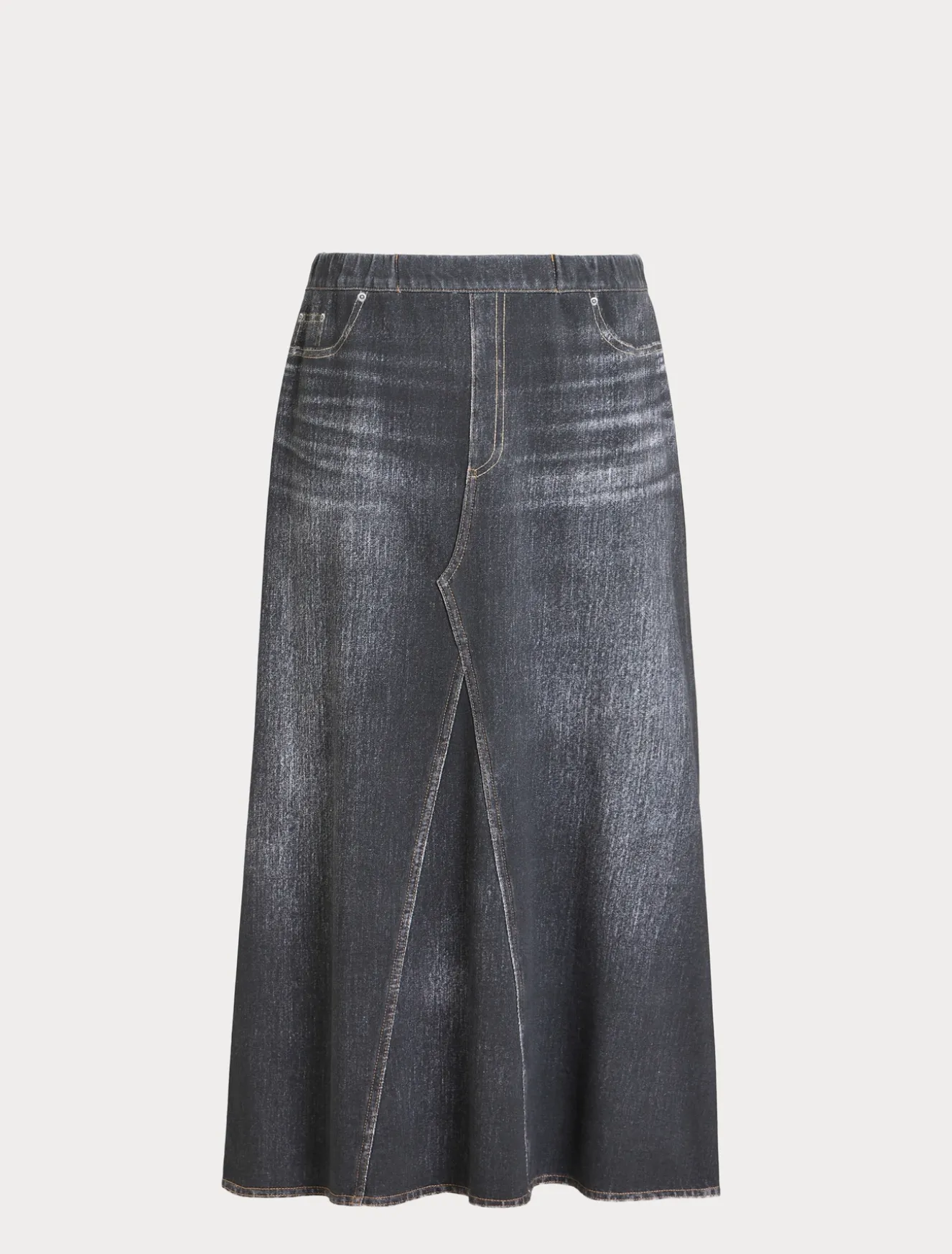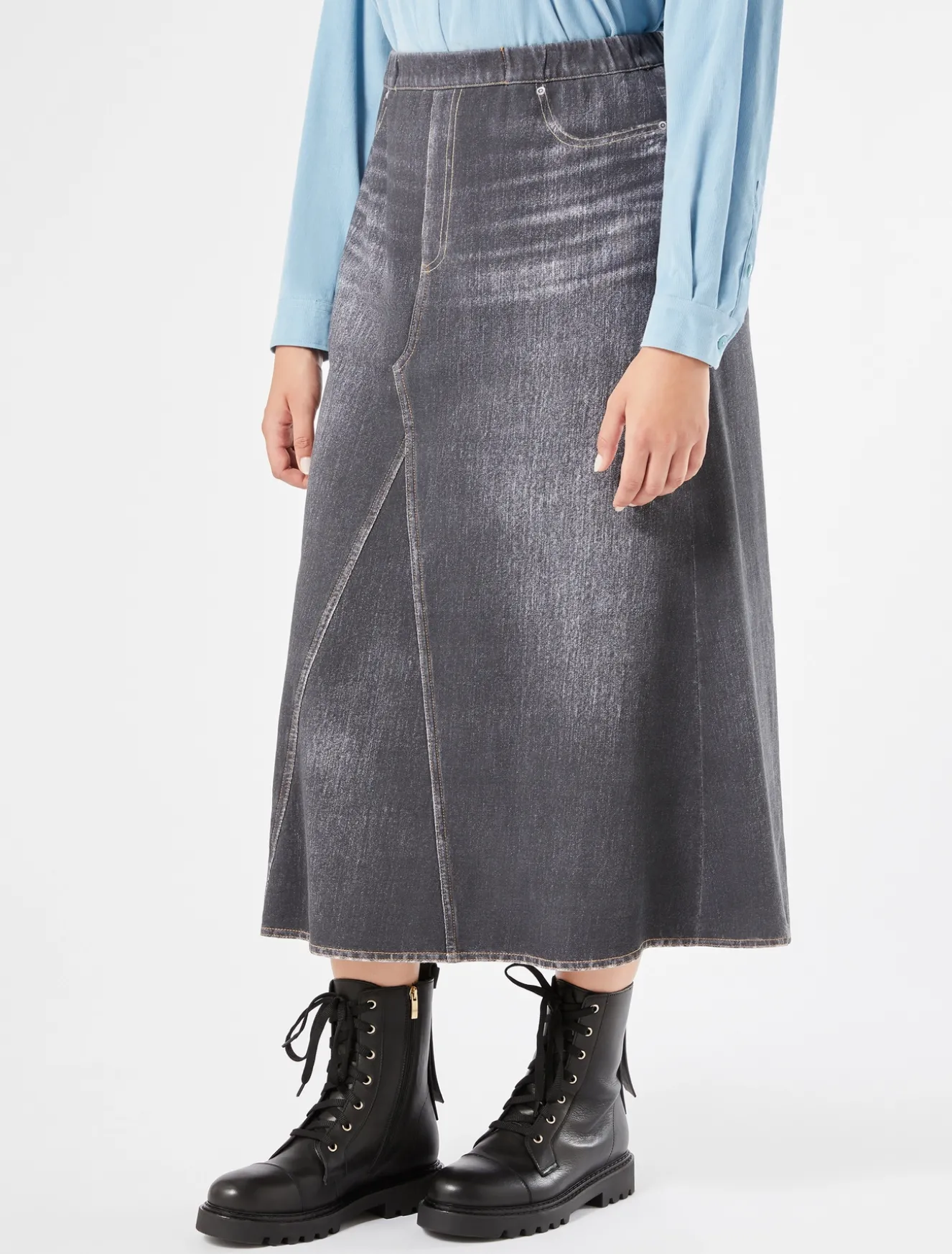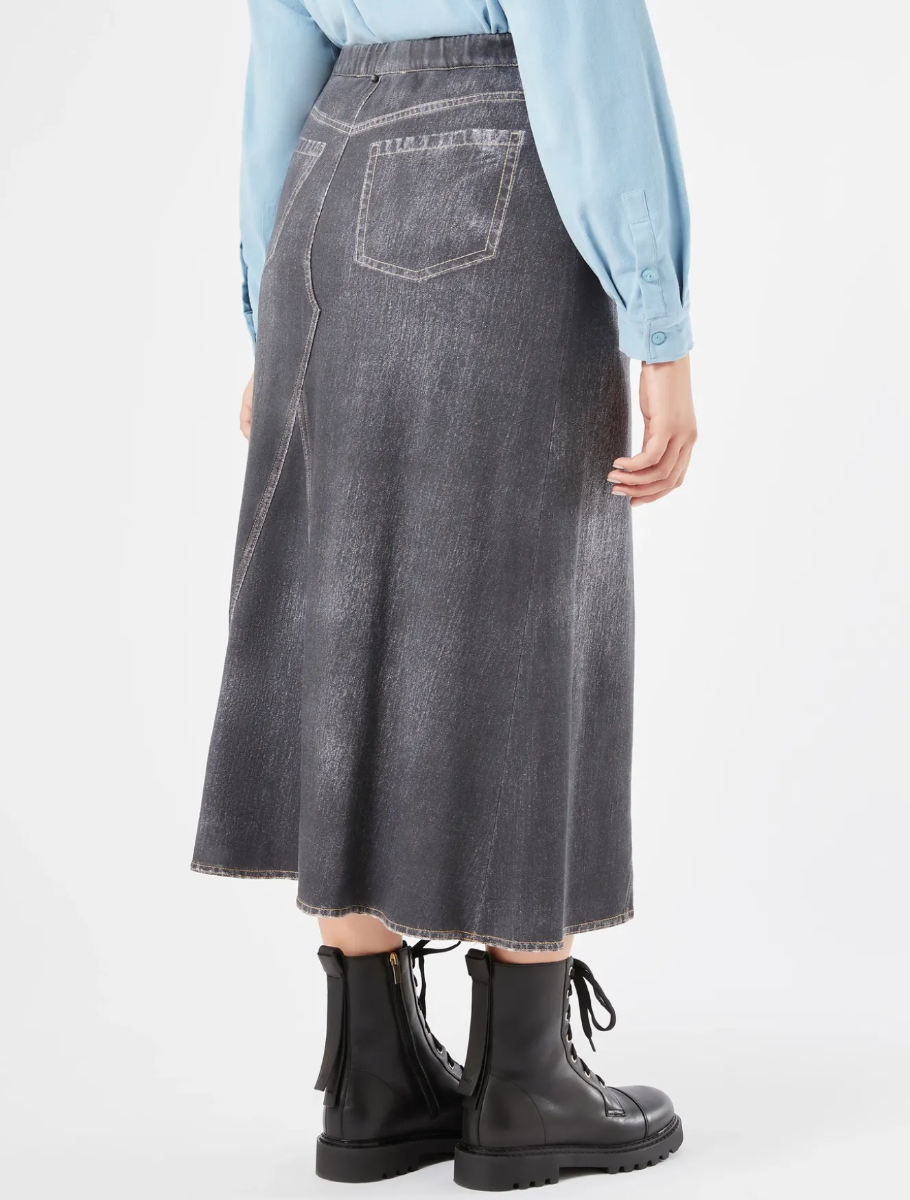 Effetto trompe l’oeil per la gonna in felpa di cotone con stampa che riproduce impunture e dettagli tipici del denim. Facile da indossare e abbinare, per rendere attuale lo stile.Il capo fa parte della collezione Marina Sport.