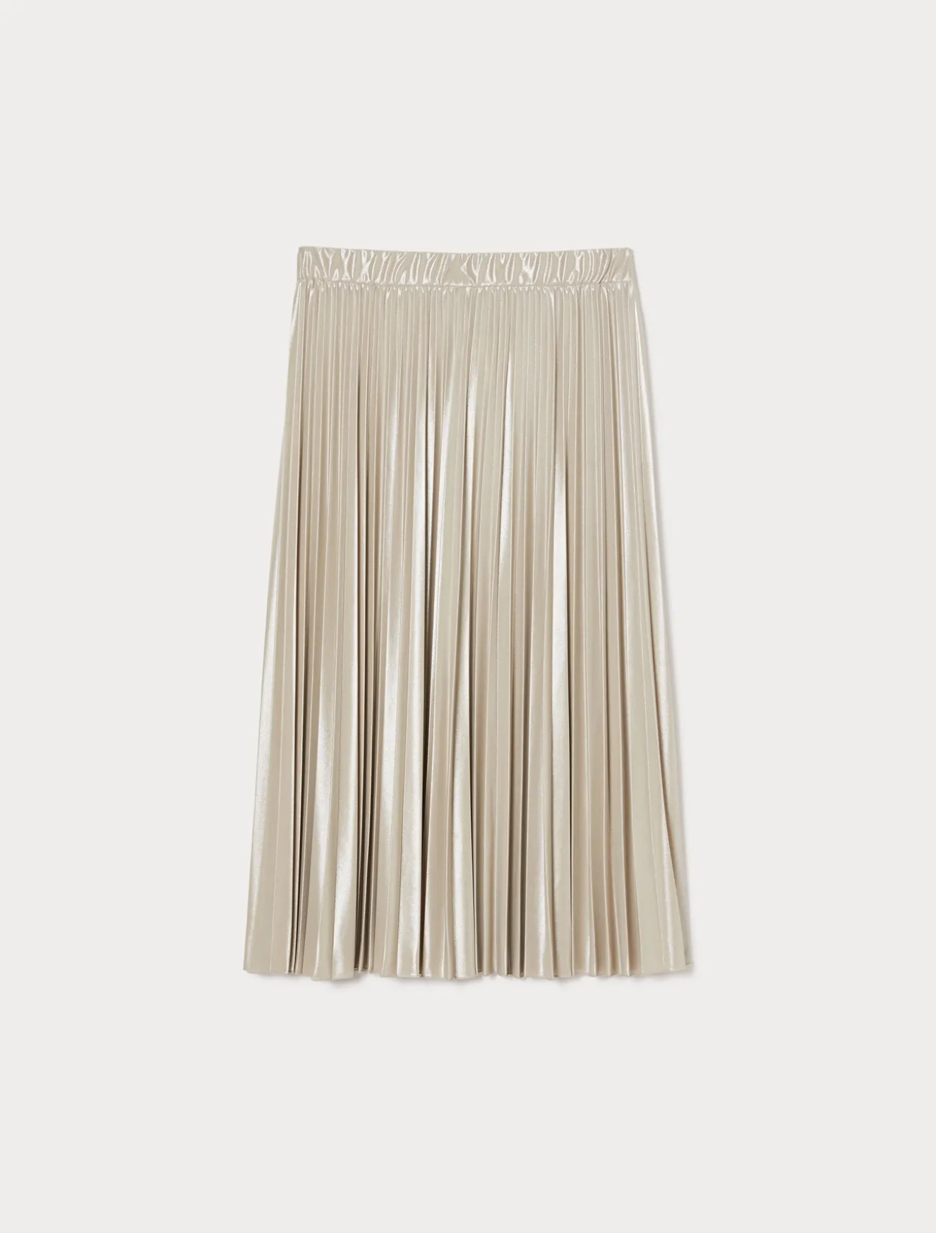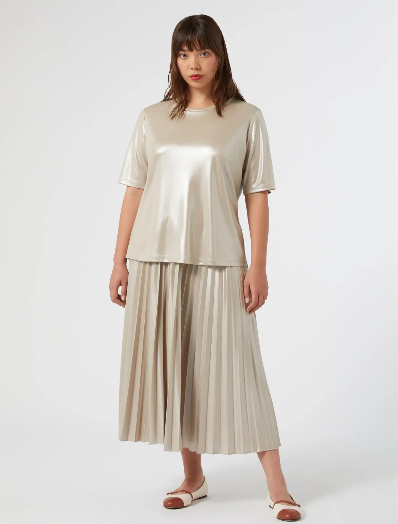 Lavorazione plissé per la gonna in jersey laminato con elastico in vita. Da indossare in un attimo, per elevare qualsiasi look.