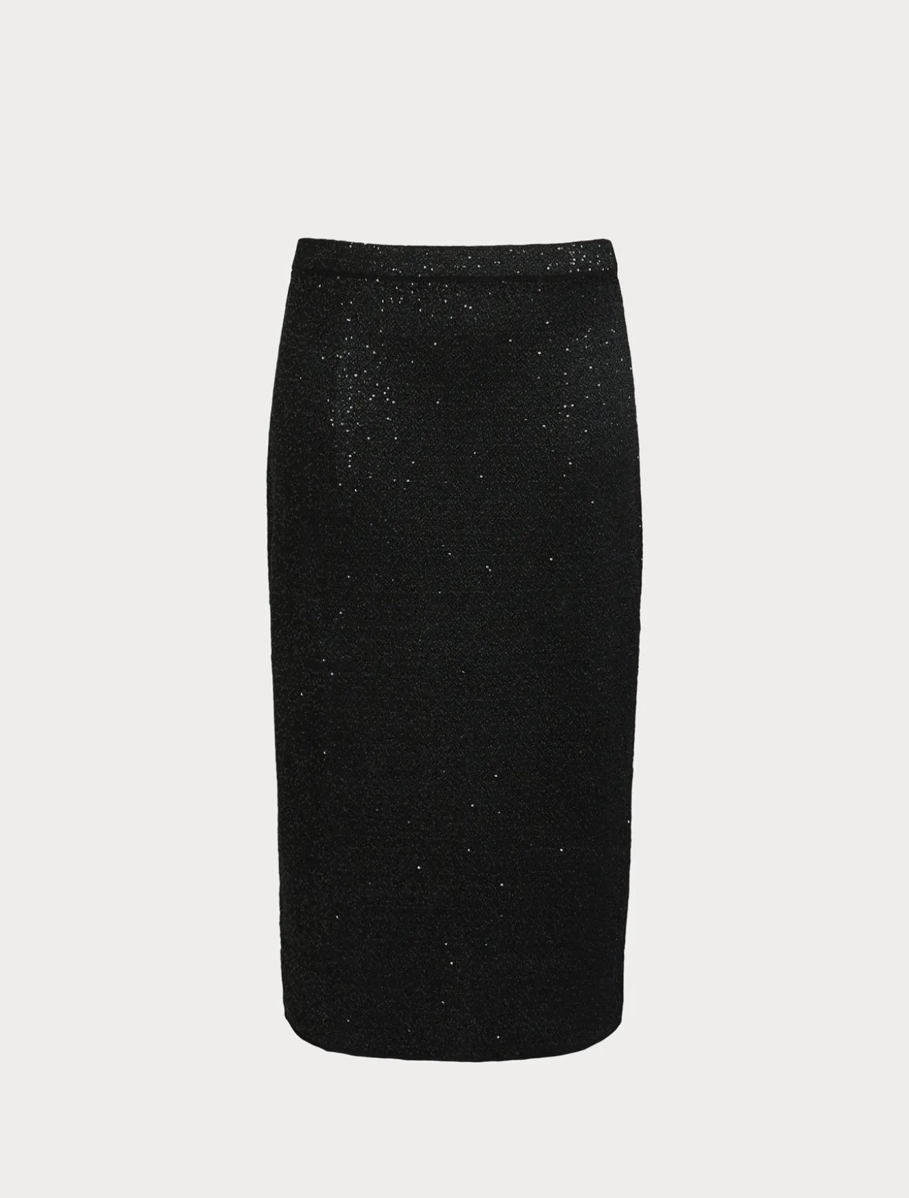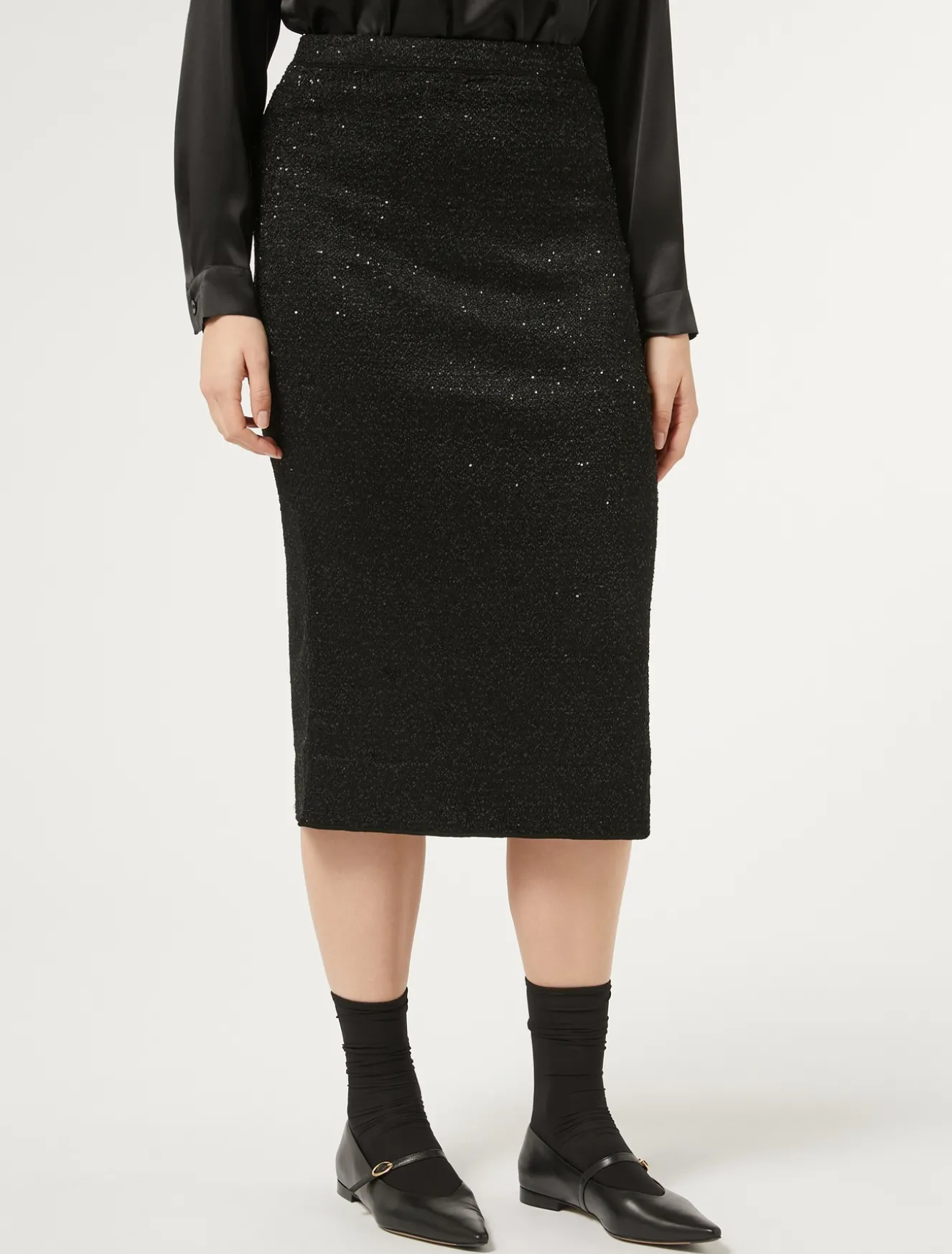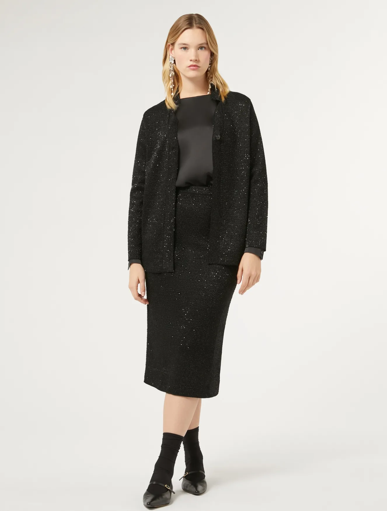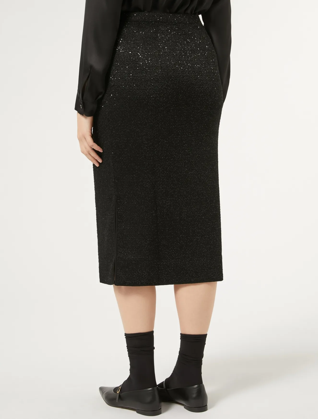 La gonna longuette in maglia è realizzata in filato di paillettes con interno in viscosa comfort. Base chic per una miriade di look, anche in abbinamento al cardigan in coordinato.Il capo fa parte della collezione Voyage.