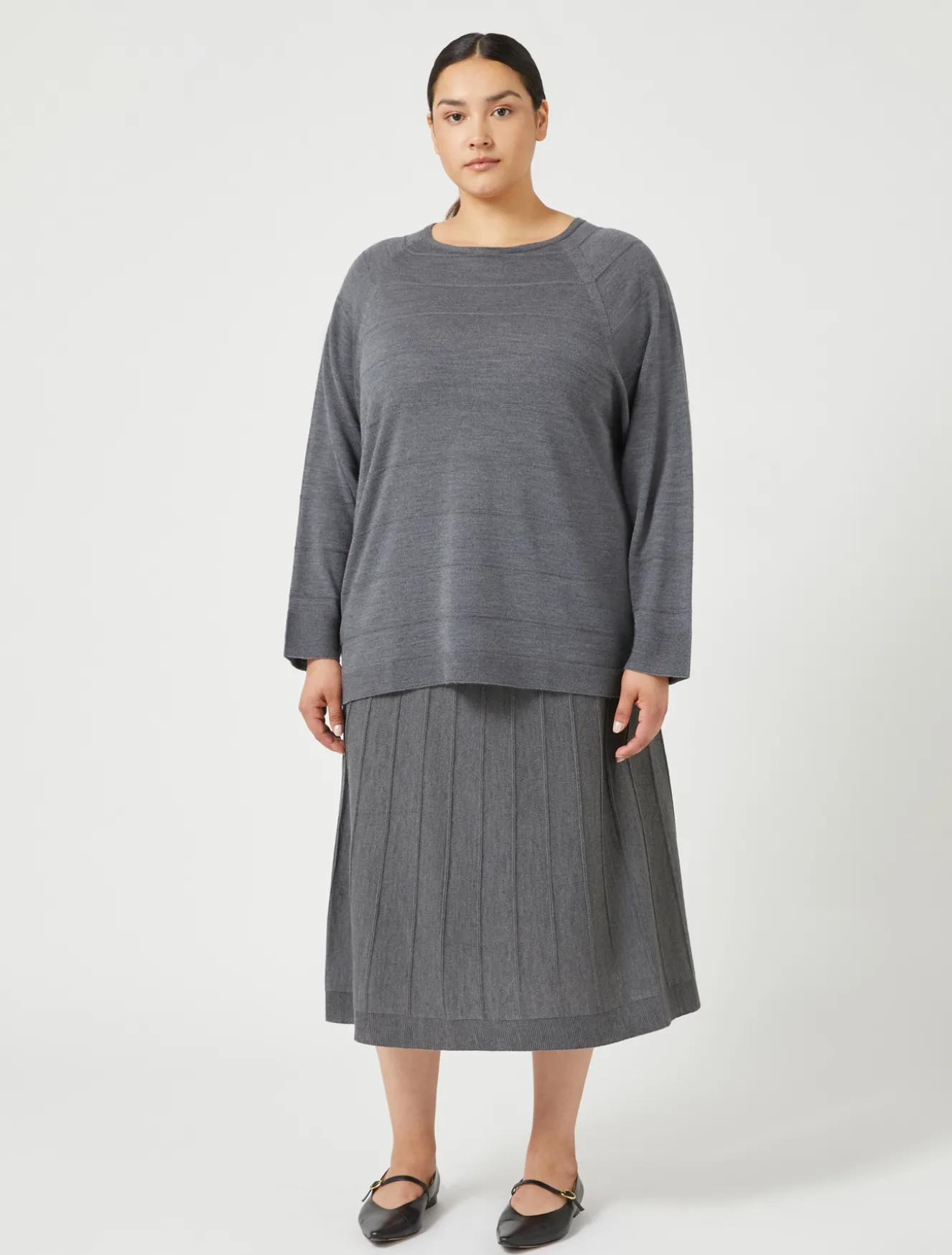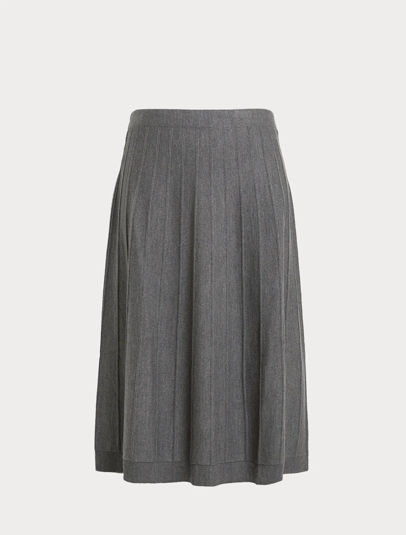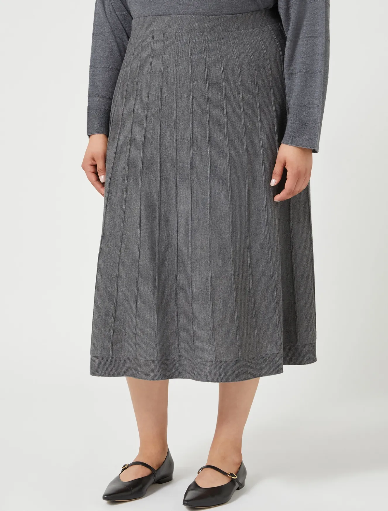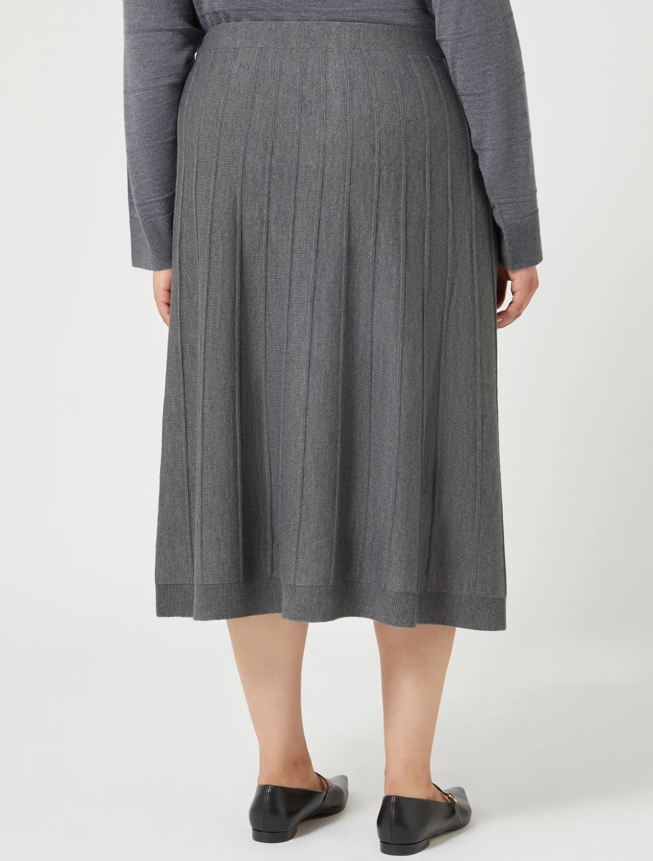 Da avere in guardaroba la gonna in misto lana merino rifinita con lavorazione a punto rasato con un motivo di punto links che crea righe verticali. La linea svasata è elegante e confortevole.Il capo fa parte della collezione Persona by Marina Rinaldi.