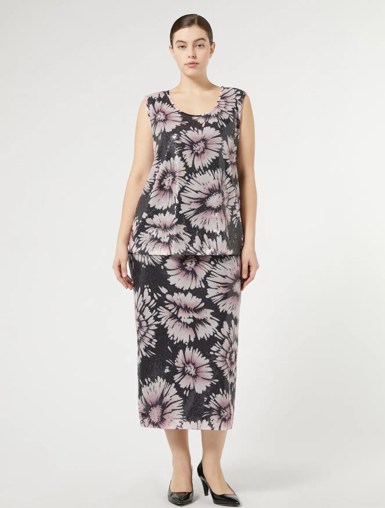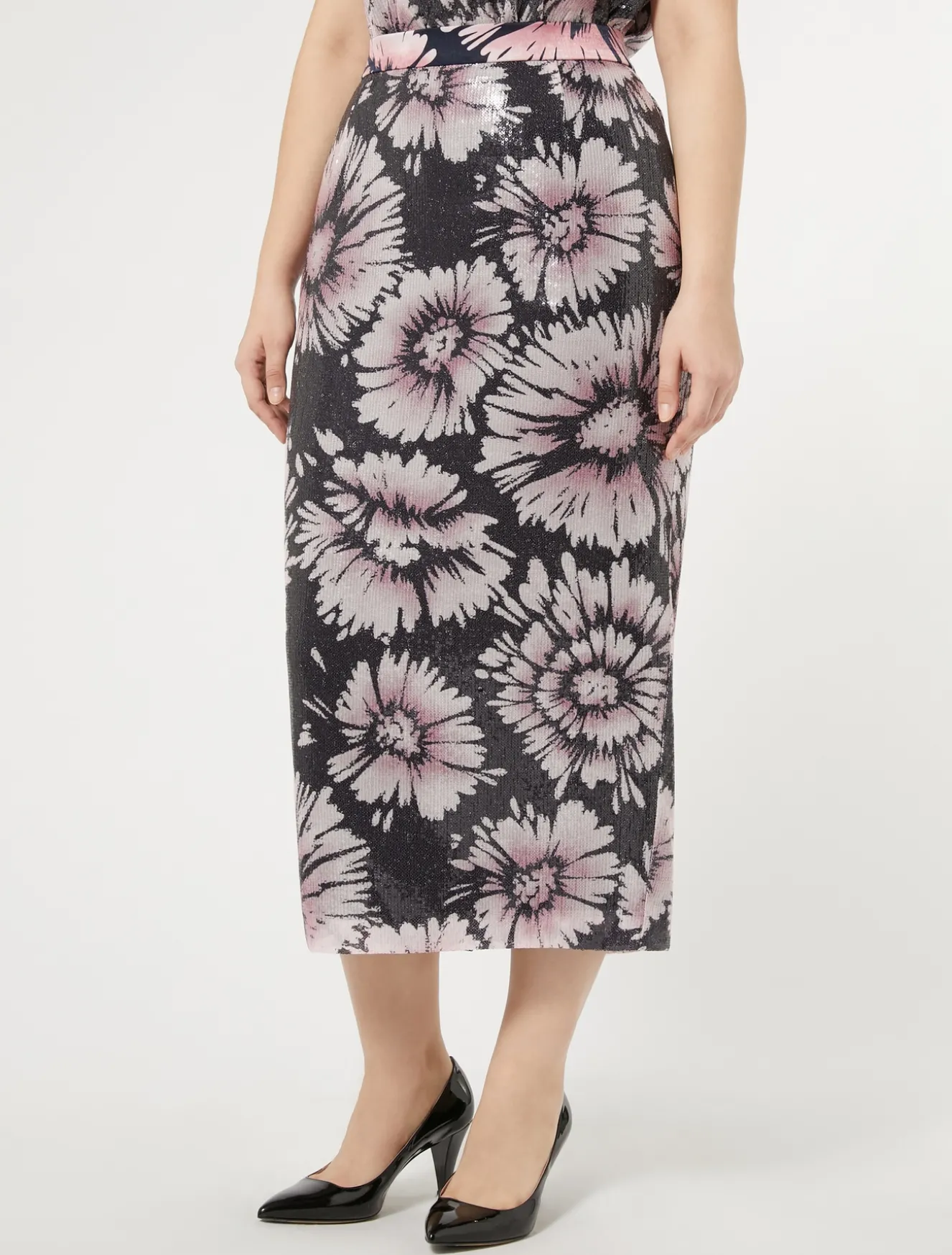 Texture stand-out per la gonna in paillettes e raso con linea a tubino e chiusura con zip e bottone sul retro. Punto vita in tessuto liscio senza paillettes per un comfort maggiore. Perfetta per il partywear e non solo.Il capo fa parte della collezione Persona by Marina Rinaldi.